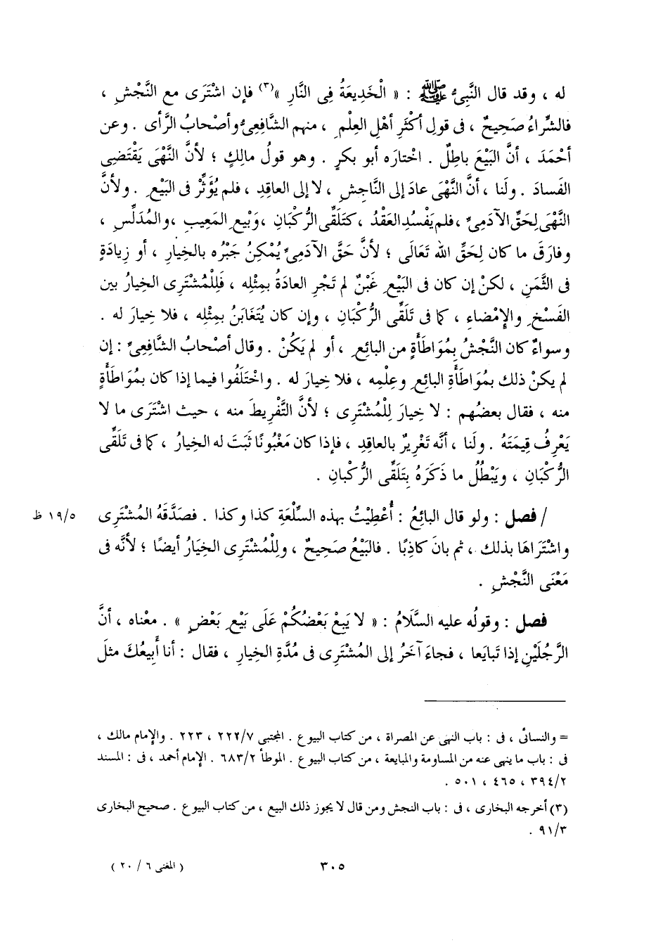 له، وقد قال النَّبِىُّ -صَلَّى اللهُ عَلَيْهِ وَسَلَّمَ-: "الْخَدِيعَةُ فِى النَّارِ" (٣) فإن اشْتَرَى مع النَّجْشِ، فالشِّراءُ صَحِيحٌ، فى قولِ أكْثَرِ أهْلِ العِلْمِ، منهم الشَّافِعِىُّ وأصْحابُ الرَّأى. وعن أحْمَدَ، أنَّ البَيْعَ باطِلٌ. اخْتارَه أبو بكرٍ. وهو قولُ مالِكٍ؛ لأنَّ النَّهْىَ يَقْتَضِى الفَسادَ. ولَنا، أنَّ النَّهْىَ عادَ إلى النَّاجِشِ، لا إلى العاقِدِ، فلم يُؤَثِّرْ فى البَيْعِ. ولأنَّ النَّهْىَ لِحَقِّ الآدَمِىِّ، فلم يَفْسُدِ العَقْدُ، كتَلَقِّى الرُّكْبَانِ، وَبَيْعِ المَعِيبِ، والمُدَلِّسِ، وفارَقَ ما كان لِحَقِّ اللَّه تَعَالَى؛ لأنَّ حَقَّ الآدَمِىِّ يُمْكِنُ جَبْرُه بالخِيارِ، أو زِيادَةٍ فى الثَّمَنِ، لكنْ إن كان فى البَيْعِ غَبْنٌ لم تَجْرِ العادَةُ بمِثْلِه، فَلِلْمُشْتَرِى الخِيارُ بين الفَسْخِ والإِمْضاءِ، كما فى تَلَقِّى الرُّكْبَانِ، وإن كان يُتَغَابَنُ بمِثْلِه، فلا خِيارَ له. وسواءٌ كان النَّجْشُ بمُوَاطَأةٍ من البائِعِ، أو لم يَكُنْ. وقال أصْحابُ الشَّافِعِىِّ: إن لم يكنْ ذلك بمُوَاطَأَةِ البائِعِ وعِلْمِه، فلا خِيارَ له. واخْتَلَفُوا فيما إذا كان بمُوَاطَأَةٍ منه، فقال بعضُهم: لا خِيارَ لِلْمُشْتَرِى؛ لأنَّ التَّفْرِيطَ منه، حيث اشْتَرَى ما لا يَعْرِفُ قِيمَتَهُ. ولَنا، أنَّه تَغْرِيرٌ بالعاقِدِ، فإذا كان مَغْبُونًا ثَبَتَ له الخِيارُ، كما فى تَلَقِّى الرُّكْبَانِ، ويَبْطُلُ ما ذَكَرَهُ بِتَلَقِّى الرُّكْبانِ.