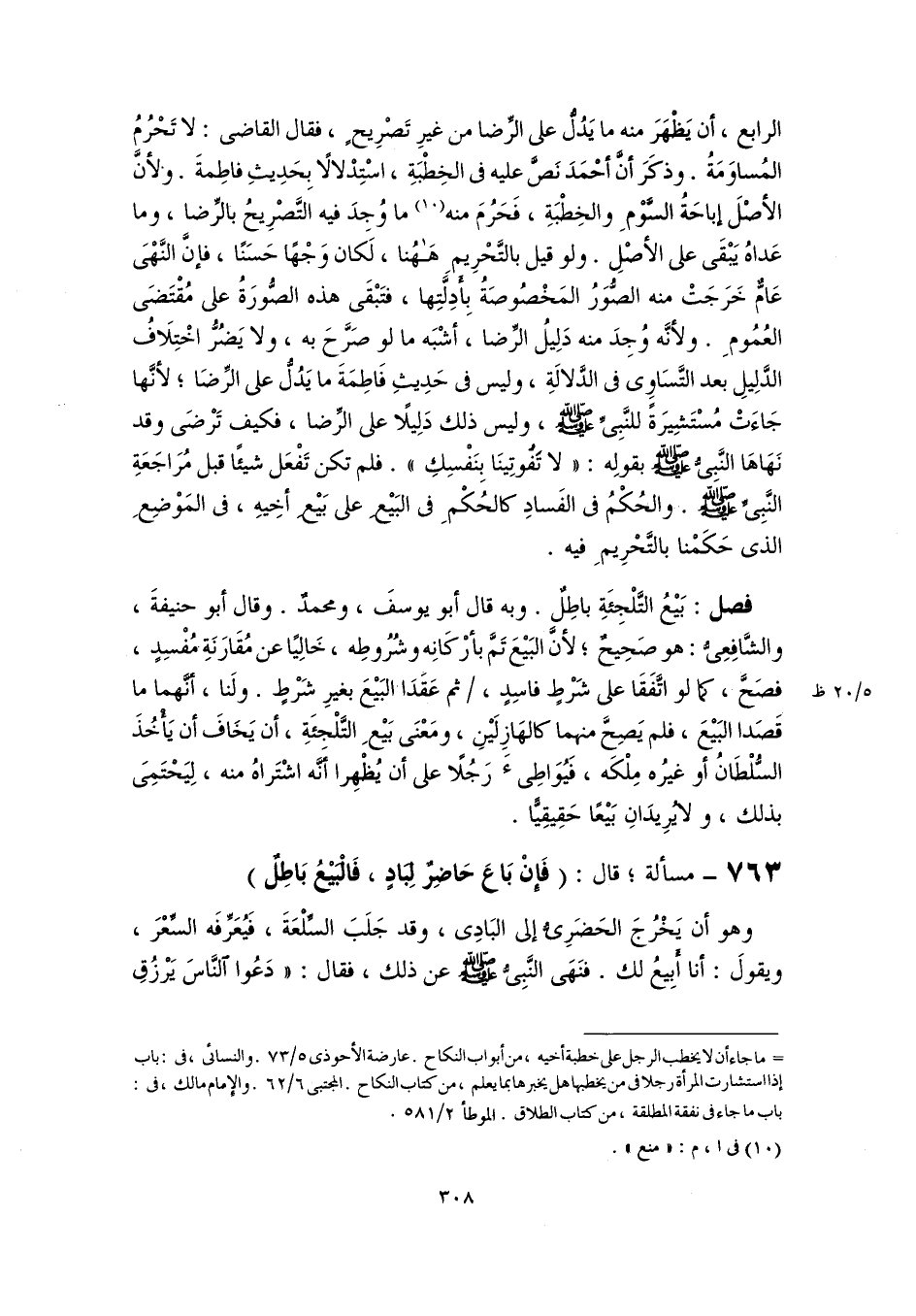 الرابع، أن يَظْهَرَ منه ما يَدُلُّ على الرِّضا من غيرِ تَصْرِيحٍ، فقال القاضى: لا تَحْرُمُ المُساوَمَةُ. وذكَرَ أنَّ أحْمَدَ نَصَّ عليه فى الخِطْبَةِ، اسْتِدْلالًا بِحَدِيثِ فاطِمةَ. ولأنَّ الأصْلَ إباحَةُ السَّوْمِ والخِطْبَةِ، فَحَرُمَ منه (١٠) ما وُجِدَ فيه التَّصْرِيحُ بالرِّضا، وما عَداهُ يَبْقَى على الأصْلِ. ولو قيل بالتَّحْرِيمِ هَاهُنا، لَكان وَجْهًا حَسَنًا، فإنَّ النَّهْىَ عَامٌّ خَرَجَتْ منه الصُّوَرُ المَخْصُوصَةُ بِأدِلَّتِها، فتَبْقَى هذه الصُّورَةُ على مُقْتَضَى العُمُومِ. ولأنَّه وُجِدَ منه دَلِيلُ الرِّضا، أشْبَه ما لو صَرَّحَ به، ولا يَضُرُّ اخْتِلَافُ الدَّلِيلِ بعد التَّسَاوِى فى الدَّلالَةِ، وليس فى حَدِيثِ فَاطِمَةَ ما يَدُلُّ على الرِّضَا؛ لأنَّها جَاءَتْ مُسْتَشِيرَةً للنَّبِىِّ -صَلَّى اللهُ عَلَيْهِ وَسَلَّمَ-، وليس ذلك دَلِيلًا على الرِّضا، فكيف تَرْضَى وقد نَهَاهَا النَّبِىُّ -صَلَّى اللهُ عَلَيْهِ وَسَلَّمَ- بقولِه: "لا تَفُوتِينَا بنَفْسِكِ". فلم تكن تَفْعَل شيئًا قبل مُرَاجَعَةِ النَّبِىِّ -صَلَّى اللهُ عَلَيْهِ وَسَلَّمَ-. والحُكْمُ فى الفَسادِ كالحُكْمِ فى البَيْعِ على بَيْعِ أخِيهِ، فى المَوْضِعِ الذى حَكَمْنا بالتَّحْرِيمِ فيه.