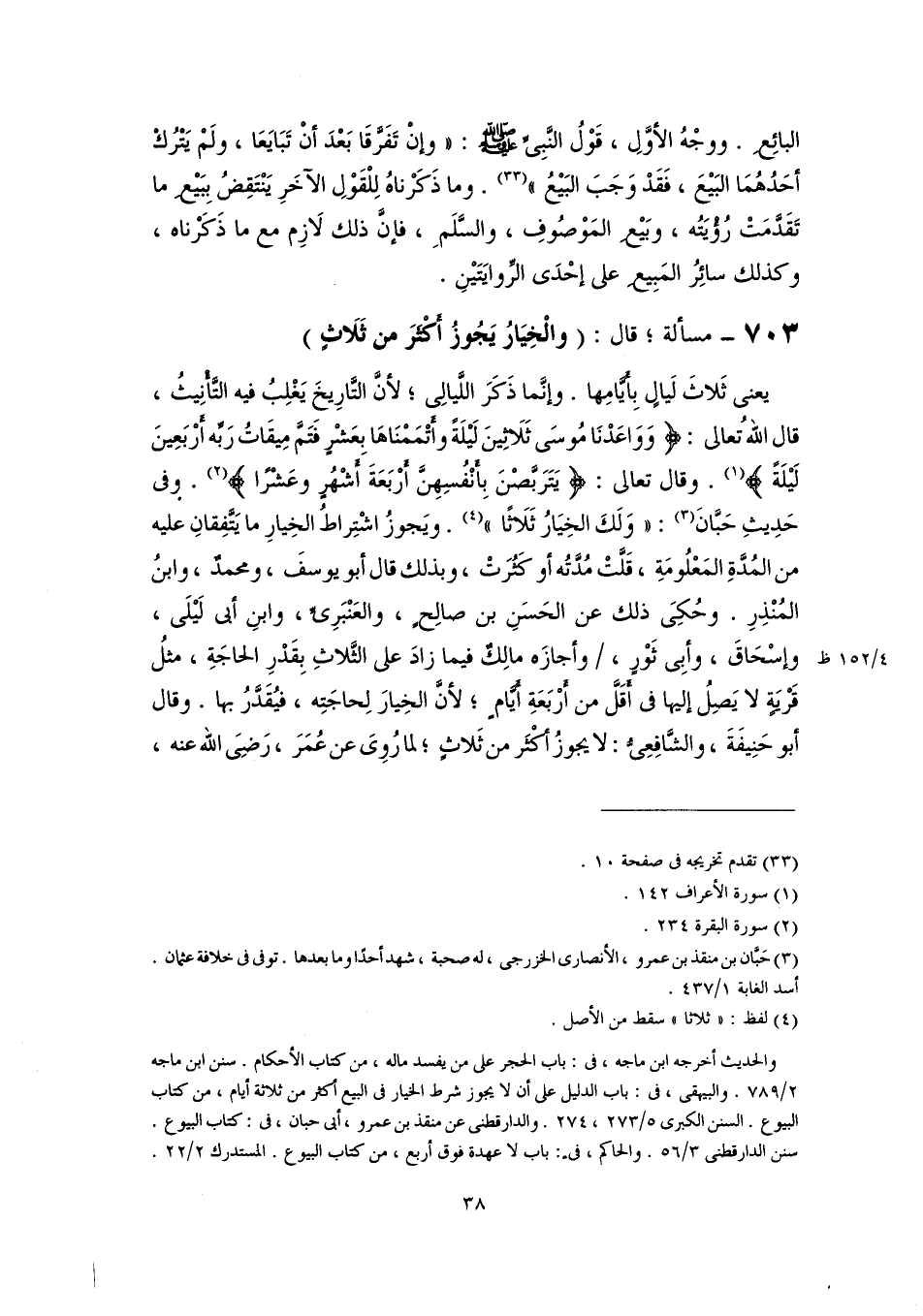 يعنى ثَلاثَ لَيالٍ بِأيَّامِها. وإنَّما ذَكَرَ اللَّيالِى؛ لأنَّ التَّارِيخَ يَغْلِبُ فيه التَّأْنِيثُ، قال اللهُ تعالى: {وَوَاعَدْنَا مُوسَى ثَلَاثِينَ لَيْلَةً وَأَتْمَمْنَاهَا بِعَشْرٍ فَتَمَّ مِيقَاتُ رَبِّهِ أَرْبَعِينَ لَيْلَةً} (١). وقال تعالى: {يَتَرَبَّصْنَ بِأَنْفُسِهِنَّ أَرْبَعَةَ أَشْهُرٍ وَعَشْرًا} (٢). وفى حَدِيثِ حَبَّانَ (٣): "وَلَكَ الخِيَارُ ثَلَاثًا" (٤). ويَجوزُ اشْتِراطُ الخِيارِ ما يَتَّفِقانِ عليه من المُدَّةِ المَعْلُومَةِ، قَلَّتْ مُدَّتُه أو كَثُرَتْ، وبذلك قال أبو يوسفَ، ومحمدٌ، وابنُ المُنْذِرِ. وحُكِىَ ذلك عن الحَسَنِ بن صالِحٍ، والعَنْبَرِىّ، وابنِ أبى لَيْلَى، وإسْحَاقَ، وأبِى ثَوْرٍ، وأجازَه مالِكٌ فيما زادَ على الثَّلاثِ بِقَدْرِ الحاجَةِ، مثلُ قَرْيَةٍ لا يَصِلُ إليها فى أقَلَّ من أرْبَعَةِ أيَّامٍ، لأنَّ الخِيارَ لِحاجَتِه، فيُقَدَّرُ بها. وقال أبو حَنِيفَةَ، والشَّافِعىُّ: لا يجوزُ أكْثَر من ثَلاثٍ؛ لما رُوِىَ عن عُمَرَ، رَضِىَ اللَّه عنه،