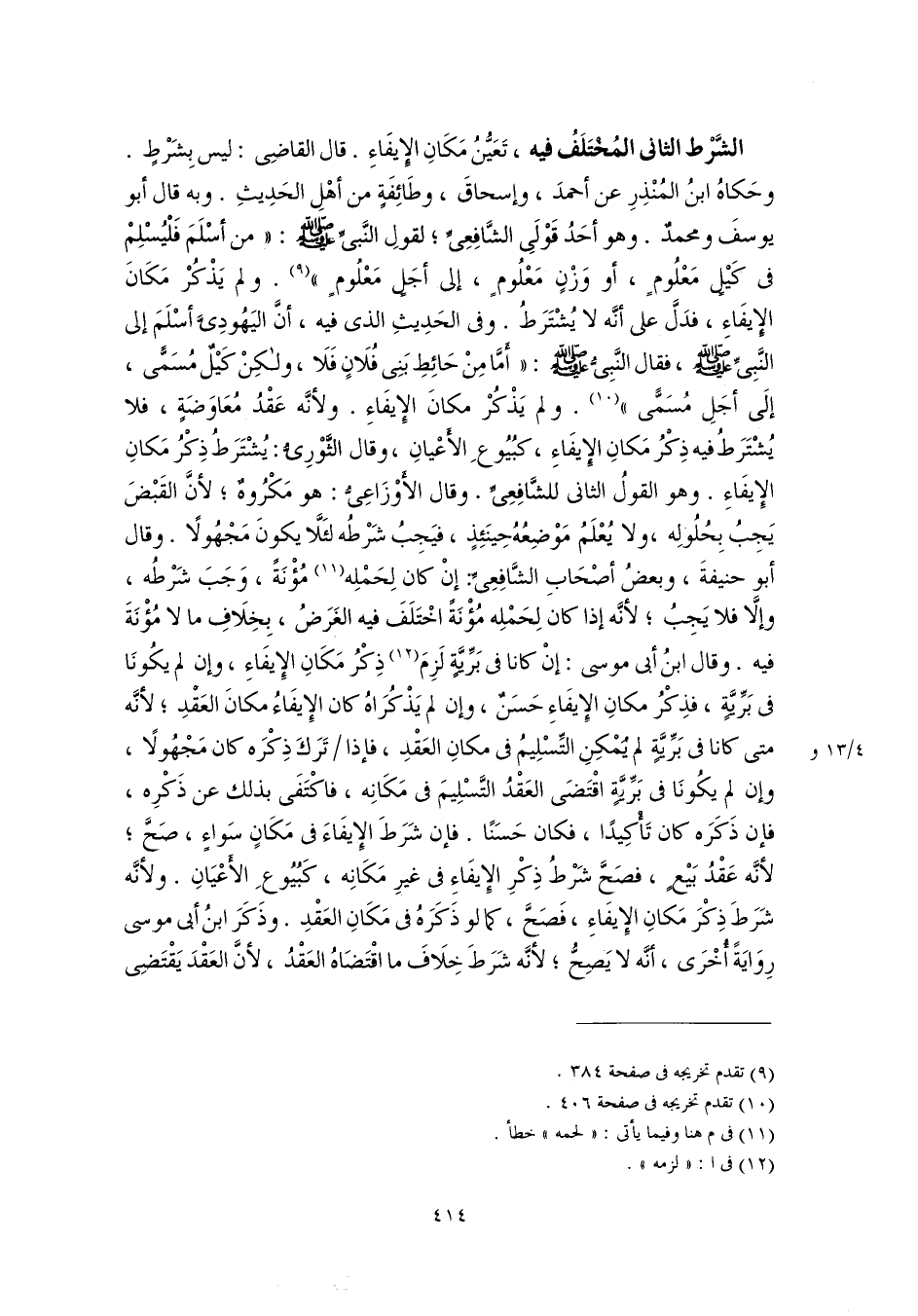 الشَّرْط الثاني المُخْتَلَفُ فيه، تَعَيُّنُ مَكَانِ الإِيفَاءِ. قال القاضِى: ليس بِشَرْطٍ. وحَكاهُ ابنُ المُنْذِرِ عن أحمدَ، وإسحاقَ، وطَائِفَةٍ من أهْلِ الحَدِيثِ. وبه قال أبو يوسفَ ومحمدٌ. وهو أحَدُ قَوْلَىِ الشَّافِعِيِّ؛ لقولِ النَّبيِّ -صَلَّى اللهُ عَلَيْهِ وَسَلَّمَ-: "من أسْلَمَ فَلْيُسْلِمْ في كَيْلٍ مَعْلُومٍ، أو وَزْنٍ مَعْلُومٍ، إلى أجَلٍ مَعْلُومٍ" (٩). ولم يَذْكُرْ مَكَانَ الإِيفَاءِ، فدَلَّ على أنَّه لا يُشْتَرَطُ. وفى الحَدِيثِ الذي فيه، أنَّ اليَهُودِيَّ أسْلَمَ إلى النَّبِيِّ -صَلَّى اللهُ عَلَيْهِ وَسَلَّمَ-، فقال النَّبِيُّ -صَلَّى اللهُ عَلَيْهِ وَسَلَّمَ-: "أَمَّا مِنْ حَائِطِ بَنِى فُلَانٍ فَلَا، ولكِنْ كَيْلٌ مُسَمًّى، إلَى أجَلِ مُسَمًّى" (١٠). ولم يَذْكُرْ مكانَ الإِيفَاءِ. ولأنَّه عَقْدُ مُعَاوَضَةٍ، فلا يُشْتَرَطُ فيه ذِكْرُ مَكانِ الإِيفَاءِ، كبُيُوعِ الأَعْيانِ، وقال الثَّوْرِيُّ: يُشْتَرَطُ ذِكْرُ مَكانِ الإِيفَاءِ. وهو القولُ الثانى للشَّافِعِيِّ. وقال الأَوْزَاعِيُّ: هو مَكْرُوهٌ؛ لأنَّ القَبْضَ يَجِبُ بِحُلُولِه، ولا يُعْلَمُ مَوْضِعُهُ حِينَئِذٍ، فيَجِبُ شَرْطُه لئَلَّا يكونَ مَجْهُولًا. وقال أبو حنيفةَ، وبعضُ أصْحَابِ الشَّافِعِيِّ: إنْ كان لِحَمْلِه (١١) مُؤْنَةً، وَجَبَ شَرْطُه، وإلَّا فلا يَجِبُ؛ لأنَّه إذا كان لِحَمْلِه مُؤْنَةً اخْتَلَفَ فيه الغَرَضُ، بِخِلَافِ ما لا مُؤْنَةَ فيه. وقال ابنُ أبي موسى: إنْ كانا في بَرِّيَّةٍ لَزِمَ (١٢) ذِكْرُ مَكَانِ الإِيفَاءِ، وإن لم يكُونَا في بَرِّيَّةٍ، فذِكْرُ مكانِ الإِيفَاءِ حَسَنٌ، وإن لم يَذْكُرَاهُ كان الإِيفَاءُ مكانَ العَقْدِ؛ لأنَّه متى كانا في بَرِّيَّةٍ لم يُمْكِنِ التَّسْلِيمُ في مكانِ العَقْدِ، فإذا تَرَكَ ذِكْرَه كان مَجْهُولًا، وإن لم يكُونَا في بَرِّيَّةٍ اقْتَضَى العَقْدُ التَّسْلِيمَ في مَكَانِه، فاكْتَفَى بذلك عن ذكْرِه، فإن ذَكَرَه كان تَأْكِيدًا، فكان حَسَنًا. فإن شَرَطَ الإِيفَاءَ في مَكَانٍ سَواءٍ، صَحَّ؛ لأنَّه عَقْدُ بَيْعٍ، فصَحَّ شَرْطُ ذِكْرِ الإِيفَاءِ في غيرِ مَكَانِه، كَبُيُوعِ الأَعْيَانِ. ولأنَّه شَرَطَ ذِكْرَ مَكانِ الإِيفَاءِ، فَصَحَّ، كما لو ذَكَرَهُ في مَكَانِ العَقْدِ. وذَكَرَ ابنُ أبى موسى رِوَايَةً أُخْرَى، أنَّه لا يَصِحُّ؛ لأنَّه شَرَطَ خِلَافَ ما اقْتَضَاهُ العَقْدُ، لأنَّ العَقْدَ يَقْتَضِى
