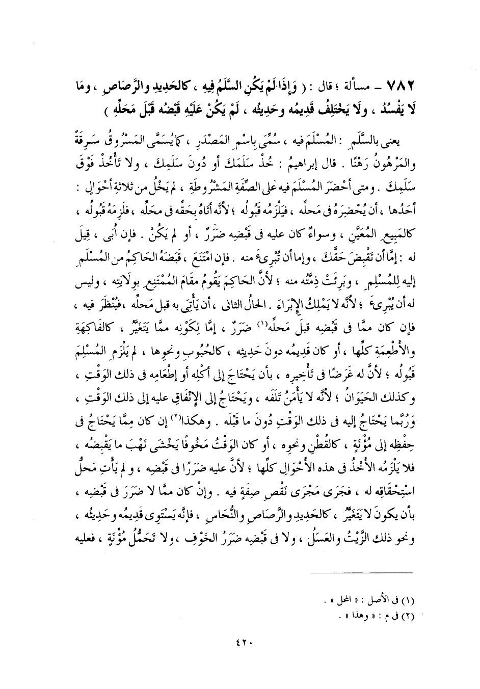 ٧٨٢ - مسألة؛ قال: (وَإِذَا لَمْ يَكُنِ السَّلَمُ فِيهِ، كالحَدِيدِ والرَّصَاصِ، ومَا لَا يَفْسُدُ، ولَا يَخْتَلِفُ قَدِيمُه وحَدِيثُه، لَمْ يَكُنْ عَلَيْهِ قَبْضُه قَبْلَ مَحَلِّهِ)