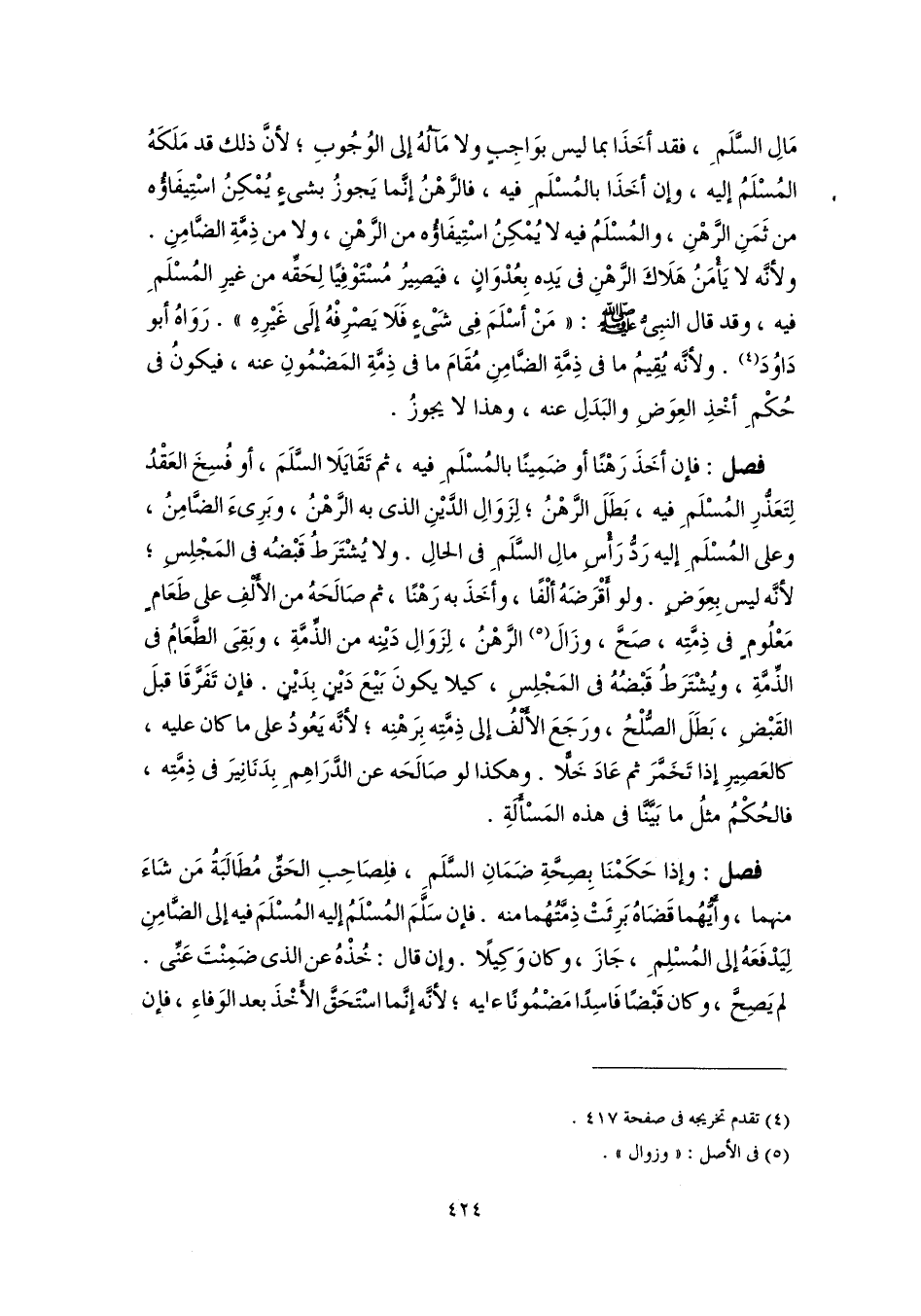 مَالِ السَّلَمِ، فقد أخَذَا بما ليس بوَاجِبٍ ولا مَآلُهُ إلى الوُجُوبِ؛ لأنَّ ذلك قد مَلَكَهُ المُسْلَمُ إليه، وإن أخَذَا بالمُسْلَمِ فيه، فالرَّهْنُ إنَّما يَجوزُ بشىءٍ يُمْكِنُ اسْتِيفَاؤُه من ثَمَنِ الرَّهْنِ، والمُسْلَمُ فيه لا يُمْكِنُ اسْتِيفَاؤُه من الرَّهْنِ، ولا من ذِمَّةِ الضَّامِنِ. ولأنَّه لا يَأْمَنُ هَلَاكَ الرَّهْنِ فى يَدِه بِعُدْوَانٍ، فيَصِيرُ مُسْتَوْفِيًا لِحَقِّه من غيرِ المُسْلَمِ فيه، وقد قال النبِىُّ -صَلَّى اللهُ عَلَيْهِ وَسَلَّمَ-: "مَنْ أَسْلَمَ فِى شَىْءٍ فَلَا يَصْرِفْهُ إلَى غَيْرِهِ". رَوَاهُ أبو دَاوُدَ (٤). ولأنَّه يُقِيمُ ما فى ذِمَّةِ الضَّامِنِ مُقَامَ ما فى ذِمَّةِ المَضْمُونِ عنه، فيكونُ فى حُكْمِ أخْذِ العِوَضِ والبَدَلِ عنه، وهذا لا يجوزُ.