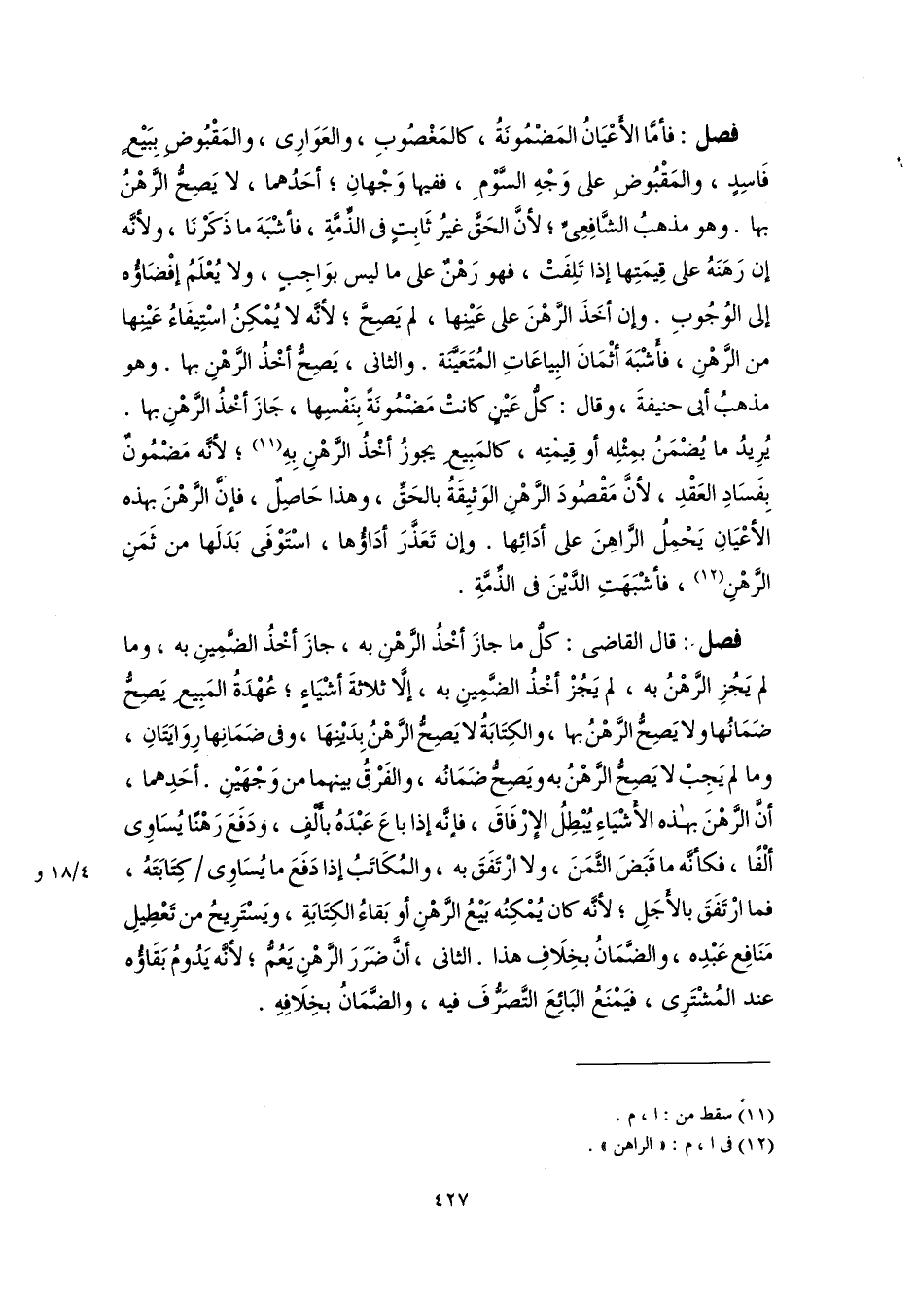 فصل: فأمَّا الأعْيَانُ المَضْمُونَةُ، كالمَغْصُوبِ، والعَوَارِى، والمَقْبُوضِ بِبَيْعِ فَاسِدٍ، والمَقْبُوضِ على وَجْهِ السَّوْمِ، ففيها وَجْهانِ؛ أحَدُهما، لا يَصِحُّ الرَّهْنُ بها. وهو مذهبُ الشَّافِعِىِّ؛ لأنَّ الحَقَّ غيرُ ثَابِتٍ فى الذِّمَّةِ، فأشْبَهَ ما ذَكَرْنَا، ولأنَّه إن رَهَنَهُ على قِيمَتِها إذا تَلِفَتْ، فهو رَهْنٌ على ما ليس بوَاجِبٍ، ولا يُعْلَمُ إفْضَاؤُه إلى الوُجُوبِ. وإن أخَذَ الرَّهْنَ على عَيْنِها، لم يَصِحَّ؛ لأنَّه لا يُمْكِنُ اسْتِيفَاءُ عَيْنِها من الرَّهْنِ، فأَشْبَهَ أثْمَانَ البِياعَاتِ المُتَعَيَّنَة. والثانى، يَصِحُّ أخْذُ الرَّهْنِ بها. وهو مذهبُ أبى حنيفةَ، وقال: كلُّ عَيْنٍ كانتْ مَضْمُونَةً بِنَفْسِها، جَازَ أخْذُ الرَّهْنِ بها. يُرِيدُ ما يُضْمَنُ بمِثْلِه أو قِيمتِه، كالمَبِيعِ يجوزُ أخْذُ الرَّهْنِ بِهِ (١١)؛ لأنَّه مَضْمُونٌ بِفَسَادِ العَقْدِ، لأنَّ مَقْصُودَ الرَّهْنِ الوَثيِقَةُ بالحَقِّ، وهذا حَاصِلٌ، فإنَّ الرَّهْنَ بهذه الأعْيَانِ يَحْمِلُ الرَّاهِنَ على أدَائِها. وإن تَعَذَّرَ أدَاؤُها، اسْتَوْفَى بَدَلَها من ثَمَنِ الرَّهْنِ (١٢)، فأشْبَهَتِ الدَّيْنَ فى الذِّمَّةِ.
