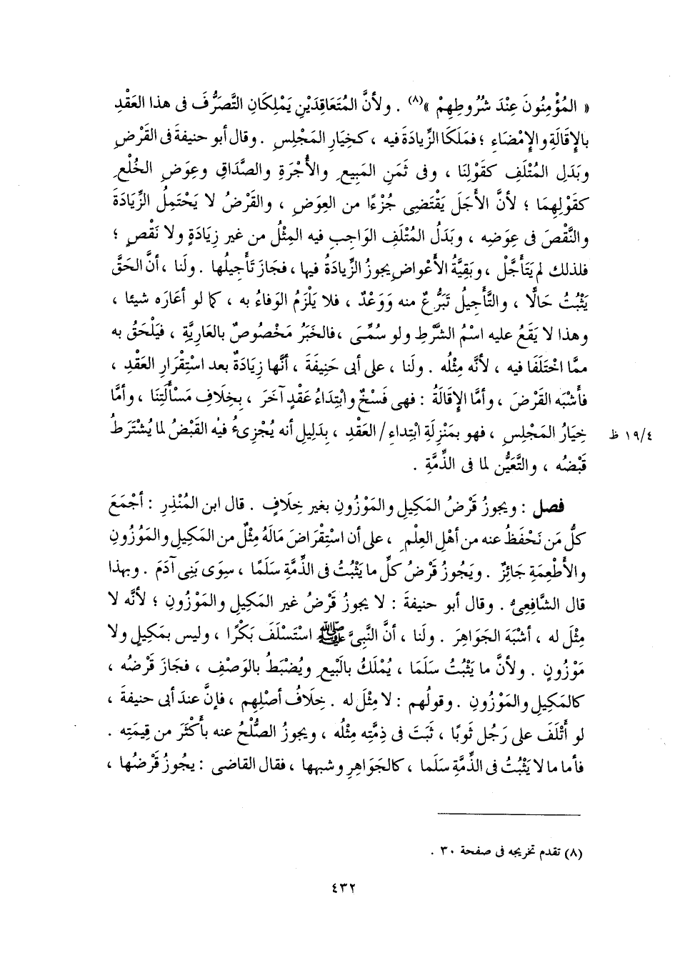 "المُؤْمِنُونَ عِنْدَ شُرُوطِهِمْ" (٨). ولأنَّ المُتَعَاقِدَيْنِ يَمْلِكَانِ التَّصَرُّفَ فى هذا العَقْدِ بالإقَالَةِ والإمْضَاءِ، فمَلَكَا الزِّيادَةَ فيه، كخِيَارِ المَجْلِسِ. وقال أبو حنيفةَ فى القَرْضِ وبَدَلِ المُتْلَفِ كقَوْلِنَا، وفى ثَمَنِ المَبِيعِ والأُجْرَةِ والصَّدَاقِ وعِوَضِ الخُلْعِ كقَوْلِهِمَا؛ لأنَّ الأَجَلَ يَقْتَضِى جُزْءًا من العِوَضِ، والقَرْضُ لا يَحْتَمِلُ الزِّيَادَةَ والنَّقْصَ فى عِوَضِه، وبَدَلُ المُتْلَفِ الوَاجِبِ فيه المِثْلُ من غير زِيَادَةٍ ولا نَقْصٍ؛ فلذلك لم يَتَأَجَّلْ، وبَقِيَّةُ الأعْواضِ يجوزُ الزِّيادَةُ فيها، فجَازَ تَأَجِيلُها. ولَنا، أنَّ الحَقَّ يَثْبُتُ حَالًّا، والتَّأَجِيلُ تَبَرُّعٌ منه وَوَعْدٌ، فلا يَلْزَمُ الوَفاءُ به، كما لو أعَارَه شيئا، وهذا لا يَقَعُ عليه اسْمُ الشَّرْطِ ولو سُمِّىَ، فالخَبَرُ مَخْصُوصٌ بالعَارِيَّةِ فيَلْحَقُ به ممَّا اخْتَلَفَا فيه؛ لأنَّه مِثْلُه. ولَنا, على أبى حَنِيفَةَ أنَّها زِيَادَةٌ وبعد اسْتِقْرَارِ العَقْدِ, فأَشْبَه القَرْضَ، وأمَّا الإقَالَةُ: فهى فَسْخٌ وابْتِدَاءُ عَقْدٍ آخَرَ، بِخِلَافِ مَسْألَتِنَا، وأمَّا خِيَارُ المَجْلِسِ، فهو بمَنْزِلَةِ ابْتِداءِ العَقْدِ، بِدَلِيلِ أنه يُجْزِىءُ فيه القَبْضُ لما يُشْتَرَطُ قَبْضُه، والتَّعَيُّن لما فى الذِّمَّةِ.