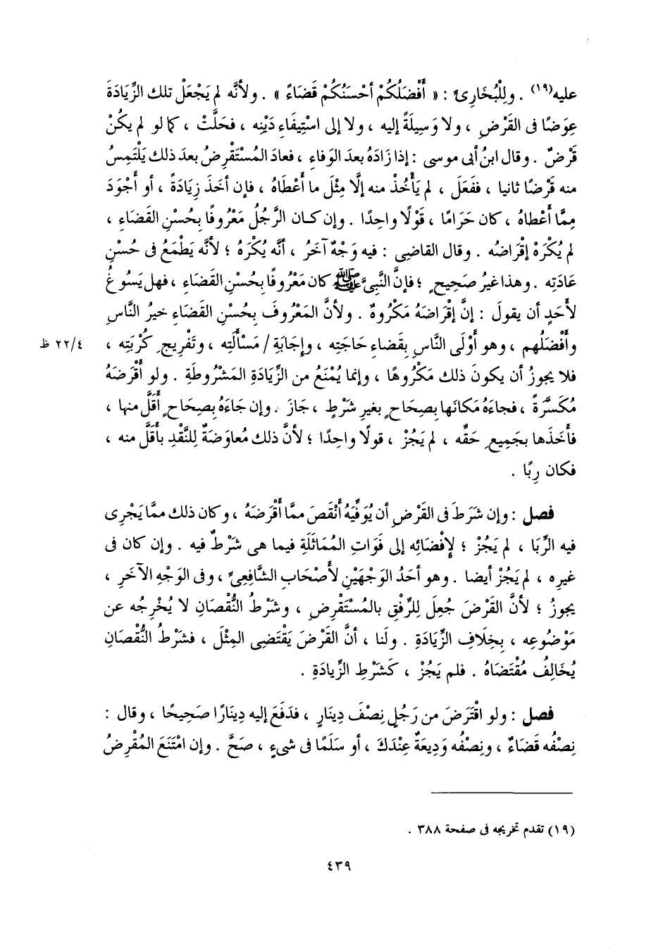 عليه (١٩). ولِلْبُخَارِىِّ: "أَفْضَلُكُمْ أحْسَنُكُمْ قَضَاءً". ولأنَّه لم يَجْعَلْ تلك الزِّيَادَةَ عِوَضًا فى القَرْضِ، ولا وَسِيلَةً إليه، ولا إلى اسْتِيفَاءِ دَيْنِه، فحَلَّتْ، كما لو لم يكُنْ قَرْضٌ. وقال ابنُ أبى موسى: إذا زَادَهُ بعدَ الوَفاءِ، فعادَ المُسْتَقْرِضُ بعدَ ذلك يَلْتَمِسُ منه قَرْضًا ثانيا، ففَعَلَ، لم يَأْخُذْ منه إلَّا مِثْلَ ما أَعْطَاهُ، فإن أخَذَ زِيَادَةً، أو أَجْوَدَ مِمَّا أَعْطاهُ، كان حَرَامًا، قَوْلًا واحِدًا. وإن كان الرَّجُلُ مَعْرُوفًا بِحُسْنِ القَضَاءِ، لم يُكْرَهْ إقْرَاضُه. وقال القاضِى: فيه وَجْهٌ آخَرُ، أنَّه يُكْرَهُ؛ لأنَّه يَطْمَعُ فى حُسْنِ عَادَتِه. وهذا غيرُ صَحِيحٍ؛ فإنَّ النَّبِىَّ -صَلَّى اللهُ عَلَيْهِ وَسَلَّمَ- كان مَعْرُوفًا بِحُسْنِ القَضَاءِ، فهل يَسُوغُ لأحَدٍ أن يقولَ: إنَّ إقْرَاضَهُ مَكْرُوهٌ. ولأنَّ المَعْرُوفَ بِحُسْنِ القَضَاءِ خيرُ النَّاسِ وأَفْضَلُهم، وهو أَوْلَى النَّاسِ بِقَضاءِ حَاجَتِه، وإِجَابَةِ مَسْأَلَتِه، وتَفْرِيجِ كُرْبَتِه، فلا يجوزُ أن يكونَ ذلك مَكْرُوهًا، وإنما يُمْنَعُ من الزِّيَادَةِ المَشْرُوطَةِ. ولو أَقْرَضَهُ مُكَسَّرَةً، فجاءَهُ مَكانَها بِصِحَاحٍ بغيرِ شَرْطٍ، جَازَ. وإن جَاءَهُ بِصِحَاحٍ أقَلَّ منها، فأَخَذَها بجَمِيعِ حَقِّه، لم يَجُزْ، قولًا واحِدًا؛ لأنَّ ذلك مُعاوَضَةٌ لِلنَّقْدِ بأَقَلَّ منه، فكان رِبًا.