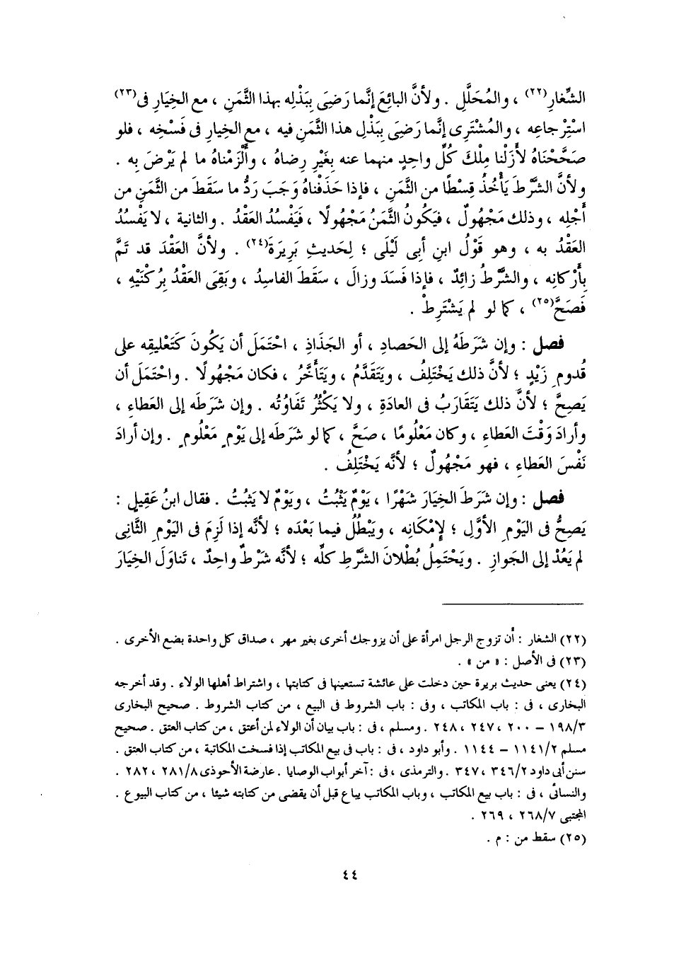 الشِّغارِ (٢٢)، والمُحَلَّلِ. ولأنَّ البائِعَ إنَّما رَضِىَ بِبَذْلِه بهذا الثَّمَنِ، مع الخِيَارِ فى (٢٣) اسْتِرْجاعِه، والمُشْتَرِى إنَّما رَضِىَ بِبَذْلِ هذا الثَّمَنِ فيه، مع الخِيارِ فى فَسْخِه، فلو صَحَّحْنَاهُ لأَزَلْنا مِلْكَ كُلِّ واحِدٍ منهما عنه بِغَيْرِ رِضاهُ، وألْزَمْناهُ ما لم يَرْضَ بِه. ولأنَّ الشَّرْطَ يَأْخُذُ قِسْطًا من الثَّمَنِ، فإذا حَذَفْناهُ وَجَبَ رَدُّ ما سَقَطَ من الثَّمَنِ من أَجْلِه، وذلك مَجْهُولٌ، فيَكُونُ الثَّمَنُ مَجْهُولًا، فَيَفْسُدُ العَقْدُ. والثانية، لا يَفسُدُ العَقْدُ به، وهو قَوْلُ ابنِ أبِى لَيْلَى؛ لِحَديثِ بَرِيرَةَ (٢٤). ولأنَّ العَقْدَ قد تَمَّ بِأرْكانِه، والشَّرْطُ زائِدٌ، فإذا فَسَدَ وزالَ، سَقَطَ الفاسِدُ، وبَقِىَ العَقْدُ بِرُكْنَيْهِ، فَصَحَّ (٢٥)، كما لو لم يَشْتَرِطْ.