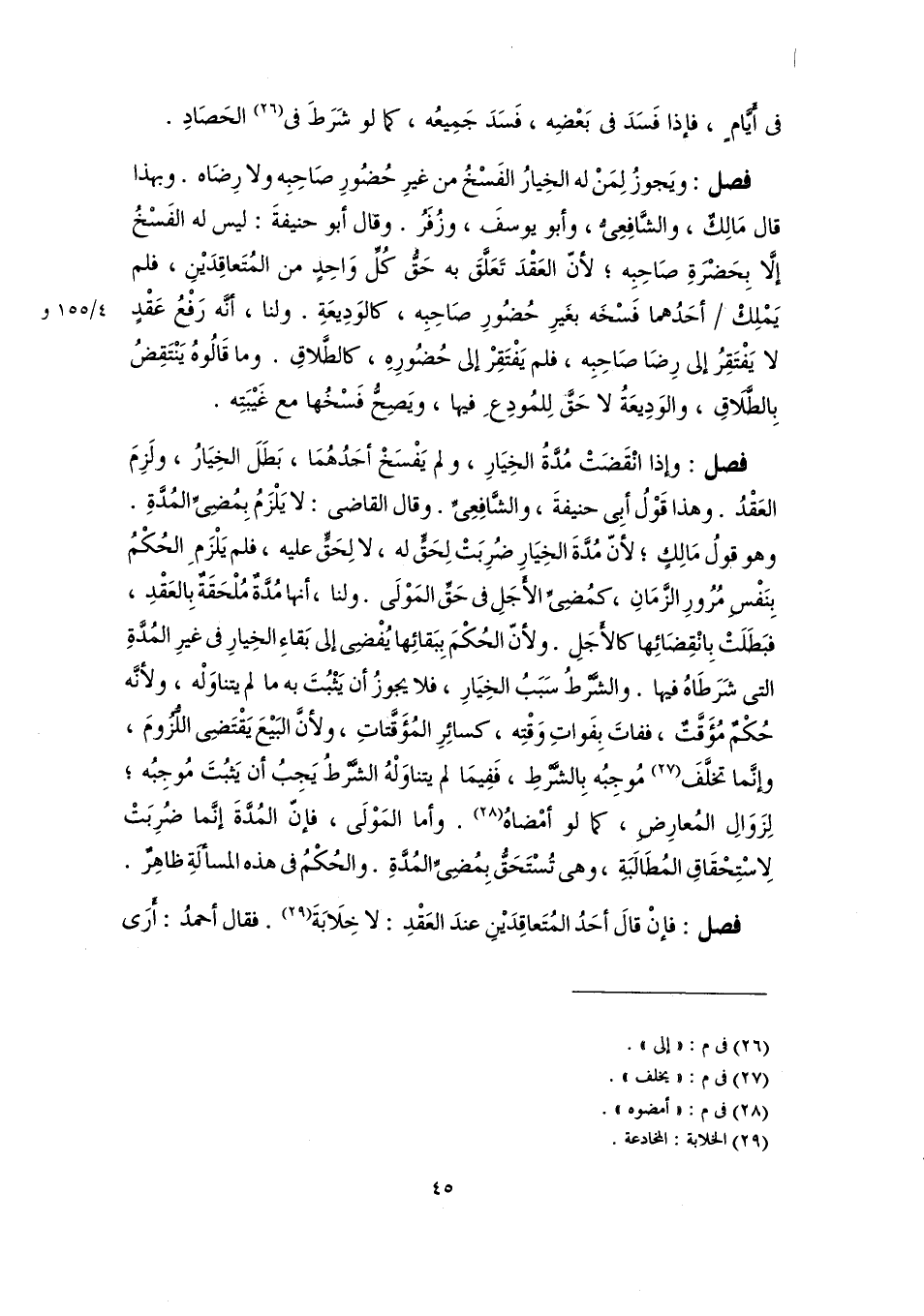 فصل: ويَجوزُ لِمَنْ له الخِيارُ الفَسْخُ من غيرِ حُضُورِ صَاحِبِه ولا رِضَاه. وبهذا قال مَالِكٌ، والشَّافِعِىُّ، وأبو يوسفَ، وزُفَرُ. وقال أبو حنيفةَ: ليس له الفَسْخُ إلَّا بِحَضْرَةِ صَاحِبِه؛ لأنّ العَقْدَ تَعَلَّقَ به حَقُّ كُلِّ وَاحِدٍ من المُتَعاقِدَيْنِ، فلم يَمْلِكْ أحَدُهما فَسْخَه بغَيرِ حُضُورِ صَاحِبِه، كالوَدِيعَةِ. ولنا، أنَّه رَفْعُ عَقْدٍ لا يَفْتَقِرُ إلى رِضَا صَاحِبِه، فلم يَفْتَقِرْ إلى حُضُورِهِ، كالطَّلاقِ. وما قَالُوهُ يَنْتَقِضُ بِالطَّلاقِ، والوَدِيعَةُ لا حَقَّ لِلمُودِعِ فيها، ويَصِحُّ فَسْخُها مع غَيْبَتِه.