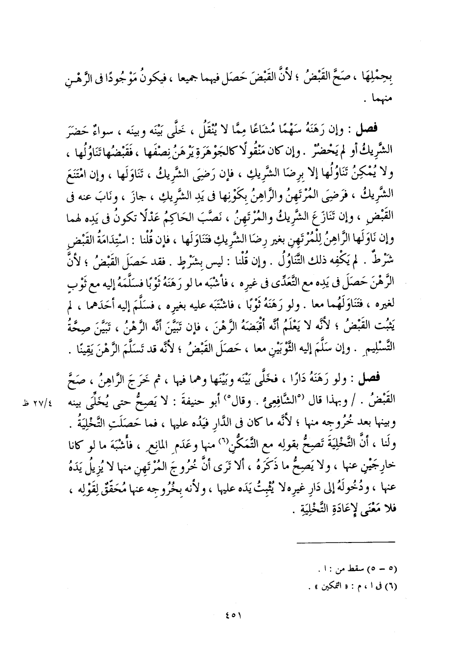 فصل: وإن رَهَنَهُ سَهْمًا مُشَاعًا مِمَّا لا يُنْقَلُ، خَلَّى بَيْنَه وبينَه، سواءٌ حَضَرَ الشَّرِيكُ أو لم يَحْضُرْ. وإن كان مَنْقُولًا كالجَوْهَرَةِ يَرْهَنُ نِصْفَها، فَقَبْضُها تَنَاوُلُها، ولا يُمْكِنُ تَنَاوُلُها إلَّا بِرِضَا الشَّرِيكِ، فإن رَضِىَ الشَّرِيكُ، تَنَاوَلَها، وإن امْتَنَعَ الشَّرِيكُ، فرَضِىَ المُرْتَهِنُ والرَّاهِنُ بِكَوْنِها في يَدِ الشَّرِيكِ، جازَ، ونَابَ عنه في القَبْضِ، وإن تَنَازَعَ الشَّرِيكُ والمُرْتَهِنُ، نَصَّبَ الحَاكِمُ عَدْلًا تكونُ في يَدِه لهما وإن نَاوَلَها الرَّاهِنُ لِلْمُرْتَهِنِ بغير رِضَا الشَّرِيكِ فتَنَاوَلَها، فإن قُلْنا: اسْتِدَامَةُ القَبْضِ شَرْطٌ. لم يَكْفِه ذلك التَّنَاوُلُ. وإن قُلْنا: ليس بِشَرْطٍ. فقد حَصَلَ القَبْضُ، لأنَّ الرَّهْنَ حَصَلَ في يَدِه مع التَّعَدِّى في غيرِه، فأشْبَه ما لو رَهَنَهُ ثَوْبًا فسَلَّمَهُ إليه مع ثَوْبٍ لغيره، فتَنَاوَلَهُما معا. ولو رَهَنَهُ ثَوْبًا، فاشْتَبَه عليه بغيرِه، فسَلَّمَ إليه أحَدَهما، لم يَثبُت القَبْضُ؛ لأنَّه لا يَعْلَمُ أنَّه أقْبَضَهُ الرَّهْنَ، فإن تَبَيَّنَ أنَّه الرَّهْنُ، تَبَيَّنَ صِحَّةُ التَّسْلِيمِ. وإن سَلَّمَ إليه الثَّوْبَيْنِ معا، حَصَلَ القَبْضُ، لأنَّه قد تَسَلَّمَ الرَّهْنَ يَقِينًا.