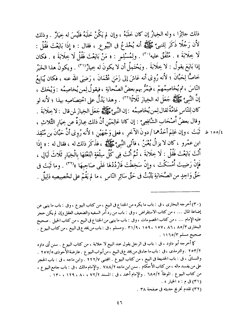 (٣٠) أخرجه البخاري، في: باب ما يكره من الخداع في البيع، من كتاب البيوع، وفي: باب ما ينهى عن إضاعة المال. . .، من كتاب الاستقراض، وفي: باب من رد أمر السفيه والضعيف العقل وإن لم يكن حجر عليه الإمام. . .، من كتاب الخصومات، وفي: باب ما ينهى من الخداع في البيع، من كتاب الحيل. صحيح البخاري ٣/ ٨٥، ٨٦، ١٥٧، ١٥٩، ٩/ ٣١. ومسلم، في: باب من يخدع في البيع، من كتاب البيوع. صحيح مسلم ٣/ ١١٦٥.
