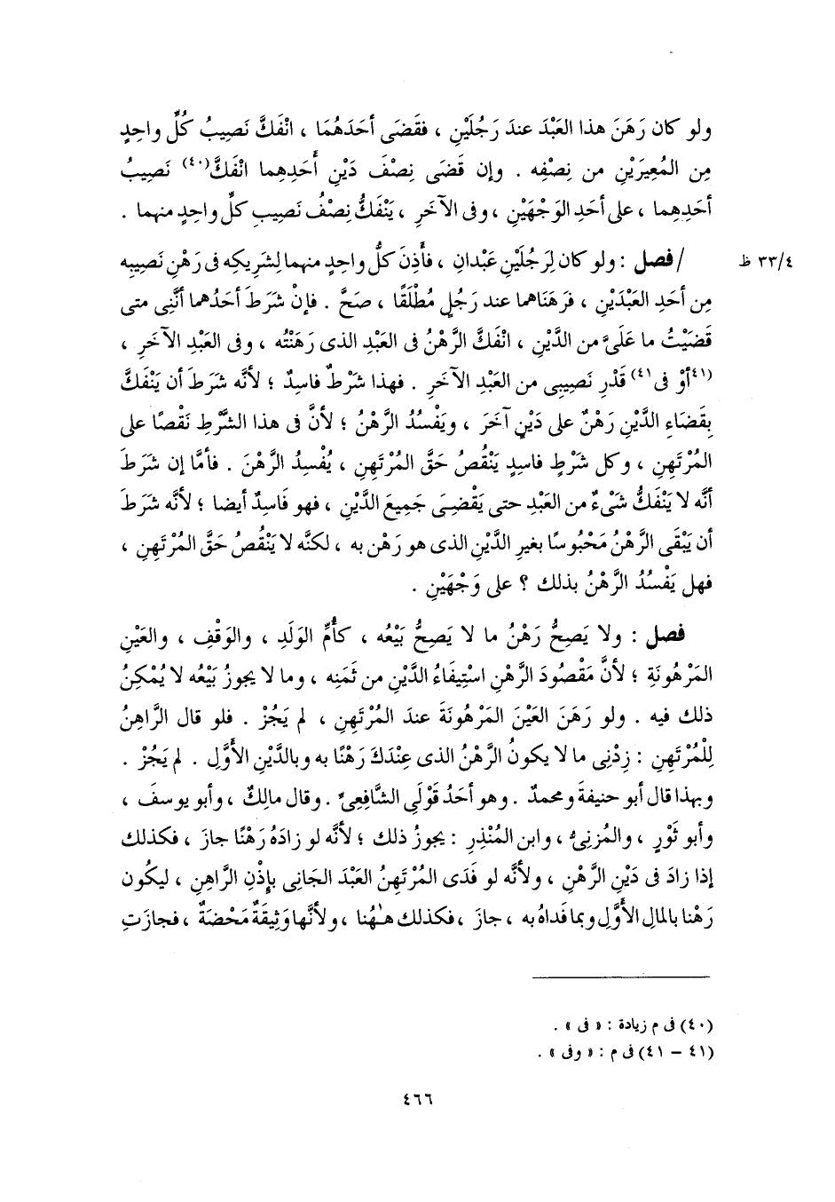 فصل: ولو كان لِرَجُلَيْنِ عَبْدانِ، فأَذِنَ كلُّ واحِدٍ منهما لِشَرِيكِه فى رَهْنِ نَصِيبِه مِن أحَدِ العَبْدَيْنِ، فرَهَنَاهما عند رَجُلٍ مُطْلَقًا، صَحَّ. فإنْ شَرَطَ أحَدُهما أنَّنِى متى قَضَيْتُ ما عَلَىَّ من الدَّيْنِ، انْفَكَّ الرَّهْنُ فى العَبْدِ الذى رَهَنْتُه، وفى العَبْدِ الآخَرِ، [أوْ فى] (٤١) قَدْرِ نَصِيبِى من العَبْدِ الآخَرِ. فهذا شَرْطٌ فاسِدٌ؛ لأنَّه شَرَطَ أن يَنْفَكَّ بِقَضَاءِ الدَّيْنِ رَهْنٌ على دَيْنٍ آخَرَ، ويَفْسُدُ الرَّهْنُ؛ لأنَّ فى هذا الشَّرْطِ نَقْصًا على المُرْتَهِنِ، وكل شَرْطٍ فاسِدٍ يَنْقُصُ حَقَّ المُرْتَهِنِ، يُفْسِدُ الرَّهْنَ. فأمَّا إن شَرَطَ أنَّه لا يَنْفَكُّ شَىْءٌ من العَبْدِ حتى يَقْضِىَ جَمِيعَ الدَّيْنِ، فهو فَاسِدٌ أيضا؛ لأنَّه شَرَطَ أن يَبْقَى الرَّهْنُ مَحْبُوسًا بغيرِ الدَّيْنِ الذى هو رَهْن به، لكنَّه لا يَنْقُصُ حَقَّ المُرْتَهِنِ، فهل يَفْسُدُ الرَّهْنُ بذلك؟ على وَجْهَيْنِ.