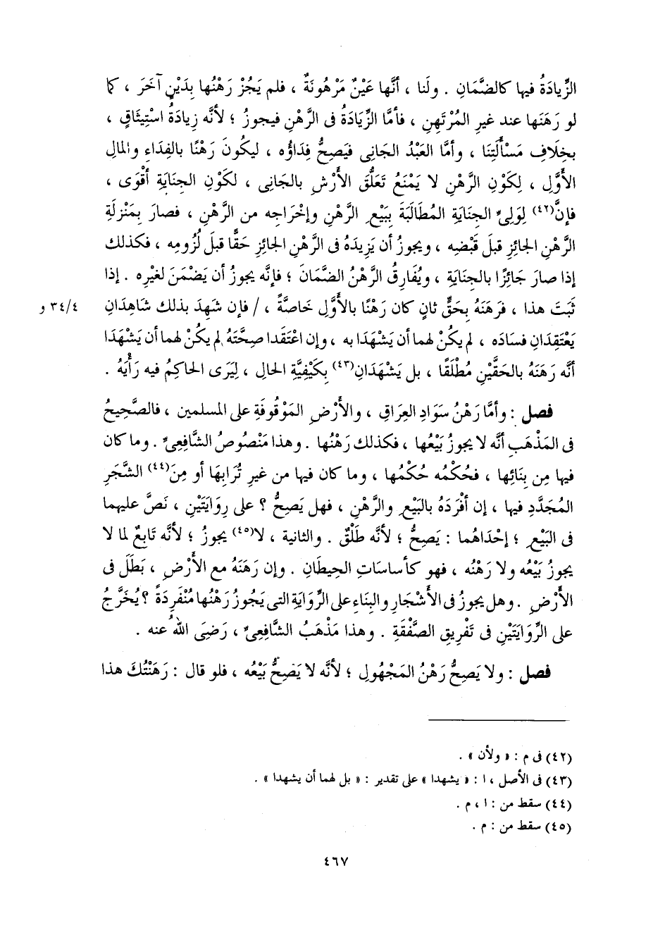 فصل: وأمَّا رَهْنُ سَوَادِ العِرَاقِ، والأَرْضِ المَوْقُوفَةِ على المسلمين، فالصَّحِيحُ فى المَذْهَبِ أنَّه لا يجوزُ بَيْعُها، فكذلك رَهْنُها. وهذا مَنْصُوصُ الشَّافِعِىِّ. وما كان فيها مِن بِنَائِها، فحُكْمُه حُكْمُها، وما كان فيها من غيرِ تُرَابِهَا أو مِنَ (٤٤) الشَّجَرِ المُجَدَّدِ فيها، إن أفْرَدَهُ بالبَيْعِ والرَّهْنِ، فهل يَصِحُّ؟ على رِوَايَتَيْنِ، نَصَّ عليهما فى البَيْعِ؛ إحْدَاهُما: يَصِحُّ، لأنَّه طَلْقٌ. والثانية، لا (٤٥) يجوزُ؛ لأنَّه تَابِعٌ لما لا يجوزُ بَيْعُه ولا رَهْنُه، فهو كأساسَاتِ الحِيطَانِ. وإن رَهَنَهُ مع الأَرْضِ، بَطَلَ فى الأَرْضِ. وهل يجوزُ فى الأَشْجَارِ والبِنَاءِ على الرِّوَايَةِ التى يَجُوزُ رَهْنُها مُنْفَرِدَةً؟ يُخَرَّجُ على الرِّوَايَتَيْنِ فى تَفْرِيقِ الصَّفْقَةِ. وهذا مَذْهَبُ الشَّافِعِىِّ، رَضِىَ اللهُ عنه.