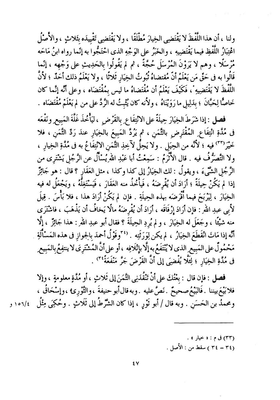 ولنا، أن هذا اللَّفْظَ لا يَقْتَضِي الخِيارَ مُطْلَقًا، ولا يَقْتَضِي تَقْيِيدَه بِثَلاثٍ، والأصْلُ اعْتِبَارُ اللَّفْظِ فيما يَقْتَضِيهِ، والخَبَرُ على الوَجْهِ الذي احْتَجُّوا به إنّما رواه ابنُ مَاجَه مُرْسَلًا، وهم لا يَرَوْنَ المُرْسَلَ حُجَّةً، ثم لم يَقُولُوا بِالحَدِيثِ على وَجْهِه، إنَّما قَالُوا به في حَقِّ مَن يَعْلَمُ أنّ مُقتضاهُ ثُبُوتُ الخِيَارِ ثَلاثًا، ولا يَعْلَمُ ذلك أحَدٌ؛ لأنَّ اللَّفْظَ لا يَقْتَضِيهِ، فَكَيْفَ يَعْلَمُ أن مُقْتَضاهُ ما ليس بِمُقْتَضَاه، وعلى أنَّه إنَّما كان خَاصًّا لِحَبَّانَ؛ بِدَلِيلِ ما رَوَيْنَاهُ، ولأنه كان يُثْبِتُ له الرَّدَّ على من لم يَعْلَمْ مُقْتَضَاه.