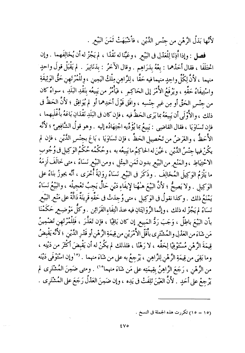 فصل: وإذا أَذِنَا لِلْعَدْلِ فى البَيْعِ، وعَيَّنَا له نَقْدًا، لم يَجُزْ له أن يُخَالِفَهما. وإن اخْتَلَفَا، فقال أحَدُهما: بِعْهُ بِدَرَاهِم. وقال الآخَرُ: بِدَنَانِيرَ. لم يَقْبَلْ قولَ واحدٍ منهما، لأنَّ لِكُلِّ واحِدٍ منهما فيه حَقًّا، لِلرَّاهِنِ مِلْكُ اليَمِينِ، وِللْمُرْتَهِنِ حَقُّ الوَثِيقَةِ واسْتِيفَاءُ حَقِّهِ، ويَرْفَعُ الأَمْرَ إلى الحَاكِمِ، فيَأْمُرُ من يَبِيعُه بِنَقْدِ البَلَدِ، سواءٌ كان من جِنْسِ الحَقِّ أو مِن غيرِ جِنْسِه، وافَقَ قَوْلَ أحَدِهما أو لم يُوَافِقْ؛ لأنَّ الحَظَّ فى ذلك، والأَوْلَى أن يَبِيعَهُ بما يَرَى الحَظَّ فيه، فإن كان فى البَلَدِ نَقْدَانِ بَاعَهُ بأَغْلَبِهما، فإن تَسَاوَيَا، فقال القاضِى: يَبِيعُ بما يُؤَدِّيه اجْتِهَادُه إليه. وهو قولُ الشَّافِعِىِّ؛ لأنَّه الأَحَظُّ، والغَرَضُ من تَحْصِيلِ الحَظِّ، فإن تَسَاوَيَا، بَاعَ بجِنْسِ الدَّيْنِ، فإن لم يكُنْ فيها جِنْسُ الدَّيْنِ، عَيَّنَ له الحاكِمُ ما يَبِيعُه به، وحُكْمُه حُكْمُ الوَكِيلِ فى وُجُوبِ الاحْتِيَاطِ، والمَنْعِ من البَيْعِ بدون ثَمَنِ المِثْلِ، ومن البَيْعِ نَسَاءً، متى خَالَفَ لَزِمَهُ ما يَلْزَمُ الوَكِيلَ المُخَالِفَ. وذَكَرَ فى البَيْعِ نَسَاءً رِوَايَةً أُخْرَى, أنَّه يجوزُ بنَاءً على الوَكِيلِ. ولا يَصِحُّ؛ لأنَّ البَيْعَ هاهُنا لإِيفَاءِ دَيْنٍ حَالٍّ يَجبُ تَعْجِيلُه، والبَيْعُ نَسَاءً يَمْنَعُ ذلك. وكذا نقولُ فى الوَكِيلِ، متى وُجِدَتْ فى حَقِّهِ قَرِينَةٌ دَالَّةٌ على مَنْعِ البَيْعِ نَسَاءً لم يَجُزْ له ذلك، وإنَّما الرِّوَايَتَانِ فيه عندَ انْتِفَاءِ القَرَائِن. وكلُّ مَوْضِعٍ حَكَمْنَا بأن البَيْعَ باطِلٌ، وَجَبَ رَدُّ المَبِيعِ إن كان بَاقِيًا، فإن تَعَذَّرَ، فَلِلْمُرْتَهِنِ تَضْمِينُ مَن شَاءَ من العَدْلِ والمُشْتَرِى بأَقَلّ الأَمْرَيْنِ من قِيمَةِ الرَّهْنِ أو قَدْرِ الدَّيْنِ؛ لأنَّه يَقْبِضُ قِيمَةَ الرَّهْنِ مُسْتَوْفِيًا لِحَقِّه، لا رَهْنًا، فلذلك لم يكُنْ له أن يَقْبِضَ أكْثَرَ من دَيْنِه، وما بَقِىَ من قِيمَةِ الرَّهْنِ لِلرَّاهِنِ، يَرْجِعُ به على من شَاءَ منهما. [وإن اسْتَوْفَى دَيْنَه من الرَّهْنِ، رَجَعَ الرَّاهِنُ بِقِيمَتِه على مَن شَاءَ منهما] (١٥). ومتى ضَمِنَ المُشْتَرِى لم يَرْجِعْ على أحَدٍ. لأنَّ العَيْنَ تَلِفَتْ فى يَدِه، وإن ضَمِنَ العَدْلُ رَجَعَ على المُشْتَرِى.