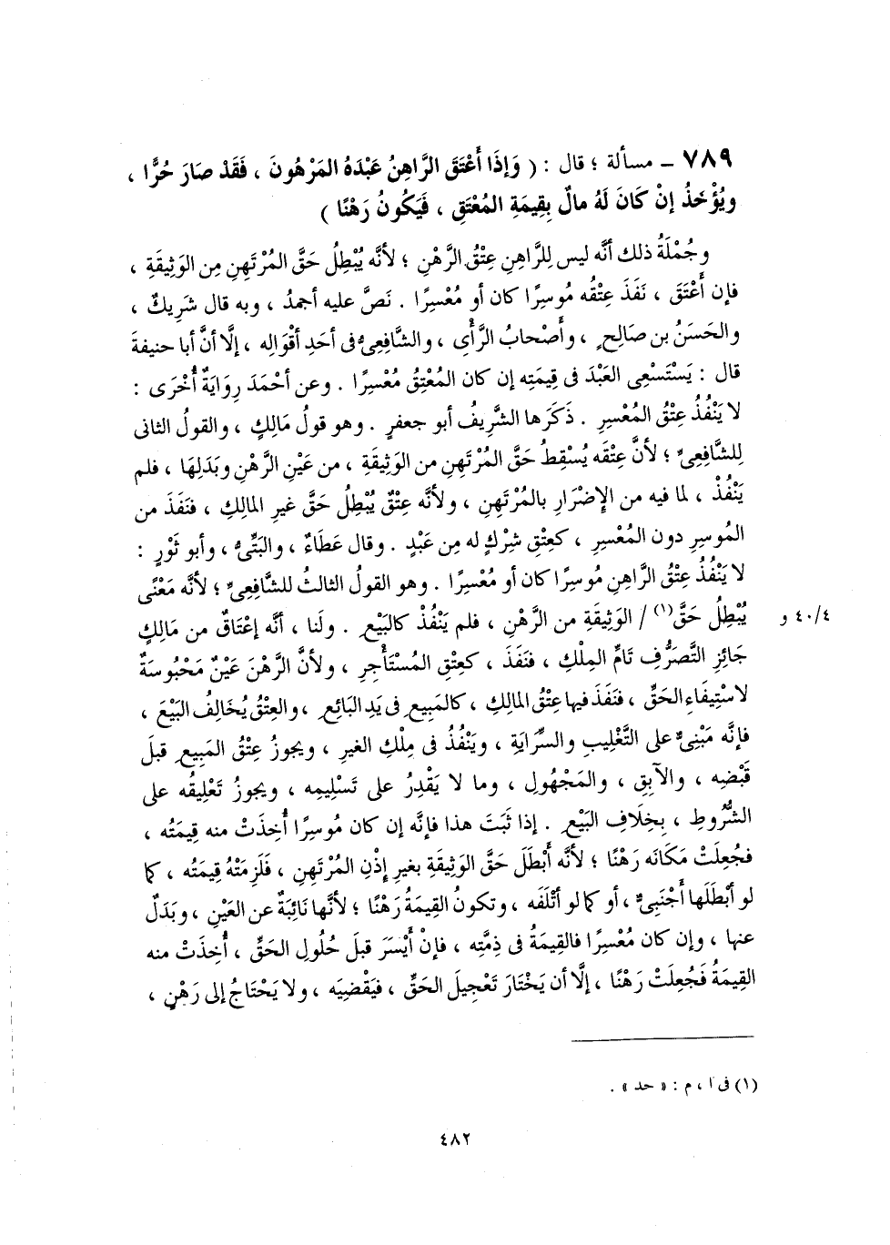 ٧٨٩ - مسألة؛ قال: (وَإذَا أَعْتَقَ الرَّاهِنُ عَبْدَهُ المَرْهُونَ، فَقَدْ صَارَ حُرًّا، ويُؤْخَذُ إنْ كَانَ لَهُ مالٌ بِقِيمَةِ المُعْتَقِ، فَيَكُونُ رَهْنًا)