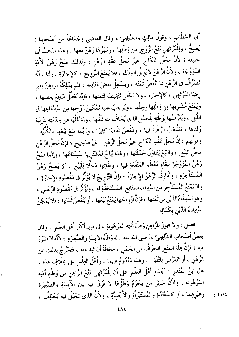 فصل: ولا يجوزُ لِلراهِنِ وَطْءُ أَمَتِه المَرْهُونَةِ، في قولِ أكْثَر أهْلِ العِلْمِ. وقال بعضُ أصْحابِ الشَّافِعِيِّ، رَضِىَ اللَّه عنه: له وَطْءُ الآيِسَةِ والصَّغِيرَةِ؛ لأنَّه لا ضَرَرَ فيه؛ فإنَّ عِلَّةَ المَنْعِ الخَوْفُ من الحَمْلِ، مَخَافَةَ أن تَلِدَ منه، فتَخْرُجُ بذلك عن الرَّهْنِ، أو تَتَعَرَّض لِلتَّلَفِ، وهذا مَعْدُومٌ فيهما. وأهْلُ العِلْمِ على خِلَافِ هذا. قال ابنُ المُنْذِرِ: أجْمَعَ أهْلُ العِلْمِ على أن لِلْمُرْتَهِنِ مَنْعَ الرَّاهِنِ من وَطْءِ أمَتِه المَرْهُونة. ولأنَّ سَائِرَ مَن يَحْرُمُ وَطْؤُهَا لا فَرْقَ فيه بين الآيِسَةِ والصَّغِيرَةِ وغَيْرِهِما، كالمُعْتَدَّةِ والمُسْتَبْرَأَةِ والأَجْنَبِيَّةِ، ولأنَّ الذى تَحْبَلُ فيه يَخْتَلِفُ،