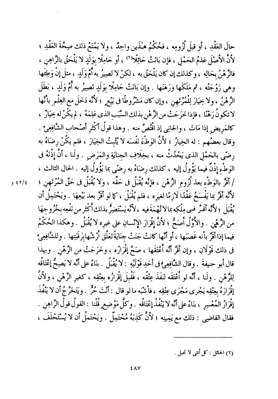 حالَ العَقْدِ، أو قبلَ لُزُومِه، فحُكْمُ هذَين واحِدٌ، ولا يَمْنَعُ ذلك صِحَّةَ العَقْدِ؛ لأنَّ الأصْلَ عَدَمُ الحَمْلِ، فإن بَانَتْ حَائِلًا (٢)، أو حَامِلًا بِوَلَدٍ لا يَلْحَقُ بالرَّاهِنِ، فالرَّهْنُ بِحَالِه، وكذلك إن كان يَلْحَقُ به، لكنْ لا تَصِيرُ به أُمَّ وَلَدٍ، مثلَ إنْ وَطِئَها وهى زَوْجَتُه، ثم مَلَكَها ورَهَنَها. وإن بَانَتْ حَامِلًا بِوَلَدٍ تَصِيرُ به أُمَّ وَلَدٍ، بَطَلَ الرَّهْنُ، ولا خِيَارَ لِلْمُرْتَهِنِ، وإن كان مَشْرُوطًا في بَيْعٍ؛ لأنَّه دَخَلَ مع العِلْمِ بأنَّها لا تكونُ رَهْنًا، فإذا خَرَجَتْ من الرَّهْنِ بذلك السَّبَبِ الذى عَلِمَهُ، لم يكُنْ له خِيَارٌ، كالمَرِيضِ إذا مَاتَ، والجانِى إذ اقْتُصَّ منه. وهذا قولُ أكْثَرِ أصْحابِ الشَّافِعِيِّ. وقال بعضُهم: له الخِيارُ؛ لأنَّ الوَطْءَ نَفْسَه لا يُثْبِتُ الخِيَارَ، فلم يكُنْ رِضَاهُ به رِضًى بالحَمْلِ الذى يَحْدُثُ منه، بخِلَافِ الجِنايَةِ والمَرَضِ. ولَنا، أنَّ إِذْنَهُ في الوَطْءِ إِذْنٌ فيما يَؤُولُ إليه، كذلك رِضَاهُ به رِضًى بما يَؤُولُ إليه. الحالِ الثالث، أقَرَّ بالوَطْءِ بعدَ لُزُومِ الرَّهْنِ، فإنَّه يُقْبَلُ في حَقِّه، ولا يُقْبَلُ في حَقِّ المُرْتَهِنِ؛ لأنَّه أقَرَّ بما يَفْسَخُ عَقْدًا لَازِمًا لغيرِه، فلم يُقْبَلْ، كما لو أقَرَّ بعد بَيْعِهَا. ويَحْتَمِلُ أن يُقْبَلَ؛ لأنَّه أقَرَّ في مِلْكِه بما لا تُهْمَةَ فيه، لأنَّه يَسْتَضِرُّ بذلك أَكْثَر من نَفْعِه بِخُرُوجِهَا من الرَّهْنِ. والأَوَّلُ أَصَحُّ؛ لأنَّ إِقْرَارَ الإِنْسانِ على غيرِه لا يُقْبَلُ. وهكذا الحُكْمُ فيما إذا أقَرَّ بأنه غَصَبَها، أو أنَّها كانتْ جَنَتْ جِنَايَةً تَعَلَّقَ أَرْشُها بِرَقَبَتِها. وللشَّافِعِيِّ في ذلك قَوْلَانِ، وإن أقَرَّ أنَّه أَعْتَقَها، صَحَّ إقْرَارُه، وخَرَجَتْ من الرَّهْنِ. وبهذا قال أبو حنيفةَ. وقال الشَّافِعِيُّ في أحَدِ قَوْلَيْهِ: لا يُقْبَلُ. بنَاءً على أنَّه لا يَصِحُّ إعْتَاقُه لِلرَّهْنِ. ولَنا، أنَّه لو أَعْتَقَه لنَفَذَ عِتْقُه، فَقُبِلَ إقْرَارُه بِعِتْقِه، كغيرِ الرَّهْنِ، ولأنَّ إقْرَارَهُ بِعِتْقِه يَجْرى مَجْرَى عِتْقِه، فأشْبَه ما لو قال: أنْتَ حُرٌّ. ويَتَخَرَّجُ أن لا يَنْفُذَ إقْرَارُ المُعْسِرِ، بنَاءً على أنَّه لا يَنْفُذُ إعْتَاقُه. وكلُّ مَوْضِعٍ قُلْنا: القولُ قولُ الرَّاهِنِ. فقال القاضِى: ذلك مع يَمِينِه؛ لأنَّ كَذِبَهُ مُحْتَمِلٌ. ويَحْتَملُ أن لا يُسْتَحْلَفَ،