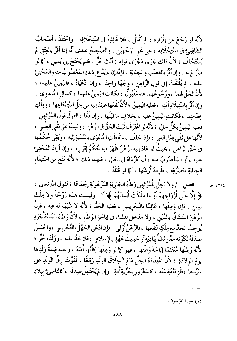 فصل: ولا يَحِلُّ لِلْمُرْتَهِنِ وَطْءُ الجَارِيَةِ المَرْهُونَةِ إجْمَاعًا؛ لقولِ اللهِ تعالى: {إِلَّا عَلَى أَزْوَاجِهِمْ أَوْ مَا مَلَكَتْ أَيْمَانُهُمْ} (٣). وليست هذه زوْجَةً ولا مِلْكَ يَمِينٍ. فإن وَطِئَها، عَالِمًا بالتَّحْرِيمِ، فعليه الحَدُّ، لأنَّه لا شُبْهَةَ له فيه، فإنَّ الرَّهْنَ اسْتِيثَاقٌ بالدَّيْنِ، ولا مَدْخَلَ لذلك في إباحَةِ الوَطْءِ، لأنَّ وَطْءَ المُسْتَأْجَرَةِ يُوجِبُ الحَدَّ مع مِلْكِه لِنَفْعِها، فالرَّهْنُ أَوْلَى. فإن ادَّعَى الجَهْلَ بالتَّحْريِمِ، واحْتَمَلَ صِدْقَهُ لكَوْنِه ممَّن نَشَأَ بِبَادِيَةٍ أو حَدِيثَ عَهْدٍ بالإِسلامِ، فلا حَدَّ عليه، ووَلَدُه حُرٌّ؛ لأنَّه وَطِئَها مُعْتَقِدًا إبَاحَةَ وَطْئِها، فهو كما لو وَطِئَها يَظُنُّها أَمَتَهُ، وعليه قِيمَةُ وَلَدِها يومَ الوِلَادَةِ؛ لأنَّ اعْتِقَادَهُ الحِلَّ مَنَعَ انْخِلَاقَ الوَلَدِ رَقِيقًا، فَفَوَّتَ رِقَّ الوَلَدِ على سَيِّدِها، فلَزِمَتْهُ قِيمَتُه، كالمَغْرُورِ بِحُرِّيَّةِ أَمَةٍ. وإن لم يَحْتَمِلْ صِدْقَه، كالناشِئِ بِبِلادِ