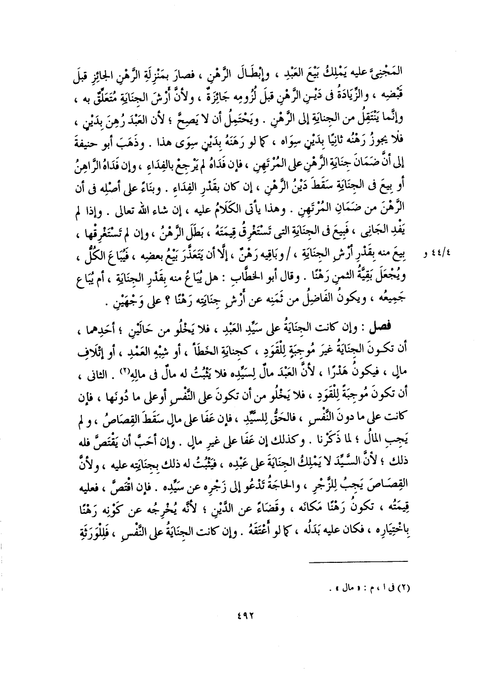 فصل: وإن كانت الجِنَايَةُ على سَيِّدِ العَبْدِ، فلا يَخْلُو من حَالَيْنِ؛ أحَدِهما، أن تكونَ الجنَايَةُ غيرَ مُوجِبَةٍ لِلْقَوَدِ، كجِنايَةِ الخَطَأ، أو شِبْهِ العَمْدِ، أو إتْلَافِ مالٍ، فيكون هَدْرًا، لأنَّ العَبْدَ مالٌ لِسَيِّدِه فلا يَثْبُتُ له مالٌ في مالِهِ (٢). الثانى، أن تكونَ مُوجِبَةً لِلْقَوَدِ، فلا يَخْلُو من أن تكونَ على النَّفْسِ أو على ما دُونَها، فإن كانت على ما دونَ النَّفْسِ، فالحَقُّ لِلسَّيِّدِ، فإن عَفَا على مالٍ سَقَطَ القِصَاصُ، ولم يَجِبِ المالُ؛ لما ذَكَرْنا. وكذلك إن عَفَا على غيرِ مالٍ. وإن أحَبَّ أن يَقْتَصَّ فله ذلك؛ لأنَّ السَّيِّدَ لا يَمْلِكُ الجِنَايَةَ على عَبْدِه، فيَثْبُتُ له ذلك بِجِنَايَتِه عليه، ولأنَّ القِصَاصَ يَجِبُ لِلزَّجْرِ، والحاجَةُ تَدْعُو إلى زَجْرِه عن سَيِّدِه. فإن اقْتَصَّ، فعليه قِيمَتُه، تكونُ رَهْنًا مَكانَه، وقَضَاءً عن الدَّيْنِ؛ لأنَّه يُخْرِجُه عن كَوْنِه رَهْنًا بِاخْتِيَارِه، فكان عليه بَدَلُه، كما لو أَعْتَقَهُ. وإن كانت الجِنَايَةُ على النَّفْسِ، فَلِلْوَرَثَةِ