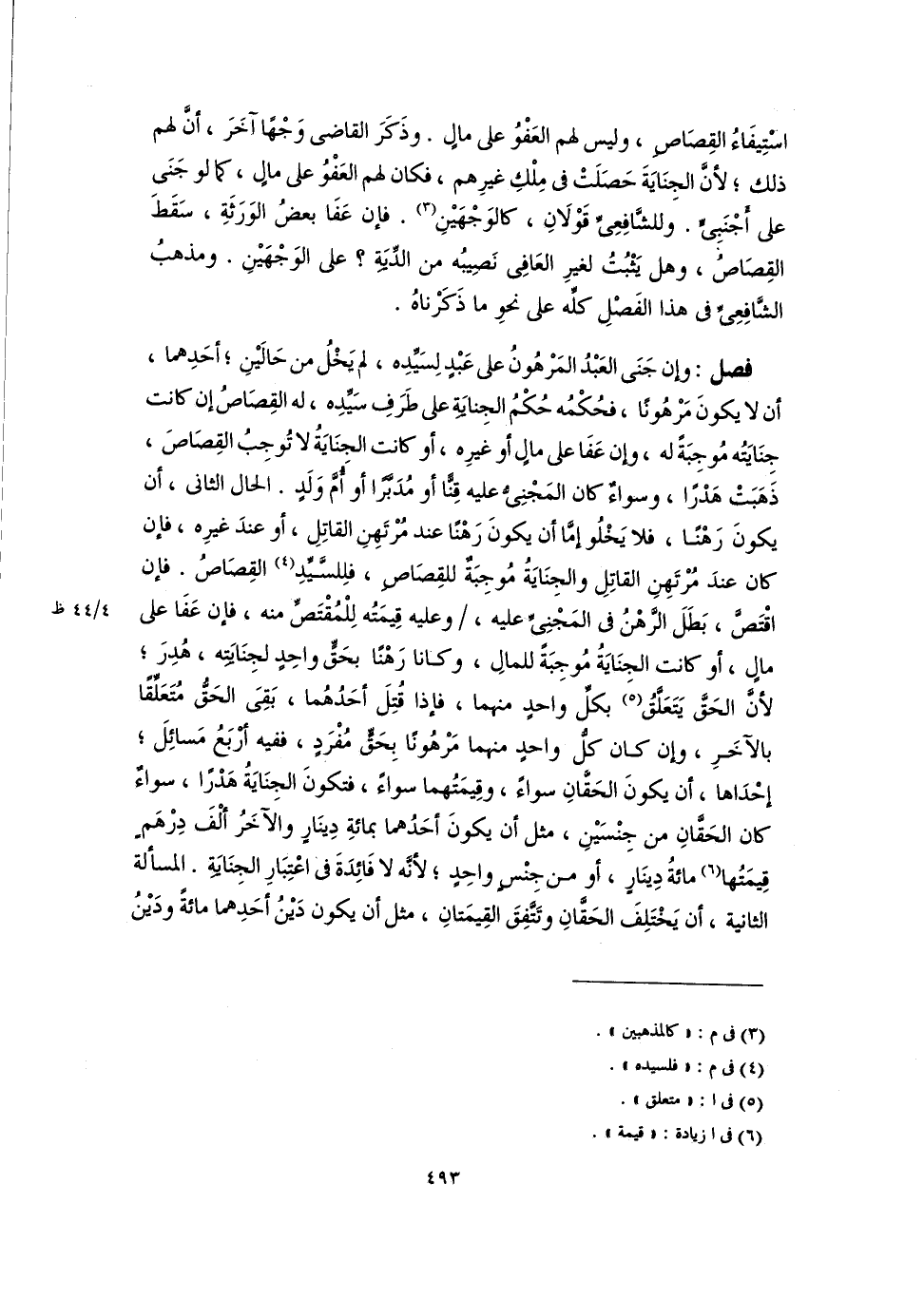 فصل: وإن جَنَى العَبْدُ المَرْهُونُ على عَبْدٍ لِسَيِّدِه، لم يَخْلُ من حَالَيْنِ؛ أحَدِهما، أن لا يكونَ مَرْهُونًا، فحُكْمُه حُكْمُ الجِنايَةِ على طَرَفِ سَيِّدِه، له القِصَاصُ إن كانت جِنَايَتُه مُوجِبَةً له، وإن عَفَا على مالٍ أو غيرِه، أو كانت الجنَايَةُ لا تُوجِبُ القِصَاصَ، ذَهَبَتْ هَدْرًا، وسواءٌ كان المَجْنِيُّ عليه قِنًّا أو مُدَبَّرًا أو أُمَّ وَلَدٍ. الحال الثانى، أن يكونَ رَهْنًا، فلا يَخْلُو إمَّا أن يكونَ رَهْنًا عند مُرْتَهِنِ القاتِلِ، أو عندَ غيرِه، فإن كان عندَ مُرْتَهِنِ القاتِلِ والجِنَايَةُ مُوجِبَةٌ للقِصَاصِ، فلِلسَّيِّدِ (٤) القِصَاصُ. فإن اقْتَصَّ، بَطَلَ الرَّهْنُ في المَجْنِيِّ عليه، وعليه قِيمَتُه لِلْمُقْتَصِّ منه، فإن عَفَا على مالٍ، أو كانت الجِنَايَةُ مُوجِبَةً للمالِ، وكانا رَهْنًا بحَقٍّ واحِدٍ لجِنَايَتِه، هُدِرَ؛ لأنَّ الحَقَّ يَتَعَلَّقُ (٥) بكلِّ واحدٍ منهما، فإذا قُتِلَ أحَدُهُما، بَقِىَ الحَقُّ مُتَعَلِّقًا بالآخَرِ، وإن كان كلُّ واحدٍ منهما مَرْهُونًا بِحَقٍّ مُفْرَدٍ، ففيه أرْبَعُ مَسائِلَ؛ إحْدَاها، أن يكونَ الحَقَّانِ سواءً، وقِيمَتُهما سواءً، فتكونَ الجِنَايَةُ هَدْرًا، سواءٌ كان الحَقَّانِ من جِنْسَيْنِ، مثل أن يكونَ أحَدُهما بمائةِ دِينَارٍ والآخَرُ ألْفَ دِرْهَمٍ قِيمَتُها (٦) مائةُ دِينَارٍ، أو من جنْسٍ واحِدٍ؛ لأنَّه لا فَائِدَةَ في اعْتِبَارِ الجِنَايَةِ. المسألة الثانية، أن يَخْتَلِفَ الحَقَّانِ وتَتَّفِقَ القِيمَتانِ، مثل أن يكون دَيْنُ أحَدِهما مائةً ودَيْنُ