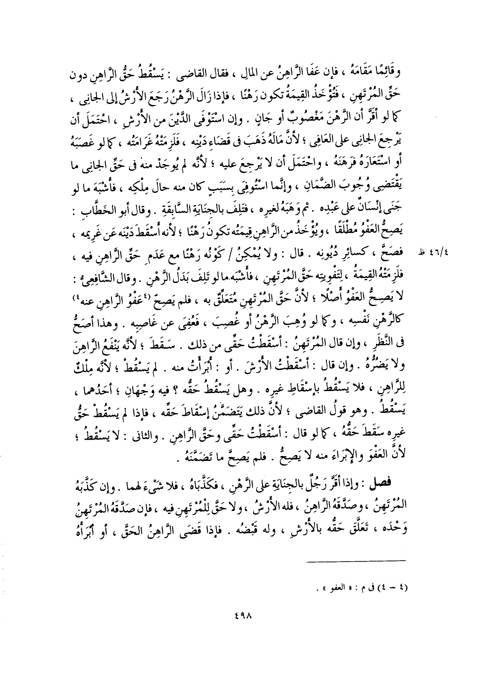 وقَائِمًا مَقَامَهُ، فإن عَفَا الرَّاهِنُ عن المالِ، فقال القاضى: يَسْقُطُ حَقُّ الرَّاهِنِ دون حَقِّ المُرْتَهِنِ، فَتُؤْخَذُ القِيمَةُ تكون رَهْنًا، فإذا زَالَ الرَّهْنُ رَجَعَ الأَرْشُ إلى الجانِى، كما لو أقَرَّ أن الرَّهْنَ مَغْصُوبٌ أو جَانٍ. وإن اسْتَوْفَى الدَّيْنَ من الأَرْشِ، احْتَمَلَ أن يَرْجِعَ الجانِى على العَافِى؛ لأنَّ مَالَهُ ذَهَبَ فى قَضَاءِ دَيْنِه، فَلَزِمَتْهُ غَرَامَتُه، كما لو غَصَبَهُ أو اسْتَعَارَهُ فرَهَنَهُ، واحْتَمَلَ أن لا يَرْجِعَ عليه؛ لأنَّه لم يُوجَدْ منه فى حَقِّ الجانِى ما يَقتَضِى وُجُوبَ الضَّمَانِ، وإنَّما اسْتُوفِىَ بِسَبَبٍ كان منه حالَ مِلْكِه، فأَشْبَهَ ما لو جَنَى إنْسَانٌ على عَبْدِه. ثمَّ وَهَبَهُ لغيرِه، فتَلِفَ بالجِنَايَةِ السَّابِقَةِ. وقال أبو الخَطَّابِ: يَصِحُّ العَفْوُ مُطْلَقًا، ويُؤْخَذُ من الرَّاهِنِ قِيمَتُه تكونُ رَهْنًا، لأنَّه أسْقَطَ دَيْنَه عَن غَرِيمه، فصَحَّ، كسائِرِ دُيُونِه. قال: ولا يُمْكِنُ كَوْنُه رَهْنًا مع عَدَمِ حَقِّ الرَّاهِنِ فيه، فلَزِمَتْهُ القِيمَةُ، لِتَفْوِيتِه حَقَّ المُرْتَهِنِ، فأشْبَه. ما لو تَلِفَ بَدَلُ الرَّهْنِ. وقال الشَّافِعِيُّ: لا يَصِحُّ العَفْوُ أَصْلًا؛ لأنَّ حَقَّ المُرْتَهِنِ مُتَعَلِّقٌ به، فلم يَصِحّ [عَفْوُ الرَّاهِنِ عنه] (٤) كالرَّهْنِ نَفْسِه، وكما لو وُهِبَ الرَّهْنُ أو غُصِبَ، فَعُفِىَ عن غَاصِبِه. وهذا أصَحُّ فى النَّظَرِ، وإن قال المُرْتَهِنُ: أسْقَطْتُ حَقِّى من ذلك. سَقَطَ؛ لأنَّه يَنْفَعُ الرَّاهِنَ ولا يَضُرُّهُ. وإن قال: أسْقَطْتُ الأَرْشَ. أو: أَبْرَأْتُ منه. لم يَسْقُطْ؛ لأنَّه مِلْكٌ لِلرَّاهِنِ، فلا يَسْقُطُ بإسْقَاطِ غيرِه. وهل يَسْقُطُ حَقُّه؟ فيه وَجْهَانِ؛ أحَدُهما، يَسْقُطُ. وهو قولُ القاضى؛ لأنَّ ذلك يَتَضَمَّنُ إسْقَاطَ حَقِّه، فإذا لم يَسْقُطْ حَقُّ غيرِه سَقَطَ حَقُّهُ، كما لو قال: أسْقَطْتُ حَقِّى وحَقَّ الرَّاهِنِ. والثانِى: لا يَسْقُطُ؛ لأنَّ العَفْوَ والإِبرَاءَ منه لا يَصِحُّ. فلم يَصِحَّ ما تَضَمَّنَهُ.