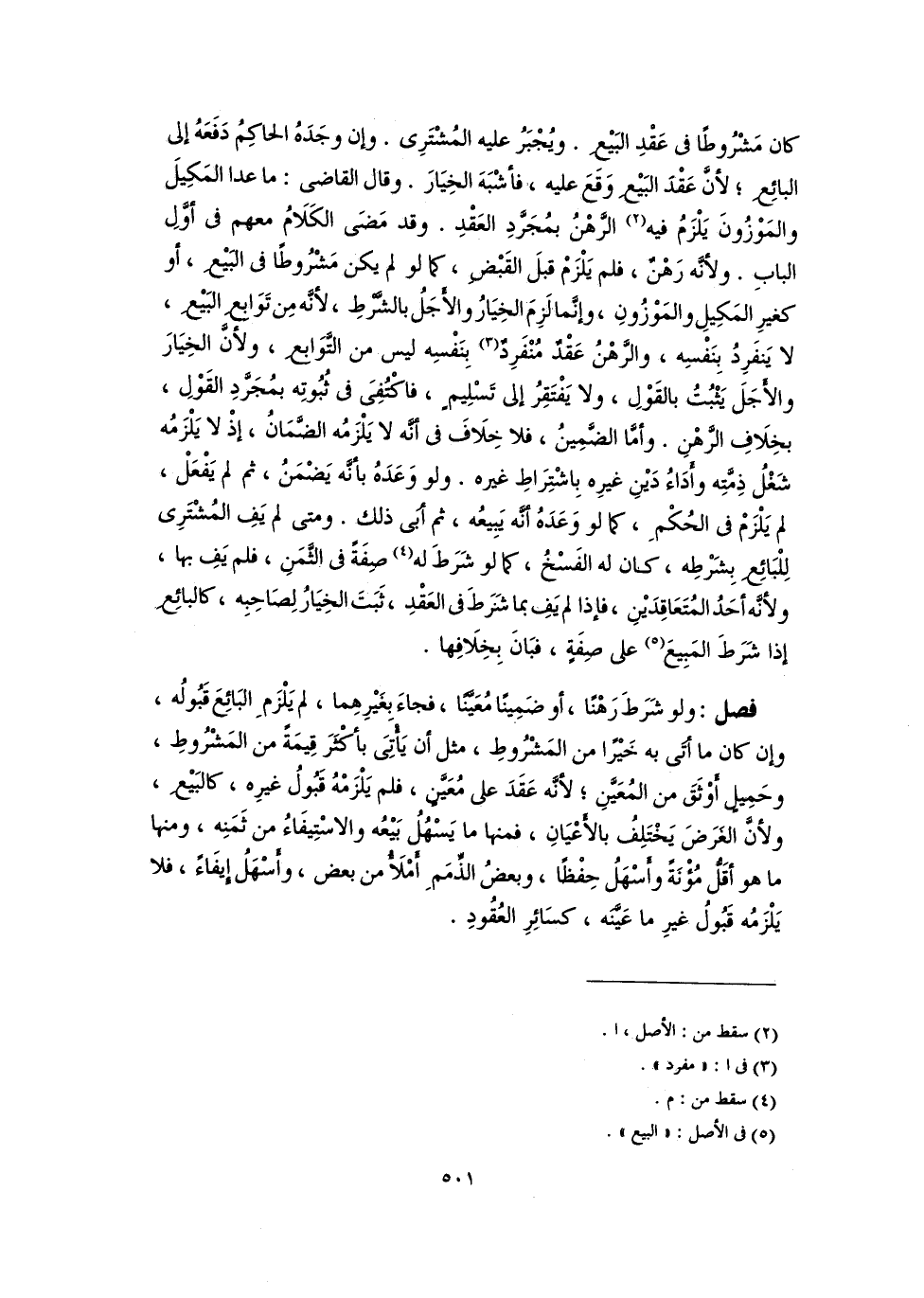 كان مَشْرُوطًا فى عَقْدِ البَيْعِ. ويُجْبَرُ عليه المُشْتَرِى. وإن وجَدَهُ الحاكِمُ دَفَعَهُ إلى البائِع؛ لأنَّ عَقْدَ البَيْعِ وَقَعَ عليه، فأشْبَهَ الخِيَارَ. وقال القاضى: ما عدا المَكِيلَ والمَوْزُونَ يَلْزَمُ فيه (٢) الرَّهْنُ بمُجَرَّدِ العَقْدِ. وقد مَضَى الكَلَامُ معهم فى أوَّلِ البابِ. ولأنَّه رَهْنٌ، فلم يَلْزَمْ قبلَ القَبْضِ، كما لو لم يكن مَشْرُوطًا فى البَيْعِ، أو كغيرِ المَكِيلِ والمَوْزُونِ، وإنَّما لَزِمَ الخِيَارُ والأجَلُ بالشَّرْطِ، لأنَّه مِن تَوَابِعِ البَيْعِ، لا يَنفَرِدُ بِنَفْسِه، والرَّهْنُ عَقْدٌ مُنْفَرِدٌ (٣) بِنَفْسِه ليس من التَّوَابِعِ، ولأنَّ الخِيَارَ والأَجَلَ يَثْبُتُ بالقَوْلِ، ولا يَفْتَقِرُ إلى تَسْلِيمٍ، فاكْتُفِىَ فى ثُبُوتِه بمُجَرَّدِ القَوْلِ، بخِلَافِ الرَّهْنِ. وأَمَّا الضَّمِينُ، فلا خِلَافَ فى أنَّه لا يَلْزَمُه الضَّمَانُ، إذْ لا يَلْزَمُه شَغْلُ ذِمَّتِه وأَدَاءُ دَيْنِ غيرِه بِاشْتِرَاطِ غيره. ولو وَعَدَهُ بأنَّه يَضْمَنُ، ثمَّ لم يَفْعَلْ، لم يَلْزَمْ فى الحُكْمِ، كما لو وَعَدَهُ أَنَّه يَبِيعُه، ثمَّ أَبَى ذلك. ومتى لم يَفِ المُشْتَرِى لِلْبَائِعِ بِشَرْطِه، كان له الفَسْخُ، كما لو شَرَطَ له (٤) صِفَةً فى الثَّمَنِ، فلم يَفِ بها، ولأنَّه أحَدُ المُتَعَاقِدَيْنِ، فإذا لم يَفِ بما شَرَطَ فى العَقْدِ، ثَبَتَ الخِيَارُ لِصَاحِبِه، كالبائِعِ إذا شَرَطَ المَبِيعَ (٥) على صِفَةٍ، فبَانَ بِخِلَافِها.