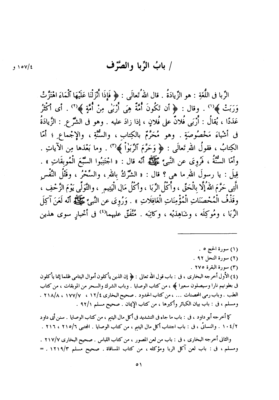 الرِّبا في اللُّغَةِ: هو الزِّيادَةُ. قال اللهُ تَعالَى: {فَإِذَا أَنْزَلْنَا عَلَيْهَا الْمَاءَ اهْتَزَّتْ وَرَبَتْ} (١). وقال: {أَنْ تَكُونَ أُمَّةٌ هِيَ أَرْبَى مِنْ أُمَّةٍ} (٢). أي أكْثَرُ عَدَدًا، يُقالُ: أَرْبَى فُلانٌ على فُلانٍ، إذا زادَ عليه. وهو في الشَّرْعِ: الزِّيادَةُ في أشْياءَ مَخْصُوصَةٍ. وهو مُحَرَّمٌ بالكِتابِ، والسُّنَّةِ، والإجْماعِ؛ أمّا الكِتابُ، فقولُ اللهِ تَعالَى: {وَحَرَّمَ الرِّبَا} (٣). وما بَعْدَها مِن الآياتِ. وأمّا السُّنَّةُ، فَرُوِيَ عن النَّبيِّ -صَلَّى اللهُ عَلَيْهِ وَسَلَّمَ- أنَّه قال: "اجْتَنِبُوا السَّبْعَ الْمُوبِقَاتِ". قِيلَ: يا رسولَ اللهِ ما هي؟ قال: "الشِّرْكُ بِاللهِ، والسِّحْرُ، وقَتْلُ النَّفْسِ الَّتِي حَرَّمَ اللهُ إلَّا بِالْحَقِّ، وأَكْلُ الرِّبَا، وأكْلُ مَالِ الْيَتِيمِ، والتَّوَلِّي يَوْمَ الزَّحْفِ، وقَذْفُ الْمُحْصَنَاتِ الْمُؤْمِنَاتِ الْغَافِلَاتِ". وَرُوِيَ عن النَّبيِّ -صَلَّى اللهُ عَلَيْهِ وَسَلَّمَ- أنّه لَعَنَ آكِلَ الرِّبَا، ومُوكِلَه، وشَاهِدَيْه، وكاتِبَه. مُتَّفَقٌ عليهما (٤) في أخْبارٍ سوى هذين