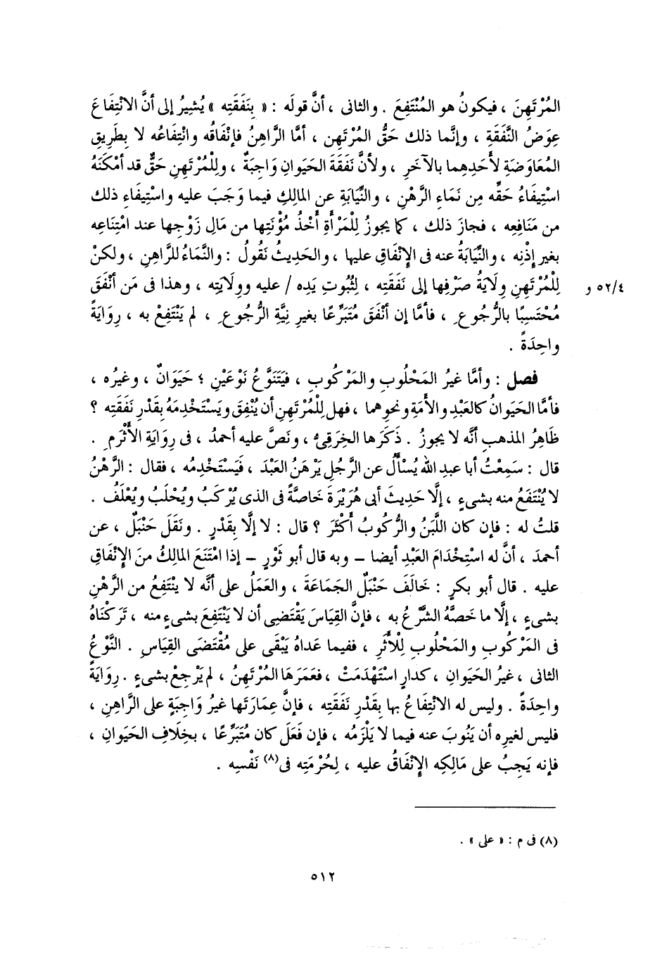 فصل: وأمَّا غيرُ المَحْلُوبِ والمَرْكُوبِ، فيَتَنَوَّعُ نَوْعَيْنِ؛ حَيَوَانٌ، وغيرُه، فأمَّا الحَيَوانُ كالعَبْدِ والأَمَةِ ونحوِهما، فهل لِلْمُرْتَهِنِ أن يُنْفِقَ ويَسْتَخْدِمَهُ بِقَدْرِ نَفَقَتِه؟ ظَاهِرُ المذهبِ أنَّه لا يجوزُ. ذَكَرَها الخِرَقِىُّ، ونَصَّ عليه أحمدُ، فى رِوَايةِ الأَثْرَمِ. قال: سَمِعْتُ أبا عبدِ اللَّه يُسْأَلُ عن الرَّجُلِ يَرْهَنُ العَبْدَ، فَيَسْتَخْدِمُه، فقال: الرَّهْنُ لا يُنْتَفَعُ منه بشىءٍ، إلَّا حَدِيثَ أبى هُرَيْرَةَ خَاصَّةً فى الذى يُرْكَبُ ويُحْلَبُ ويُعْلَفُ. قلت له: فإن كان اللَّبَنُ والرُّكُوبُ أكْثَرَ؟ قال: لا إلَّا بِقَدْرٍ. ونَقَلَ حَنْبَلٌ، عن أحمدَ، أنَّ له اسْتِخْدَامَ العَبْدِ أيضا -وبه قال أبو ثَوْرٍ- إذا امْتَنَعَ المالِكُ منَ الإنْفَاقِ عليه. قال أبو بكرٍ: خَالَفَ حَنْبَلٌ الجَمَاعَةَ، والعَمَلُ على أنَّه لا ينْتَفِعُ من الرَّهْنِ بشىءٍ، إلَّا ما خَصَّهُ الشَّرْعُ به، فإنّ القِيَاسَ يَقْتَضِى أن لا يَنْتَفِعَ بشىءٍ منه، تَرَكْنَاهُ فى المَرْكُوبِ والمَحْلُوبِ لِلأَثَرِ، ففيما عَداهُ يَبْقَى على مُقْتَضَى القِيَاسِ. النَّوْعُ الثانى، غيرُ الحَيَوانِ، كدارٍ اسْتَهْدَمَتْ، فعَمَرَهَا المُرْتَهِنُ، لم يَرْجِعْ بشىءٍ. رِوَايَةً واحِدَةً. وليس له الانْتِفَاعُ بها بِقَدْرِ نَفَقَتِه، فإنَّ عِمَارَتَها غيرُ وَاجِبَةٍ على الرَّاهِنِ، فليس لغيرِه أن يَنُوبَ عنه فيما لا يَلْزَمُه، فإن فَعَلَ كان مُتَبَرِّعًا، بخِلَافِ الحَيَوانِ، فإنه يَجِبُ على مَالِكِه الإنْفَاقُ عليه، لِحُرْمَتِه فى (٨) نَفْسِه.