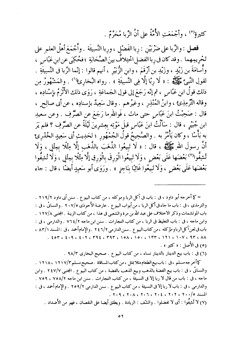 فصل: والرِّبا على ضَرْبَيْنِ: رِبا الفَضْلِ، ورِبا النَّسِيئَة. وأجْمَعَ أهلُ العلمِ على تَحْرِيمِهما. وقد كان في رِبا الفضلِ اخْتِلافٌ بينَ الصَّحَابَةِ؛ فحُكِيَ عن ابنِ عَبّاسٍ، وأُسامَةَ بن زَيْدٍ، وزَيْدِ بن أرْقَمَ، وابنِ الزُّبَيْرِ، أنهم قالوا: إنّما الرِّبا في النَّسِيئَةِ. لقولِ النَّبيِّ -صَلَّى اللهُ عَلَيْهِ وَسَلَّمَ-: "لَا رِبًا إلَّا فِي النَّسِيئَةِ". رواه البُخارِيُّ (٦). والمَشْهُورُ مِن ذلك قولُ ابنِ عَبّاسٍ، ثم إنَّه رَجَعَ إلى قولِ الجَماعَةِ، رَوَى ذلك الأثْرَمُ بإِسْنادِه، وقاله التِّرْمِذِيُّ، وابنُ المُنْذِرِ، وغيرُهم. وقال سَعِيدٌ بإسنادِه، عن أبي صالِحٍ، قال: صَحِبْتُ ابنَ عَبّاسٍ حتى ماتَ، فَواللهِ ما رَجَعَ عن الصَّرْفِ. وعن سعيدِ ابن جُبَيْرٍ، قال: سَألْتُ ابنَ عَبّاسٍ قبلَ مَوْتِه بِعِشرِينَ لَيْلَةً عن الصَّرْفِ؟ فلم يَرَ به بَأْسًا، وكان يَأْمُرُ به. والصَّحِيحُ قولُ الجُمْهُورِ، لحَدِيثِ أبي سَعِيدٍ الخُدْرِيِّ أنَّ رسولَ اللهِ -صَلَّى اللهُ عَلَيْهِ وَسَلَّمَ-، قال: "لَا تَبِيعُوا الذَّهَبَ بالذَّهَبِ إلَّا مِثْلًا بِمِثْلٍ، وَلَا تُشِفُّوا (٧) بَعْضَها عَلَى بَعْضٍ، وَلَا تَبِيعُوا الْوَرِقَ بِالْوَرِقِ إلَّا مِثْلًا بِمِثْلٍ، وَلَا تُشِفُّوا بَعْضَها عَلَى بَعْضٍ، وَلَا تَبِيعُوا غَائِبًا بِنَاجِزٍ". ورَوَى أبو سَعيِدٍ أيضًا، قال: جاء