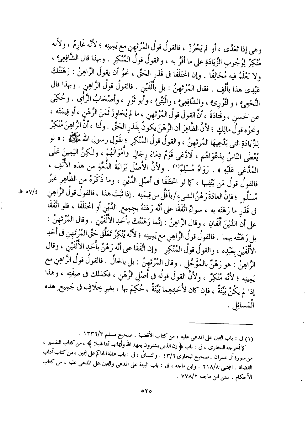 وهى إذا تَعَدَّى، أو لم يَحْرُزْ، فالقولُ قولُ المُرْتَهِنِ مع يَمِينِه؛ لأنَّه غَارِمٌ، ولأنه مُنْكِرٌ لِوُجُوبِ الزِّيَادَةِ على ما أقَرَّ به، والقولُ قولُ المُنْكِرِ. وبهذا قال الشَّافِعِىُّ، ولا نَعْلَمُ فيه مُخَالِفًا. وإن اخْتَلَفَا فى قَدْرِ الحَقِّ، نحوُ أن يقولَ الرَّاهِنُ: رَهَنْتُكَ عَبْدِى هذا بأَلْفٍ. فقال المُرْتَهِنُ: بل بَأَلْفَيْنِ. فالقولُ قولُ الرَّاهِنِ. وبهذا قال النَّخَعِىُّ، والثَّوْرِىُّ، والشَّافِعِىُّ، والْبَتِّىُّ، وأبو ثَوْرٍ، وأصْحَابُ الرَّأْىِ. وحُكِىَ عن الحسنِ، وقَتادَةَ، أنَّ القولَ قولُ المُرْتَهِنِ، ما لم يُجَاوِزْ ثَمَنَ الرَّهْنِ، أو قِيمَتَه، ونحوُه قولُ مالِكٍ؛ لأنَّ الظَّاهِرَ أن الرَّهْنَ يكونُ بقَدْرِ الحَقِّ. ولَنا، أنَّ الرَّاهِنَ مُنْكِرٌ لِلزِّيَادَةِ التى يَدَّعِيهَا المُرتَهِنُ، والقولُ قولُ المُنْكِرِ؛ لقَوْلِ رسولِ اللَّه -صَلَّى اللهُ عَلَيْهِ وَسَلَّمَ-: "لو يُعْطَى النّاسُ بِدَعْوَاهُم، لَادَّعَى قَوْمٌ دِمَاءَ رِجَالٍ وأمْوَالَهُمْ، ولكِنَّ اليَمِينَ عَلَى المُدَّعَى عَلَيْهِ". رَوَاهُ مُسْلِمٌ (١). ولأنَّ الأَصْلَ بَرَاءَةُ الذِّمَّةِ من هذه الأَلْفِ، فالقولُ قولُ مَن يَنْفِيها، كما لو اخْتَلَفَا فى أصْلِ الدَّيْنِ، وما ذَكَرَهُ من الظَّاهِرِ غيرُ مُسَلَّمٍ؛ فإنَّ العادَةَ رَهْنُ الشىءِ بأقَلَّ من قِيمَتِه. إذا ثَبَتَ هذا، فالقولُ قولُ الرَّاهِنِ فى قَدْرِ ما رَهَنَه به، سواءٌ اتَّفَقَا على أنَّه رَهَنَهُ بجمِيعِ الدَّيْنِ أو اخْتَلَفَا، فلو اتَّفَقَا على أن الدَّيْنَ أَلْفَانِ، وقال الرَّاهِنُ: إنَّما رَهَنْتُكَ بأحَدِ الأَلْفَيْنِ. وقال المُرْتَهِنُ: بل رَهَنْتُه بهما. فالقولُ قولُ الرَّاهِنِ مع يَمِينِه؛ لأنَّه يُنْكِرُ تَعَلُّقَ حَقِّ المُرْتَهِنِ فى أحَدِ الأَلْفَيْنِ بِعَبْدِه، والقولُ قولُ المُنْكِرِ. وإن اتَّفَقَا على أنَّه رَهْنٌ بأحَدِ الأَلْفَيْن، وقال الرَّاهِنُ: هو رَهْنٌ بالمُؤَجَّلِ. وقال المُرْتَهنُ: بل بالحالِّ. فالقولُ قولُ الرَّاهِنِ مع يَمِينِه؛ لأنَّه مُنْكِرٌ، ولأنَّ القولَ قولُه فى أَصْلِ الرَّهْنِ، فكذلكِ فى صِفِتِه، وهذا إذا لم يكُنْ بَيِّنَةٌ، فإن كان لأَحَدهِما بَيِّنَةٌ، حُكِمَ بها، بغيرِ خِلَافٍ فى جمِيعِ هذه الْمَسائِلِ.