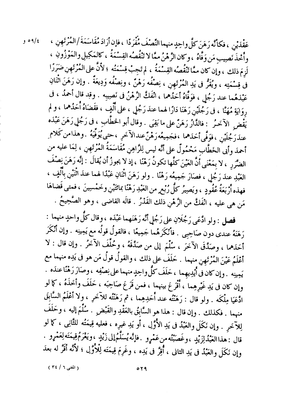 عَقْدَيْنِ، فكأنَّه رَهَنَ كلَّ واحِدٍ منهما النِّصْفَ مُفْرَدًا، فإن أرَادَ مُقَاسَمَةَ المُرْتَهِنِ، وأَخْذَ نَصِيبِ مَن وَفَّاهُ، وكان الرَّهْنُ ممَّا لا تَنْقُصُه القِسْمَةُ، كالمَكِيلِ والمَوْزُونِ، لَزِمَ ذلك، وإن كان ممَّا تَنْقُصُه القِسْمَةُ، لم تَجِبْ قِسْمَتُه؛ لأنَّ على المُرْتَهِنِ ضَرَرًا فى قِسْمَتِه، ويُقَرُّ فى يَدِ المُرْتَهِنِ، نِصْفُه رَهْنٌ، ونِصْفُه وَدِيعَةٌ. وإن رَهَنَ اثْنَانِ عَبْدَهُما عند رَجُلٍ، فوَفَّاهُ أحَدُهما، انْفَكَّ الرَّهْنُ فى نَصِيبِه. وقد قال أحمدُ، فى رِوَايَةِ مُهَنَّا، فى رَجُلَيْنِ رَهَنَا دَارًا لهما عندَ رَجُلٍ، على أَلْفٍ، فقَضَاهُ أحَدُهما، ولم يَقْضِ الآخَرُ: فالدَّارُ رَهَنٌ على ما بَقِىَ. وقال أبو الخطَّابِ، فى رَجُلٍ رَهَنَ عَبْدَه عندَ رَجُلَيْنِ، فوَفَّى أحَدَهما، فجَمِيعُه رَهْنٌ عند الآخَرِ، حتى يُوَفِّيَهُ. وهذا من كَلامِ أحمدَ وأبى الخَطَّابِ مَحْمُولٌ على أنَّه ليس لِلرَّاهِنِ مُقَاسَمَةُ المُرْتَهِنِ، لِمَا عليه من الضَّرَرِ، لا بِمَعْنَى أنَّ العَيْنَ كلَّها تكونُ رَهْنًا، إذ لا يجوزُ أن يُقالَ: إنَّه رَهَنَ نصْفَ العَبْدِ عندَ رَجُلٍ، فصَارَ جَمِيعُه رَهْنًا. ولو رَهَنَ اثْنَانِ عَبْدًا لهما عندَ اثْنَيْنِ بِأَلْفٍ، فهذه أرْبَعَةُ عُقُودٍ، ويَصِيرُ كلُّ رُبْعٍ من العَبْدِ رَهْنًا بمائتَيْنِ وخَمْسِينَ، فمتى قَضاهَا مَن هى عليه، انْفَكَّ من الرَّهْنِ ذلك القَدْرُ. قالَه القاضى، وهو الصَّحِيحُ.