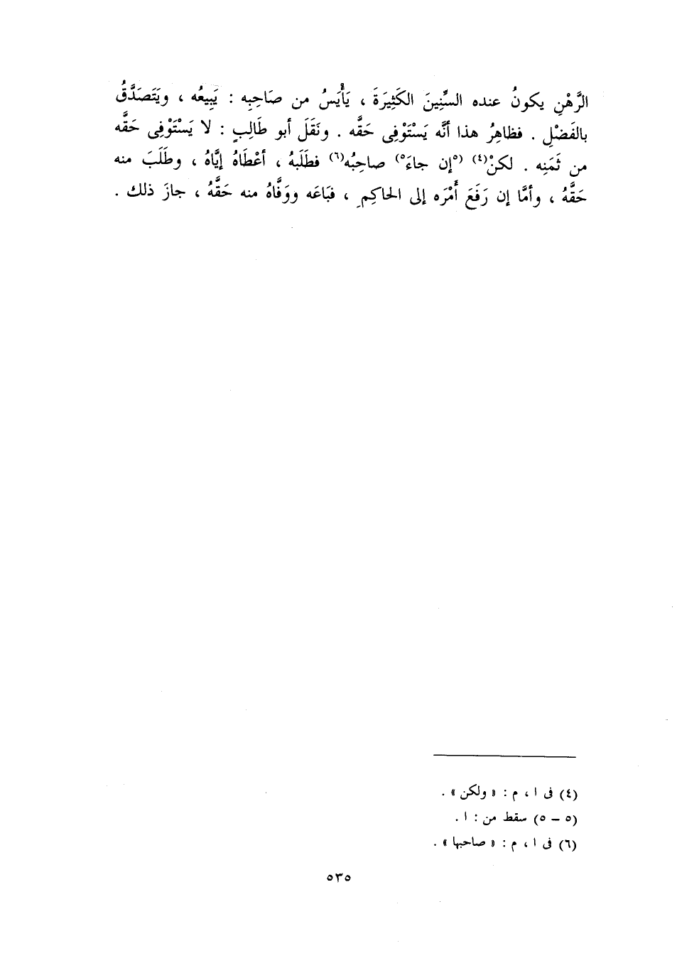 الرَّهْنِ يكونُ عنده السِّنِينَ الكَثِيرَةَ، يَأْيَسُ من صَاحِبِه: يَبِيعُه، ويَتَصَدَّقُ بالفَضْلِ. فظاهِرُ هذا أنَّه يَسْتَوْفِى حَقَّه. ونَقَلَ أبو طَالِبٍ: لا يَسْتَوْفِى حَقَّه من ثَمَنِه. لكنْ (٤) [إن جاءَ] (٥) صاحِبُه (٦) فطَلَبهُ، أعْطَاهُ إيَّاهُ، وطَلَبَ منه حَقَّهُ، وأمَّا إن رَفَعَ أمْرَه إلى الحاكِمِ، فبَاعَه ووَفَّاهُ منه حَقَّهُ، جازَ ذلك.