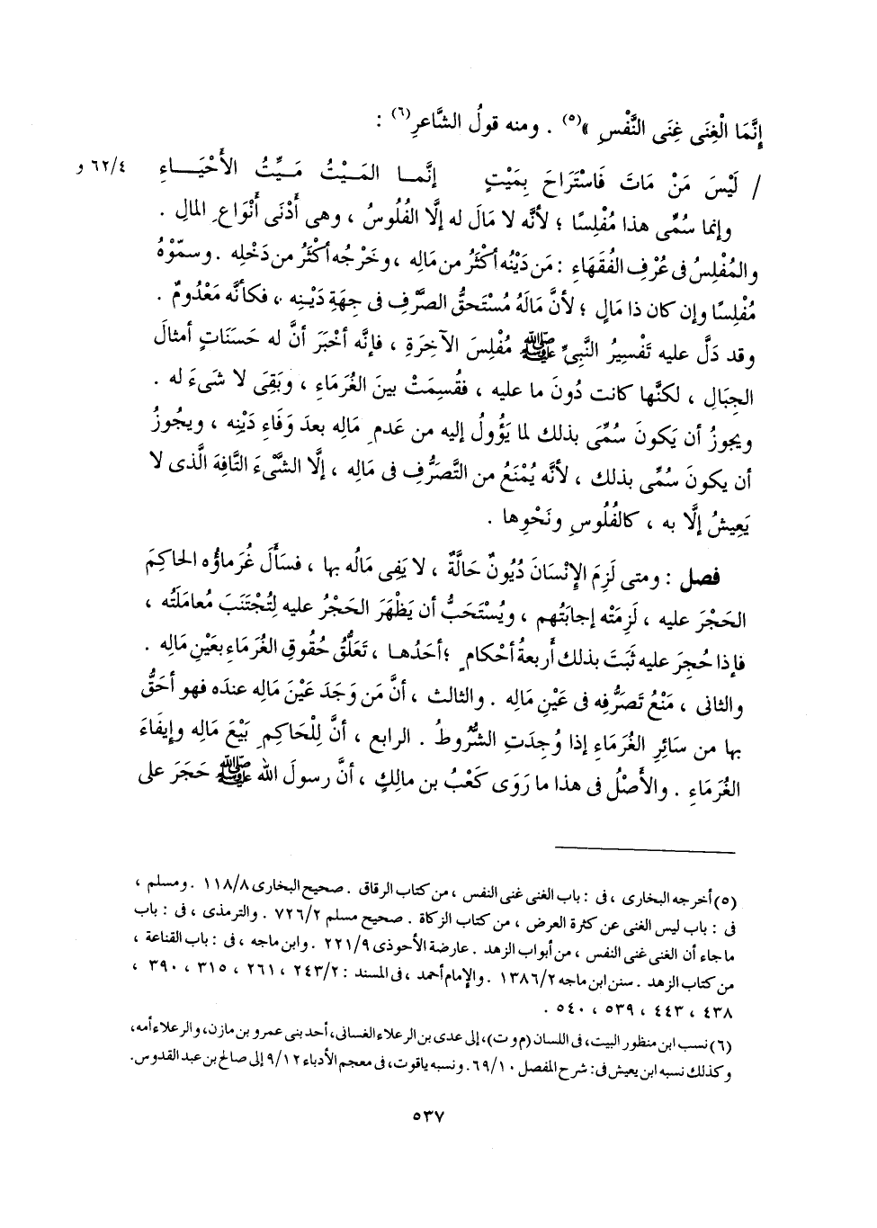 إنَّمَا الْغِنَى غِنَى النَّفْسِ" (٥). ومنه قولُ الشَّاعرِ (٦):