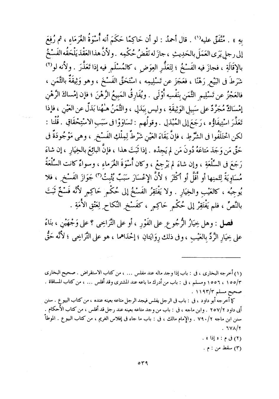 بِهِ". مُتَّفَقٌ عليه (١). قال أحمدُ: لو أن حَاكِمًا حَكَمَ أنه أُسْوَةُ الغُرَمَاءِ، ثم رُفِعَ إلى رجلٍ يَرَى العَمَلَ بالحَدِيثِ، جازَ له نَقْضُ حُكْمِه. ولأنَّ هذا العَقْدَ يَلْحَقُه الفَسْخُ بالإِقَالَةِ، فجازَ فيه الفَسْخُ، لِتَعَذُّرِ العِوَضِ، كالمُسْلَمِ فيه إذا تَعَذَّرَ. ولأنه لو (٢) شَرَطَ فى البَيْعِ رَهْنًا، فعَجَزَ عن تَسْلِيمِه، اسْتَحَقَّ الفَسْخَ، وهو وَثِيقَةٌ بالثَّمَنِ، فالعَجْزُ عن تَسْلِيمِ الثَّمَنِ بِنَفْسِه أَوْلَى. ويُفَارِقُ المَبِيعُ الرَّهْنَ؛ فإن إمْساكَ الرَّهْنِ إمْسَاكٌ مُجَرَّدٌ على سَبِيلِ الوَثِيقَةِ، وليس بِبَدَلٍ، والثَّمَنُ هاهُنا بَدَلٌ عن العَيْنِ، فإذا تَعَذَّرَ اسْتِيفَاؤُه، رَجَعَ إلى المُبْدَلِ. وقولُهم: تَسَاوَوْا فى سَبَبِ الاسْتِحْقَاقِ. قُلْنا: لكن اخْتَلَفُوا فى الشَّرْطِ، فإنَّ بَقَاءَ العَيْنِ شَرْطٌ لِمِلْكِ الفَسْخِ، وهى مَوْجُودَةٌ فى حَقِّ مَن وَجَدَ مَتاعَهُ دُونَ مَن لم يَجِدْه. إذا ثَبَتَ هذا، فإنَّ البائِعَ بالخِيَارِ، إن شاءَ رَجَعَ فى السِّلْعَةِ، وإن شاءَ لم يَرْجِعْ، وكان أُسْوَةَ الغُرَماءِ، وسواءٌ كانت السِّلْعَةُ مُسَاوِيَةً لِثَمنِها أو أقَلَّ أو أكْثَرَ؛ لأنَّ الإِعْسَارَ سَبَبٌ يُثْبِتُ (٣) جَوَازَ الفَسْخِ، فلا يُوجِبُه، كالعَيْبِ والخِيَارِ. ولا يَفْتَقِرُ الفَسْخُ إلى حُكْمِ حَاكِمٍ لأنَّه فَسْخٌ ثَبَتَ بالنَّصِّ، فلم يَفْتَقِرْ إلى حُكْمِ حَاكِمٍ، كفَسْخِ النِّكاحِ لِعَتْقِ الأَمَةِ.
