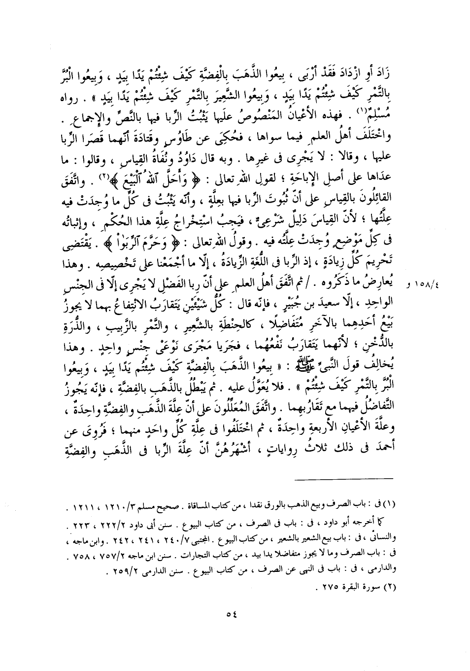 زَادَ أوِ ازْدَادَ فَقَدْ أرْبَى، بِيعُوا الذَّهَبَ بِالْفِضَّةِ كَيْفَ شِئْتُمْ يَدًا بِيَدٍ، وَبِيعُوا الْبُرَّ بِالتَّمْرِ كَيْفَ شِئْتُمْ يَدًا بِيَدٍ، وَبِيعُوا الشَّعِيرَ بِالتَّمْرِ كَيْفَ شِئْتُمْ يَدًا بِيَدٍ". رواه مُسْلِمٌ (١). فهذه الأعْيانُ المَنْصُوصُ علَيها يَثْبُتُ الرِّبا فيها بالنَّصِّ والإجماعِ. واخْتَلَفَ أهلُ العلمِ فيما سواها، فحُكِىَ عن طَاوُسٍ وقَتادَةَ أنَّهما قَصَرا الرِّبا عليها، وقالا: لا يَجْرِي في غيرِها. وبه قال دَاوُدُ ونُفَاةُ القِياسِ، وقالوا: ما عدَاها على أصلِ الإباحَةِ؛ لقولِ اللهِ تعالى: {وَأَحَلَّ اللَّهُ الْبَيْعَ} (٢). واتَّفَقَ القائِلُونَ بالقِياسِ على أنّ ثُبُوتَ الرِّبا فيها بعِلَّةٍ، وأنه يَثْبُتُ في كُلِّ ما وُجِدَتْ فيه عِلَّتُها؛ لأنّ القِياسَ دَلِيلٌ شَرْعِيٌّ، فيَجِبُ اسْتِخْراجُ عِلَّةِ هذا الحُكْمِ، وإثباتُه في كلِّ مَوْضِعٍ وُجِدَتْ عِلَّتُه فيه. وقولُ اللهِ تعالى: {وَحَرَّمَ الرِّبَا}. يَقْتَضِي تَحْرِيمَ كُلِّ زِيادَةٍ، إذ الرِّبا في اللُّغَةِ الزِّيادَةُ، إلّا ما أجْمَعْنا على تَخْصِيصِه. وهذا يُعارِضُ ما ذَكَرُوه. ثم اتَّفَقَ أهلُ العلمِ على أنّ رِبا الفَضْلِ لا يَجْرِى إلّا في الجِنْسِ الواحِدِ، إلّا سعيدَ بن جُبَيْرٍ، فإنّه قال: كُلُّ شَيْئَيْنِ يَتَقارَبُ الانْتِفاعُ بهما لا يجوزُ بَيْعُ أحَدِهِما بالآخَرِ مُتَفَاضِلًا، كالحِنْطَةِ بالشَّعِيرِ، والتَّمْرِ بالزَّبِيبِ، والذُّرَةِ بالدُّخْنِ؛ لأنّهما يَتَقارَبُ نَفْعُهُما، فجَرَيا مَجْرَى نَوْعَيْ جِنْسٍ واحِدٍ. وهذا يُخالِفُ قولَ النَّبيِّ -صَلَّى اللهُ عَلَيْهِ وَسَلَّمَ-: "بِيعُوا الذَّهَبَ بِالْفِضَّةِ كَيْفَ شِئْتُم يَدًا بِيَدٍ، وَبِيعُوا الْبُرَّ بِالتَّمْرِ كَيْفَ شِئْتُمْ". فلا يُعَوَّلُ عليه. ثم يَبْطُلُ بالذَّهَبِ بالفِضَّةِ، فإنّه يَجُوزُ التَّفاضُلُ فيهما مع تَقَارُبهِما. واتَّفَقَ المُعَلِّلُونَ على أنّ عِلَّةَ الذَّهَبِ والفِضَّةِ واحِدَةٌ، وعلَّةَ الأعْيانِ الأربعةِ واحِدَةٌ، ثم اخْتَلَفُوا في عِلَّةِ كُلِّ واحَدٍ منهما؛ فَرُوِىَ عن أحمدَ في ذلك ثلاثُ رِواياتٍ، أشْهَرُهُنَّ أنّ عِلَّةَ الرِّبا في الذَّهَبِ والفِضَّةِ