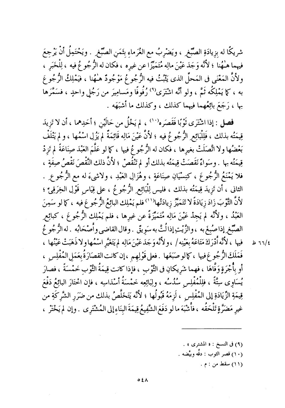 فصل: إذا اشْتَرَى ثَوْبًا فَقَصَره (١٠)، لم يَخْلُ من حَالَيْنِ؛ أحَدِهما، أن لا تَزِيدَ قِيمَتُه بذلك، فَلِلْبَائِعِ الرُّجُوعُ فيه؛ لأنَّ عَيْنَ مَالِه قَائِمَةٌ لم يَزُلِ اسْمُها، ولم يَتْلَفْ بَعْضُها ولا اتَّصَلَتْ بغيرِها، فكان له الرُّجُوعُ فيها، كما لو عَلَّمَ العَبْدَ صِنَاعَةً لم تَزِدْ قِيمَتُه بها. وسَواءٌ نَقَصَتْ قِيمَتُه بذلك أو لم تَنْقُصْ؛ لأنَّ ذلك النَّقْصَ نَقْصُ صِفَةٍ، فلا يَمْنَعُ الرُّجُوعَ، كنِسْيَانِ صِنَاعَةٍ، وهُزَالِ العَبْدِ، ولا شىءَ له مع الرُّجُوعِ. الثانى، أن تَزِيدَ قِيمَتُه بذلك، فليس لِلْبَائِعِ الرُّجُوعُ، على قِيَاسِ قَوْلِ الخِرَقِىِّ؛ لأنَّ الثَّوْبَ زَادَ زِيَادَةً لا تَتَمَيَّزُ زِيادَتُها (١١) فلم يَمْلِك البائِعُ الرُّجُوعَ فيه، كما لو سَمِنَ العَبْدُ، ولأنَّه لم يَجِدْ عَيْنَ مَالِه مُتَمَيِّزَةً عن غيرِها، فلم يَمْلِك الرُّجُوعَ، كبائِعِ الصِّبْغِ إذا صُبغَ به، والزَّيْتِ إذا لُتَّ به سَوِيقٌ. وقال القاضى وأَصْحَابُه. له الرُّجُوعُ فيها، لأنَّه أدْرَكَ مَتَاعَهُ بِعَيْنِه، ولأنَّه وَجَدَ عَيْنَ مَالِه لم يَتَغَيَّرِ اسْمُها ولا ذَهَبَتْ عَيْنُها، فَمَلَكَ الرُّجُوعَ فيها، كما لو صَبَغَها. فعلى قَوْلِهِم، إن كانت القصَارَةُ بِعَمَلِ المُفْلِسِ، أو بِأُجْرَةٍ وَفَّاهَا، فهما شَرِيكانِ فى الثَّوْبِ، فإذا كانت قِيمَةُ الثَّوْبِ خَمْسَةً، فصارَ يُسَاوِى سِتَّةً، فلِلْمُفْلِسِ سُدُسُه، ولِبَائِعِه خَمْسَةُ أسْدَاسِه، فإن اخْتَارَ البائِعُ دَفْعَ قِيمَةِ الزِّيَادَةِ إلى المُفْلِسِ، لَزِمَهُ قَبُولُها؛ لأنَّه يَتَخَلَّصُ بذلك من ضَرَرِ الشَّرِكَةِ من غيرِ مَضَرَّةٍ تَلْحَقُه، فأشْبَهَ ما لو دَفَعَ الشَّفِيعُ قِيمَةَ البِنَاءِ إلى المُشْتَرِى. وإن لم يَخْتَرْ،