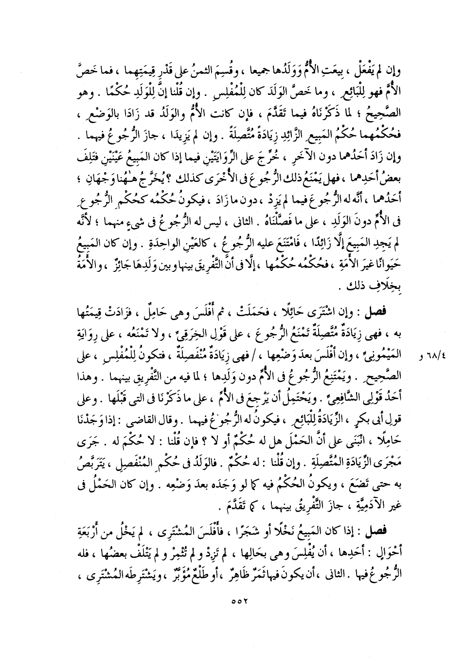 فصل: وإن اشْتَرَى حَائِلًا، فحَمَلَتْ، ثم أَفْلَسَ وهى حَامِلٌ، فزَادَتْ قِيمَتُها به، فهى زِيَادَةٌ مُتَّصِلَةٌ تَمْنَعُ الرُّجُوعَ، على قَوْلِ الخِرَقِىِّ، ولا تَمْنَعُه، على رِوَايَةِ المَيْمُونِىِّ، وإن أفْلَسَ بعدَ وَضْعِها، فهى زِيَادَةٌ مُنْفَصِلَةٌ، فتكونُ لِلْمُفْلِسِ، على الصَّحِيحِ. ويَمْتَنِعُ الرُّجُوعُ فى الأُمِّ دون وَلَدِها؛ لما فيه من التَّفْرِيقِ بينهما. وهذا أحَدُ قَوْلِى الشَّافِعىِّ. ويَحْتَمِلُ أن يَرجِعَ فى الأُمِّ، على ما ذَكَرْنَا فى التى قَبْلَها. وعلى قولِ أبى بكرٍ، الزِّيَادَةُ لِلْبَائِعِ، فيكونُ له الرُّجُوعُ فيهما. وقال القاضى: إذا وَجَدْنَا حَامِلًا، انْبَنَى على أنَّ الحَمْلَ هل له حُكْمٌ أو لا؟ فإن قُلْنا: لا حُكْمَ له. جَرَى مَجْرَى الزِّيَادَةِ المُتَّصِلَةِ. وإن قُلْنا: له حُكْمٌ. فالوَلَدُ فى حُكْمِ المُنْفَصِلِ، يَتَرَبَّصُ به حتى تَضَعَ، ويكونُ الحُكْمُ فيه كما لو وَجَدَه بعدَ وَضْعِه. وإن كان الحَمْلُ فى غير الآدَمِيَّةِ، جازَ التَّفْرِيقُ بينهما، كما تَقَدَّمَ.