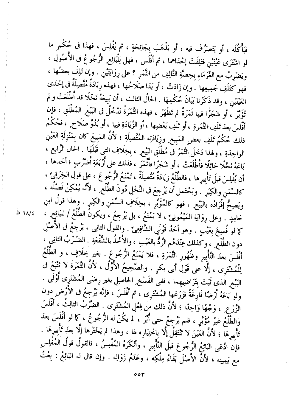 فيَأْكُلَه، أو يَتَصَرَّفَ فيه، أو يَذْهَبَ بِجَائِحَةٍ، ثم يُفْلِسَ، فهذا فى حُكْمِ ما لو اشْتَرَى عَيْنَيْنِ فتَلِفَتْ إحْدَاهما، ثم أفْلَس، فهل لِلْبَائِعِ الرُّجُوعُ فى الأُصُولِ، ويَضْرِبُ مع الغُرَمَاءِ بِحِصَّةِ التَّالِفِ من الثَّمَرِ؟ على رِوَايَتَيْنِ. وإن تَلِفَ بعضُها، فهو كتَلَفِ جَمِيعِها. وإن زَادَتْ، أو بَدَا صَلَاحُها، فهذه زِيَادَةٌ مُتَّصِلَةٌ فى إحْدَى العَيْنَيْنِ، وقد ذَكَرْنا بَيَانَ حُكْمِهَا. الحالُ الثالث، أن يَبِيعَهُ نَخْلًا قد أطْلَعَتْ ولم تُؤَبَّرْ، أو شَجَرًا فيها ثَمَرَةٌ لم تَظْهَرْ، فهذه الثَّمَرَةُ تَدْخُلُ فى البَيْعِ المُطْلَقِ، فإن أفْلَسَ بعدَ تَلَفِ الثَّمَرةِ، أو تَلَفِ بَعْضِها، أو الزِّيَادَةِ فيها، أو بُدُوِّ صَلَاحٍ، فحُكْمُ ذلك حُكْمُ تَلَفِ بعضِ المَبِيعِ وزِيَادَتِه المُتَّصِلَةِ؛ لأنَّ المَبِيعَ كان بِمَنْزِلَةِ العَيْنِ الواحِدَةِ، ولهذا دَخَلَ الثَّمَرُ فى مُطْلَقِ البَيْعِ، بِخِلَافِ التى قَبْلَهَا. الحال الرَّابع، بَاعَهُ نَخْلًا حَائِلًا فأطْلَعَتْ، أو شَجَرًا فأَثْمَرَ، فذلك على أَرْبَعَةِ أضْرُبٍ، أحَدها، أن يُفْلِسَ قبلَ تَأْبِيرِها، فالطَّلْعُ زيَادَةٌ مُتَّصِلَةٌ، تَمْنَعُ الرُّجُوعَ، على قولِ الخِرَقِىِّ، كالسِّمَنِ والكِبَرِ. ويَحْتَمل أن يَرْجِعَ فى النَّخْلِ دُونَ الطَّلْعِ، لأنَّه يُمْكِنُ فَصْلُه، ويَصِحُّ إفْرَادُه بالبَيْعِ، فهو كالمُؤَبَّرِ، بخِلَافِ السِّمَنِ والكِبَرِ. وهذا قولُ ابنِ حَامِدٍ. وعلى رِوَايَةِ المَيْمُونِىِّ، لا يَمْنَعُ، بل يَرْجِعُ، ويكونُ الطَّلْعُ للبَائِعِ، كما لو فُسِخَ بِعَيْبٍ. وهو أحَدُ قَوْلَى الشَّافِعِىِّ. والقولُ الثانِى، يَرْجِعُ فى الأَصْلِ دون الطَّلْعِ، وكذلك عِنْدَهُم الرَّدُّ بالعَيْبِ، والأخْذُ بالشُّفْعَةِ. الضَّرْبُ الثانِى، أفْلَسَ بعدَ التَّأْبيرِ وظُهُورِ الثَّمَرَةِ، فلا يَمْنَعُ الرُّجُوعَ. بغير خِلَافٍ، والطَّلْعُ لِلْمُشْتَرِى، إلَّا على قَوْلِ أبى بكرٍ. والصَّحِيحُ الأَوَّلُ، لأنَّ الثَّمَرَةَ لا تَتْبَعُ فى البَيْعِ الذى ثَبَتَ بِتَرَاضِيهِما، ففى الفَسْخِ الحاصِلِ بغير رِضَى المُشْتَرِى أوْلَى. ولو بَاعَهُ أرْضًا فَارِغَةً فزَرَعَها المُشْتَرِى، ثم أفْلَسَ، فإنَّه يَرْجِعُ فى الأرْضِ دون الزَّرْعِ، وَجْهًا وَاحِدًا؛ لأنَّ ذلك من فِعْلِ المُشْتَرِى. الضَّرْبُ الثالِثُ، أفْلَسَ والطَّلْعُ غيرُ مُؤَبَّرٍ، فلم يَرْجِعْ حتى أُبِّرَ، لم يكُنْ له الرُّجُوعُ، كما لو أفْلَسَ بعدَ تَأْبِيرِهَا؛ لأنَّ العَيْنَ لا تَنْتَقِلُ إلَّا بِاخْتِيَارِه لها، وهذا لم يَخْتَرْها إلَّا بعدَ تَأْبِيرِهَا. فإن ادَّعَى البَائِعُ الرُّجُوعَ قبلَ التَّأْبِيرِ، وأنْكَرَهُ المُفْلِسُ، فالقولُ قولُ المُفْلِسِ مع يَمِينِه؛ لأنَّ الأَصْلَ بَقَاءُ مِلْكِه، وعَدَمُ زَوَالِه. وإن قال له البَائِعُ: بِعْتُ