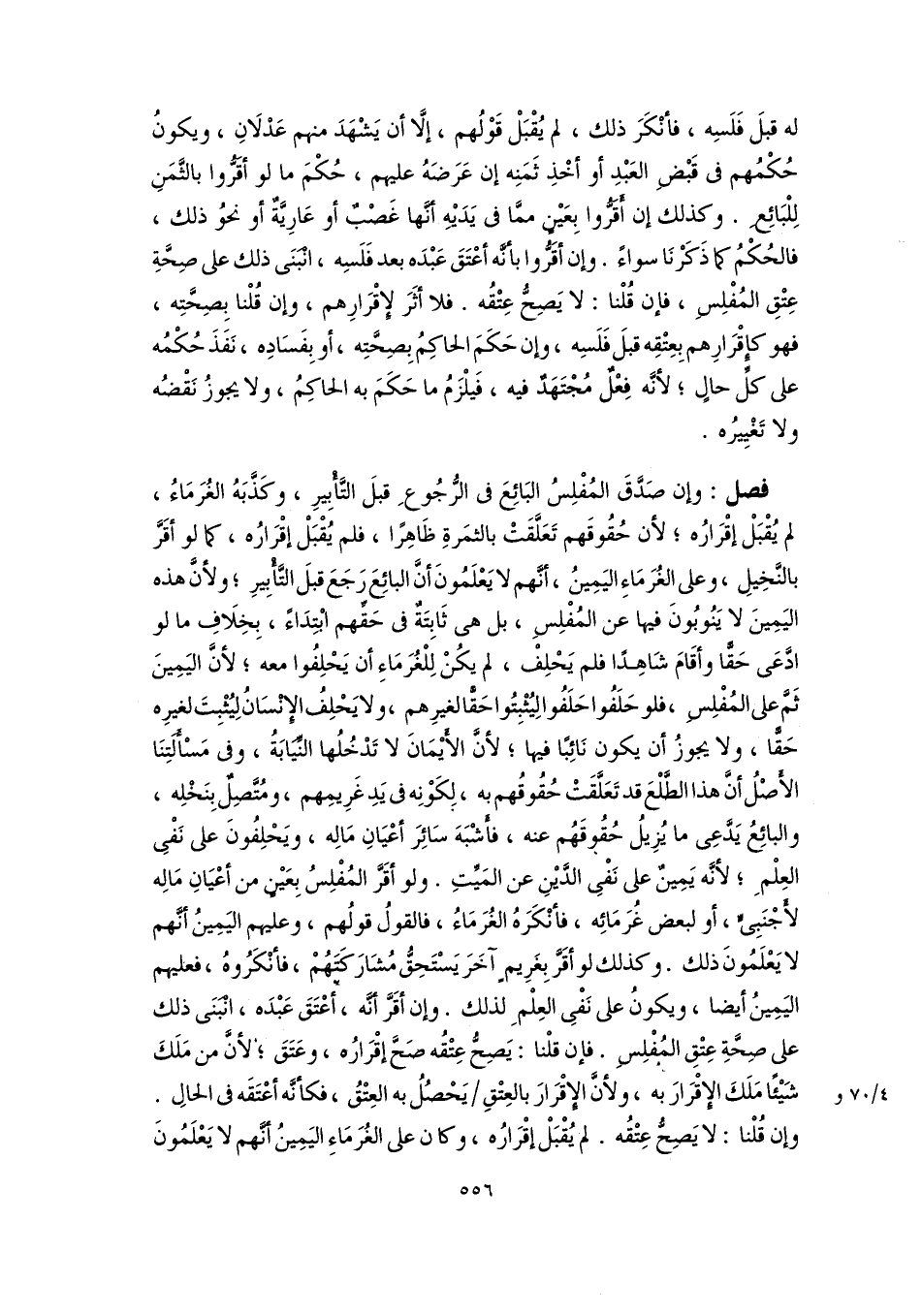 له قبلَ فَلَسِه، فأنْكَرَ ذلك، لم يُقْبَلْ قَوْلُهم، إلَّا أن يَشْهَدَ منهم عَدْلَانِ، ويكونُ حُكْمُهم فى قَبْضِ العَبْدِ أو أخْذِ ثَمَنِه إن عَرَضَهُ عليهم، حُكْمَ ما لو أقَرُّوا بالثَّمَنِ لِلْبَائِعِ. وكذلك إن أَقَرُّوا بِعَيْنٍ ممَّا فى يَدَيْهِ أنَّها غَصْبٌ أو عَارِيَّةٌ أو نحوُ ذلك، فالحُكْمُ كما ذَكَرْنَا سواءً. وإن أقَرُّوا بأنَّه أعْتَقَ عَبْدَه بعد فَلَسِه، انْبَنَى ذلك على صِحَّةِ عِتْقِ المُفْلِسِ، فإن قُلْنا: لا يَصِحُّ عِتْقُه. فلا أثَرَ لإقْرَارِهم، وإن قُلْنا بِصِحَّتِه، فهو كإقْرَارِهم بِعِتْقِه قبلَ فَلَسِه، وإن حَكَمَ الحاكِمُ بِصِحَّتِه، أو بِفَسَادِه، نَفَذَ حُكْمُه على كلِّ حالٍ؛ لأنَّه فِعْلٌ مُجْتَهَدٌ فيه، فَيلْزَمُ ما حَكَمَ به الحاكِمُ، ولا يجوزُ نَقْضُه ولا تَغْيِيرُه.
