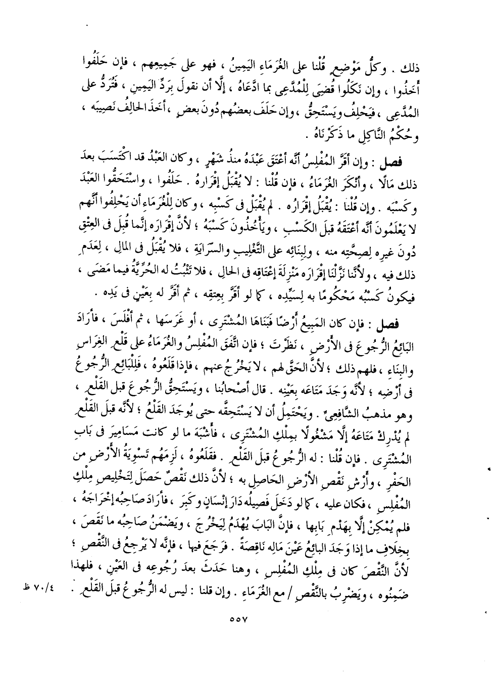 فصل: فإن كان المَبِيعُ أَرْضًا فَبَنَاهَا المُشْتَرِى، أو غَرَسَها، ثم أفْلَسَ، فأرَادَ البَائِعُ الرُّجُوعَ فى الأَرْضِ، نَظَرْتَ؛ فإن اتَّفَقَ المُفْلِسُ والغُرَمَاءُ على قَلْعِ الغِرَاسِ والبِنَاءِ، فلهم ذلك؛ لأنَّ الحَقَّ لهم، لا يَخْرُجُ عنهم، فإذا قَلَعُوهُ، فَلِلْبَائِعِ الرُّجُوعُ فى أَرْضِه؛ لأنَّه وَجَدَ مَتَاعَه بِعَيْنِه. قال أصْحابُنا، ويَسْتَحِقُّ الرُّجُوعَ قبل القَلْعِ، وهو مذهبُ الشَّافِعِىِّ. ويَحْتَمِلُ أن لا يَسْتَحِقَّه حتى يُوجَدَ القَلْعُ؛ لأنَّه قبلَ القَلْعِ لم يُدْرِكْ مَتَاعَهُ إلَّا مَشْغُولًا بمِلْكِ المُشْتَرِى، فأشْبَهَ ما لو كانت مَسَامِيرَ فى بَابِ المُشْتَرِى. فإن قُلْنا: له الرُّجُوعُ قبلَ القَلْعِ. فقَلَعُوهُ، لَزِمَهُم تَسْوِيَةُ الأرْضِ من الحَفْرِ، وأرْشِ نَقْصِ الأرْضِ الحَاصِلِ به؛ لأنَّ ذلك نَقْصٌ حَصَلَ لِتَخْلِيصِ مِلْكِ المُفْلِسِ، فكان عليه، كما لو دَخَلَ فَصِيلُه دَارَ إنْسَانٍ وكَبِرَ، فأرَادَ صَاحِبُه إخْرَاجَهُ، فلم يُمْكِنْ إلَّا بِهَدْمِ بَابِها، فإنَّ البَابَ يُهْدَمُ لِيَخْرُجَ، ويَضْمَنُ صَاحِبُه ما نَقَصَ، بِخِلَافِ ما إذا وَجَدَ البائِعُ عَيْنَ مَالِه نَاقِصَةً. فرَجَعَ فيها، فإنَّه لا يَرْجِعُ فى النَّقْصِ؛ لأنَّ النَّقْصَ كان فى مِلْكِ المُفْلِسِ، وهنا حَدَثَ بعدَ رُجُوعِه فى العَيْنِ، فلهذا ضَمِنُوه، ويَضْرِبُ بالنَّقْصِ مع الغُرَمَاءِ. وإن قلنا: ليس له الرُّجُوعُ قبلَ القَلْعِ.