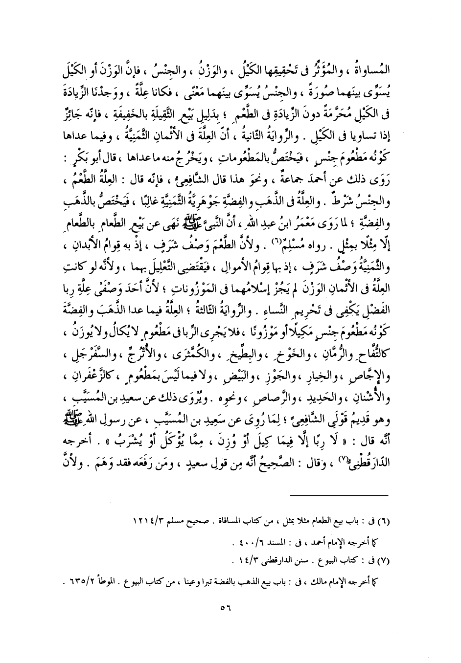 المُساواةُ، والمُؤَثِّرُ في تَحْقِيقِها الكَيْلُ، والوَزْنُ، والجِنْسُ، فإنَّ الوَزْنَ أو الكَيْلَ يُسَوِّي بينَهما صُورَةً، والجِنْسُ يُسَوِّي بينَهما مَعْنًى، فكانا عِلَّةً، ووَجدْنَا الزِّيادَةَ في الكَيْلِ مُحَرَّمَةً دونَ الزِّيادَةِ في الطَّعْمِ؛ بِدَلِيلِ بَيْعِ الثَّقِيلَةِ بالخَفِيفَةِ، فإنّه جَائِزٌ إذا تساويا في الكَيْلِ. والرِّوايَةُ الثّانيةُ، أن العِلَّةَ في الأثْمانِ الثَّمَنِيَّةُ، وفيما عداها كَوْنُه مَطْعُومَ جِنْسٍ، فيَخْتَصُّ بالمَطْعُوماتِ، ويَخْرُجُ منه ما عداها، قال أبو بَكْرٍ: رَوَى ذلك عن أحمدَ جماعةٌ، ونحوَ هذا قال الشَّافِعِيُّ، فإنّه قال: العِلَّةُ الطَّعْمُ، والجِنْسُ شَرْطٌ. والعِلَّةُ في الذَّهَبِ والفِضَّةِ جَوْهَرِيَّةُ الثَّمَنِيَّةِ غالِبًا، فَيَخْتَصُّ بالذَّهَبِ والفِضَّةِ؛ لما رَوَى مَعْمَرُ ابنُ عبدِ اللهِ، أنَّ النَّبيَّ -صَلَّى اللهُ عَلَيْهِ وَسَلَّمَ- نَهَى عن بَيْعِ الطَّعامِ بالطَّعامِ إلّا مِثْلًا بمِثْلٍ. رواه مُسْلِمٌ (٦). ولأنَّ الطَّعْمَ وَصْفُ شَرَفٍ، إذْ به قِوامُ الأبدانِ، والثَّمَنِيَّةُ وَصْفُ شَرَفٍ، إذ بها قِوامُ الأموالِ، فيَقْتَضِي التَّعْلِيلَ بهما، ولأنَّه لو كانتِ العِلَّةُ في الأثْمانِ الوَزْنَ لم يَجُزْ إسْلامُهما في المَوْزُوناتِ؛ لأنَّ أحَدَ وَصْفَيْ عِلَّةِ رِبا الفَضْلِ يَكفي في تَحْرِيمِ النَّساءِ. والرِّوايَةُ الثّالثةُ؛ العِلَّةُ فيما عدا الذَّهَبَ والفِضَّةَ كَوْنُه مَطْعُومَ جِنْسٍ مَكِيلًا أو مَوْزُونًا، فلا يَجْرِى الرِّبا في مَطْعُومٍ لا يُكالُ ولا يُوزَنُ، كالتُّفَّاحِ والرُّمَّانِ، والخَوْخِ، والبِطِّيخِ، والكُمَّثرَى، والأُتْرُجِّ، والسَّفَرْجَلِ، والإجَّاصِ، والخِيارِ، والجَوْزِ، والبَيْضِ، ولا فيما لَيْسَ بمَطْعُومٍ، كالزَّعْفَرانِ، والأُشْنانِ، والحَدِيدِ، والرَّصاصِ، ونحوِه. ويُرْوَى ذلك عن سعيدِ بن المُسَيَّبِ، وهو قَدِيمُ قَوْلَيِ الشَّافِعِيِّ؛ لِمَا رُوِيَ عن سَعِيدِ بن المُسَيَّبِ، عن رسولِ اللهِ -صَلَّى اللهُ عَلَيْهِ وَسَلَّمَ- أنَّه قال: "لَا رِبًا إلا فِيمَا كِيلَ أوْ وُزِنَ، مِمَّا يُؤْكَلُ أوْ يُشْرَبُ". أخرجه الدّارَقُطْنِيُّ (٧)، وقال: الصَّحِيحُ أنَّه مِن قولِ سعيدٍ، ومَن رَفَعَه فقد وَهَمَ. ولأنَّ