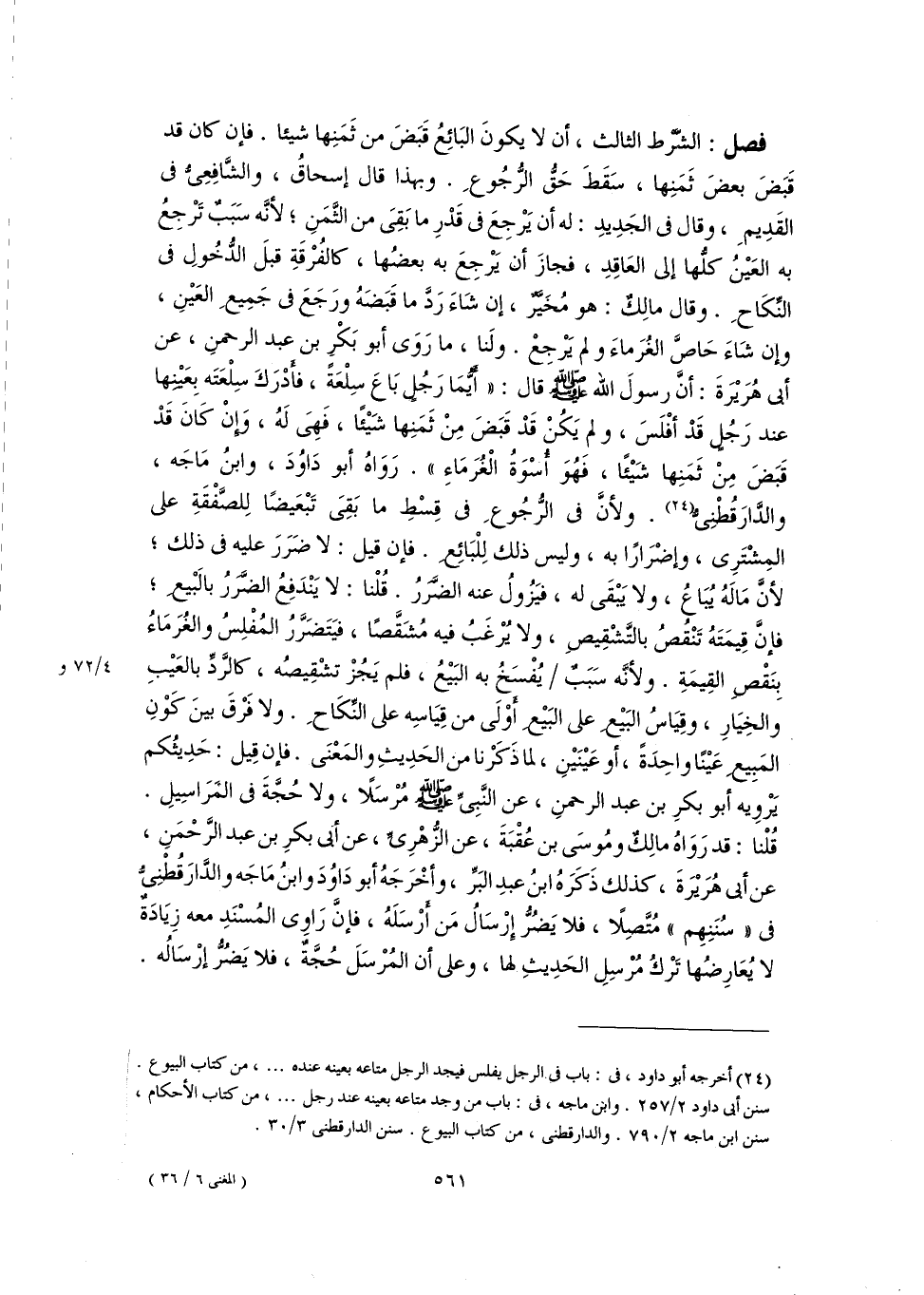 فصل: الشَّرْط الثالث، أن لا يكونَ البَائِعُ قَبَضَ من ثَمَنِها شيئا. فإن كان قد قَبَضَ بعضَ ثَمَنِها، سَقَطَ حَقُّ الرُّجُوعِ. وبهذا قال إسحاقُ، والشَّافِعِىُّ فى القَدِيمِ، وقال فى الجَدِيدِ: له أن يَرْجِعَ فى قَدْرِ ما بَقِىَ من الثَّمَنِ؛ لأنَّه سَبَبٌ تَرْجِعُ به العَيْنُ كلُّها إلى العَاقِدِ، فجازَ أن يَرْجِعَ به بعضُها، كالفُرْقَةِ قبلَ الدُّخُولِ فى النِّكَاحِ. وقال مالِكٌ: هو مُخَيَّرٌ، إن شَاءَ رَدَّ ما قَبَضَهُ ورَجَعَ فى جَمِيعِ العَيْنِ، وإن شَاءَ حَاصَّ الغُرَماءَ ولم يَرْجِعْ. ولَنا، ما رَوَى أبو بَكْرِ بن عبد الرحمنِ، عن أبى هُرَيْرَةَ: أنَّ رسولَ اللَّه -صَلَّى اللهُ عَلَيْهِ وَسَلَّمَ- قال: "أَيُّمَا رَجُلٍ بَاعَ سِلْعَةً، فأَدْرَكَ سِلْعَتَه بِعَيْنِها عند رَجُلٍ قَدْ أفْلَسَ، ولم يَكُنْ قَدْ قَبَضَ مِنْ ثَمَنِها شَيْئًا، فَهِىَ لَهُ، وَإنْ كَانَ قَدْ قَبَضَ مِنْ ثَمَنِها شَيْئًا، فَهُوَ أُسْوَةُ الْغُرَمَاءِ". رَوَاهُ أبو دَاوُدَ، وابنُ مَاجَه، والدَّارَقُطْنِىُّ (٢٤). ولأنَّ فى الرُّجُوعِ فى قِسْطِ ما بَقِىَ تَبْعِيضًا لِلصَّفْقَةِ على المُشْتَرِى، وإضْرَارًا به، وليس ذلك لِلْبَائِعِ. فإن قيل: لا ضَرَرَ عليه فى ذلك؛ لأنَّ مَالَهُ يُبَاعُ، ولا يَبْقَى له، فيَزُولُ عنه الضَّرَرُ. قُلْنا: لا يَنْدَفِعُ الضَّرَرُ بالبَيْعِ؛ فإنَّ قِيمَتَهُ تَنقُصُ بالتَّشْقِيصِ، ولا يُرْغَبُ فيه مُشَقَّصًا، فيَتَضَرَّرُ المُفْلِسُ والغُرَمَاءُ بِنَقْصِ القِيمَةِ. ولأنَّه سَبَبٌ يُفْسَخُ به البَيْعُ، فلم يَجُزْ تشْقِيصُه، كالرَّدِّ بالعَيْبِ والخِيَارِ، وقِيَاسُ البَيْعِ على البَيْعِ أوْلَى من قِيَاسِه على النِّكَاحِ. ولا فَرْقَ بينَ كَوْنِ المَبِيعِ عَيْنًا واحِدَةً، أو عَيْنَيْنِ، لما ذَكَرْنا من الحَدِيثِ والمَعْنَى. فإن قِيل: حَدِيثُكم يَرْوِيه أبو بكرِ بن عبد الرحمنِ، عن النَّبِىِّ -صَلَّى اللهُ عَلَيْهِ وَسَلَّمَ- مُرْسَلًا، ولا حُجَّةَ فى المَرَاسِيلِ. قُلْنا: قد رَوَاهُ مالِكٌ ومُوسَى بن عُقْبَةَ، عن الزُّهْرِىِّ، عن أبى بكرِ بن عبد الرَّحْمَنِ، عن أبى هُرَيْرَةَ، كذلك ذَكَرَه ابنُ عبدِ البَرِّ، وأخْرَجَهُ أبو دَاوُدَ وابنُ مَاجَه والدَّارَقُطْنِىُّ فى "سُنَنِهِم" مُتَّصِلًا، فلا يَضُرُّ إِرْسَالُ مَن أَرْسَلَهُ، فإنَّ رَاوِى المُسْنَدِ معه زِيَادَةٌ لا يُعَارِضُها تَرْكُ مُرْسِلِ الحَدِيثِ لها، وعلى أن المُرْسَلَ حُجَّةٌ، فلا يَضُرُّ إرْسَالُه.