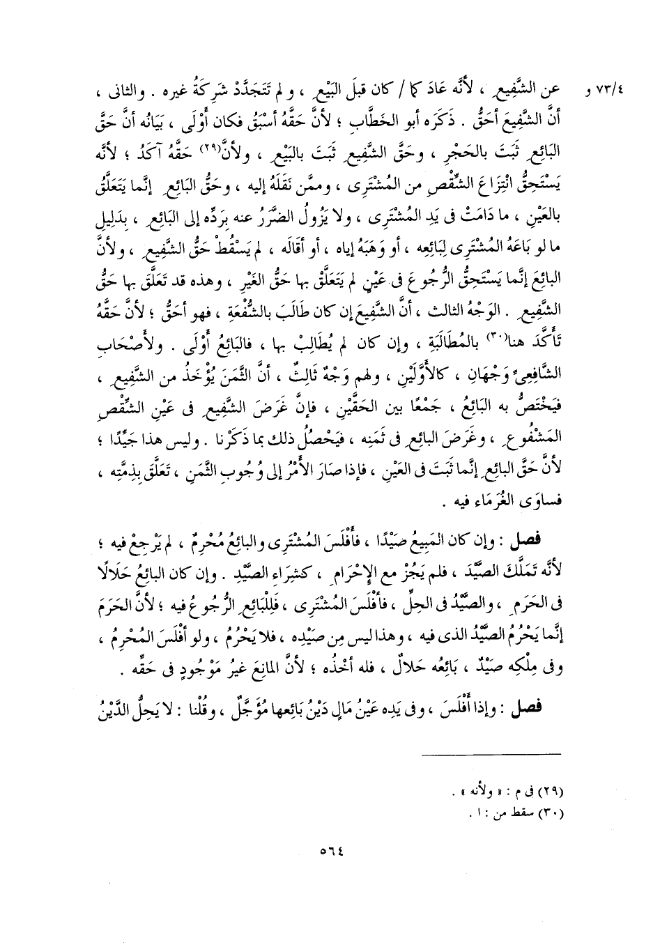عن الشَّفِيعِ، لأنَّه عَادَ كما كان قبلَ البَيْعِ، ولم تَتَجَدَّدْ شَرِكَةُ غيره. والثانى، أنَّ الشَّفِيعَ أحَقُّ. ذَكَرَه أبو الخَطَّابِ؛ لأنَّ حَقَّهُ أسْبَقُ فكان أَوْلَى، بَيَانُه أنَّ حَقَّ البَائِعِ ثَبَتَ بالحَجْرِ، وحَقَّ الشَّفِيعِ ثَبَتَ بالبَيْعِ، ولأنَّ (٢٩) حَقَّهُ آكَدُ؛ لأنَّه يَسْتَحِقُّ انْتِزَاعَ الشِّقْصِ من المُشْتَرِى، وممَّن نَقَلَهُ إليه، وحَقُّ البَائِعِ إنَّما يَتَعَلَّقُ بالعَيْنِ، ما دَامَتْ فى يَدِ المُشْتَرِى، ولا يَزُولُ الضَّرَرُ عنه بِرَدِّه إلى البَائِعِ، بِدَلِيلِ ما لو بَاعَهُ المُشْتَرِى لِبَائِعِه، أو وَهَبَهُ إياه، أو أقَالَه، لم يَسْقُطْ حَقُّ الشَّفِيعِ، ولأنَّ البائِعَ إنَّما يَسْتَحِقُّ الرُّجُوعَ فى عَيْنٍ لم يَتَعَلَّقْ بها حَقُّ الغَيْرِ، وهذه قد تَعَلَّقَ بها حَقُّ الشَّفِيعِ. الوَجْهُ الثالث، أنَّ الشَّفِيعَ إن كان طَالَبَ بالشُّفْعَةِ، فهو أحَقُّ، لأنَّ حَقَّهُ تَأَكَّدَ هنا (٣٠) بالمُطَالَبَةِ، وإن كان لم يُطَالِبْ يها، فالبَائِعُ أَوْلَى. ولأَصْحَابِ الشَّافِعِىِّ وَجْهَانِ، كالأَوَّلَيْنِ، ولهم وَجْهٌ ثَالِثٌ، أنَّ الثَّمَنَ يُؤْخَذُ من الشَّفِيعِ، فيَخْتَصُّ به البَائِعُ، جَمْعًا بين الحَقَّيْنِ، فإنَّ غَرَضَ الشَّفِيعِ فى عَيْنِ الشِّقْصِ المَشْفُوعِ، وغَرَضَ البائِعِ فى ثَمَنِه، فيَحْصُلُ ذلك بما ذَكَرْنا. وليس هذا جَيِّدًا، لأنَّ حَقَّ البائِعِ إنَّما ثَبَتَ فى العَيْنِ، فإذا صَارَ الأَمْرُ إلى وُجُوبِ الثَّمَنِ، تَعَلَّقَ بِذِمَّتِه، فساوَى الغُرَمَاء فيه.