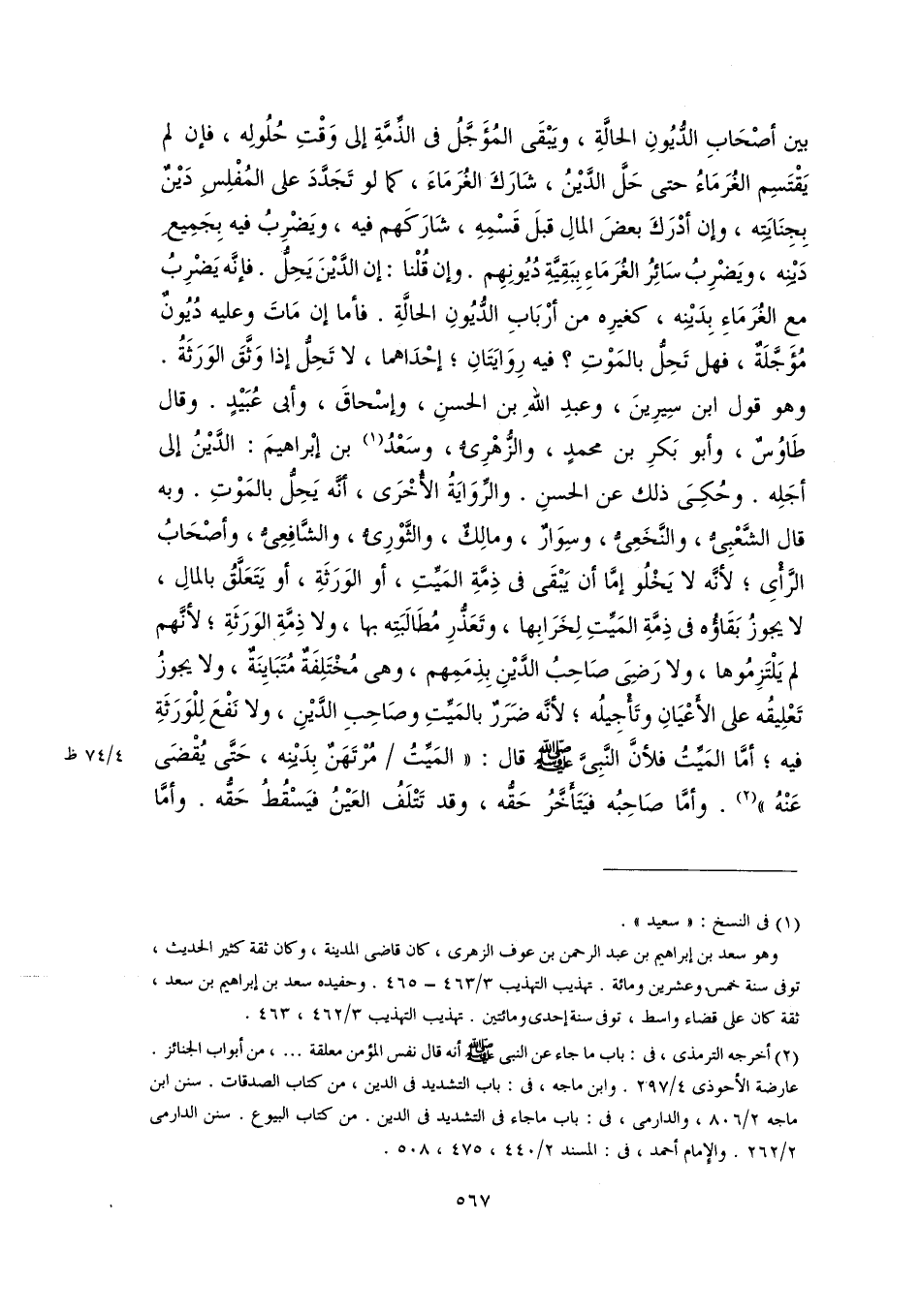بين أصْحَابِ الدُّيُونِ الحالَّةِ، ويَبْقَى المُؤَجَّلُ فى الذِّمَّةِ إلى وَقْتِ حُلُولِه، فإن لم يَقْتَسِم الغُرَمَاءُ حتى حَلَّ الدَّيْنُ، شَارَكَ الغُرَمَاءَ، كما لو تَجَدَّدَ على المُفْلِسِ دَيْنٌ بِجِنَايَتِه، وإن أدْرَكَ بعضَ المالِ قبلَ قَسْمِهِ، شَارَكَهم فيه، ويَضْرِبُ فيه بِجَمِيعِ دَيْنِه، ويَضْرِبُ سَائِرُ الغُرَمَاءِ بِبَقِيَّةِ دُيُونِهِم. وإن قُلْنا: إن الدَّيْنَ يَحِلُّ. فإنَّه يَضْرِبُ مع الغُرَمَاءِ بِدَيْنِه، كغيرِه من أرْبَابِ الدُّيُونِ الحالَّةِ. فأما إن مَاتَ وعليه دُيُونٌ مُؤَجَّلَةٌ، فهل تَحِلُّ بالمَوْتِ؟ فيه رِوَايَتَانِ، إحْدَاهما، لا تَحِلُّ إذا وَثَّقَ الوَرَثَةُ. وهو قول ابن سِيرِينَ، وعبدِ اللهِ بن الحسنِ، وإسْحاقَ، وأبى عُبَيْدٍ. وقال طَاوُسٌ، وأبو بَكرِ بن محمدٍ، والزُّهْرِىُّ، وسَعْدُ (١) بن إبْراهيمَ: الدَّيْنُ إلى أجَلِه. وحُكِىَ ذلك عن الحسنِ. والرِّوَايَةُ الأُخْرَى، أنَّه يَحِلُّ بالمَوْتِ. وبه قال الشَّعْبِىُّ، والنَّخَعِىُّ، وسِوَارٌ، ومالِكٌ، والثَّوْرِىُّ، والشَّافِعِىُّ، وأصْحَابُ الرَّأْىِ، لأنَّه لا يَخْلُو إمَّا أن يَبْقَى فى ذِمَّةِ المَيِّتِ، أو الوَرَثَةِ، أو يَتَعَلَّقُ بالمالِ، لا يجوزُ بَقَاؤُه فى ذِمَّةِ المَيِّتِ لِخَرَابِها، وتَعَذُّرِ مُطَالَبَتِه بها، ولا ذِمَّةِ الوَرَثَةِ؛ لأنَّهم لم يَلْتَزِمُوها، ولا رَضِىَ صَاحِبُ الدَّيْنِ بِذِمَمِهم، وهى مُخْتَلِفَةٌ مُتَبَايِنَةٌ، ولا يجوزُ تَعْلِيقُه على الأَعْيَانِ وتَأْجِيلُه؛ لأنَّه ضَرَرٌ بالمَيِّتِ وصَاحِبِ الدَّيْنِ، ولا نَفْعَ لِلْوَرَثَةِ فيه؛ أمَّا المَيِّتُ فلأنَّ النَّبِىَّ -صَلَّى اللهُ عَلَيْهِ وَسَلَّمَ- قال: "المَيِّتُ مُرْتَهَنٌ بِدَيْنِه، حَتَّى يُقْضَى عَنْهُ" (٢). وأمَّا صَاحِبُه فيَتَأَخَّرُ حَقُّه، وقد تَتْلَفُ العَيْنُ فيَسْقُطُ حَقُّه. وأمَّا