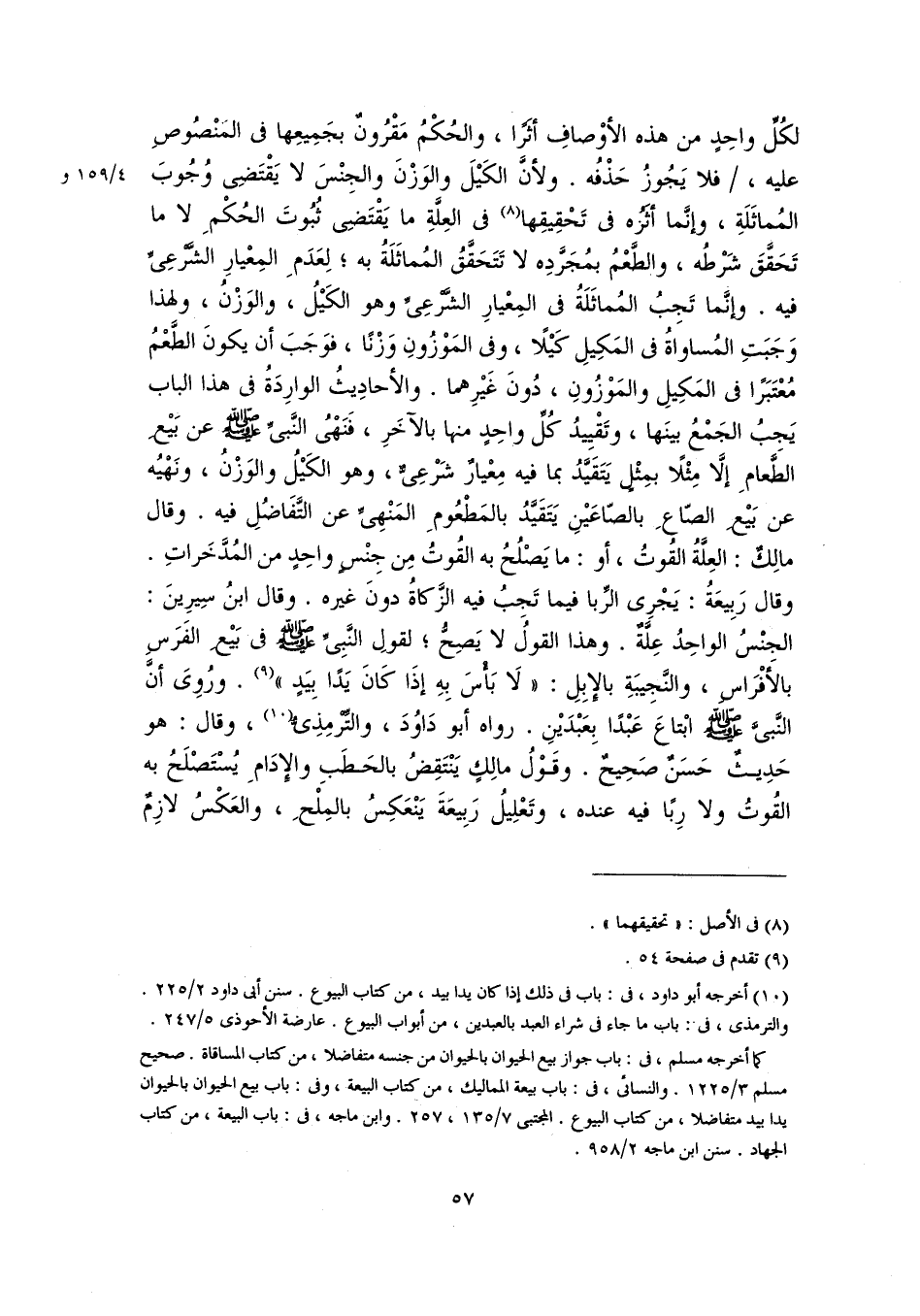 لكُلِّ واحِدٍ من هذه الأوْصافِ أثَرًا، والحُكْمُ مَقْرُونٌ بجَمِيعِها في المنْصُوصِ عليه، فلا يَجُوزُ حَذْفُه. ولأنَّ الكَيْلَ والوَزْنَ والجِنْسَ لا يَقْتَضِي وُجُوبَ المُماثَلَةِ، وإنَّما أثَرُه في تَحْقِيقِها (٨) في العِلَّةِ ما يَقْتَضِي ثُبُوتَ الحُكْمِ لا ما تَحَقَّقَ شَرْطُه، والطَّعْمُ بمُجَرَّدِه لا تَتَحَقَّقُ المُماثَلَةُ به؛ لِعَدَمِ المِعْيارِ الشَّرعِيِّ فيه. وإنَّما تَجِبُ المُماثَلَةُ في المِعْيارِ الشَّرعِيِّ وهو الكَيْلُ، والوَزْنُ، ولهذا وَجَبَتِ المُساواةُ في المَكِيلِ كَيْلًا، وفي المَوْزُونِ وَزْنًا، فوَجَبَ أن يكونَ الطَّعْمُ مُعْتَبَرًا في المَكِيلِ والمَوْزُونِ، دُونَ غَيْرِهما. والأحادِيثُ الوارِدَةُ في هذا الباب يَجِبُ الجَمْعُ بينَها، وتَقْيِيدُ كُلِّ واحِدٍ منها بالآخَرِ، فَنَهْيُ النَّبيِّ -صَلَّى اللهُ عَلَيْهِ وَسَلَّمَ- عن بَيْعِ الطَّعامِ إلَّا مِثْلًا بمِثْلٍ يَتَقَيَّدُ بما فيه مِعْيارٌ شَرْعِيٌّ، وهو الكَيْلُ والوَزْنُ، ونَهْيُه عن بَيْعِ الصّاعِ بالصّاعَيْنِ يَتَقَيَّدُ بالمَطْعُومِ المَنْهِيِّ عن التَّفَاضُلِ فيه. وقال مالِكٌ: العِلَّةُ القُوتُ، أو: ما يَصْلُحُ به القُوتُ مِن جِنْسٍ واحِدٍ من المُدَّخَراتِ. وقال رَبِيعَةُ: يَجْرِى الرِّبا فيما تَجِبُ فيه الزَّكاةُ دونَ غيره. وقال ابنُ سِيرِينَ: الجِنْسُ الواحِدُ عِلَّةٌ. وهذا القولُ لا يَصِحُّ؛ لقولِ النَّبِيِّ -صَلَّى اللهُ عَلَيْهِ وَسَلَّمَ- في بَيْع الفَرَسِ بالأفْرَاسِ، والنَّجِيبَةِ بالإبِلِ: "لَا بَأْسَ بِهِ إذَا كَانَ يَدًا بِيَدٍ" (٩). ورُوِيَ أنَّ النَّبيَّ -صَلَّى اللهُ عَلَيْهِ وَسَلَّمَ- ابْتاعَ عَبْدًا بِعَبْدَيْنِ. رواه أبو دَاوُدَ، والتِّرْمِذِيُّ (١٠)، وقال: هو حَدِيثٌ حَسَنٌ صَحِيحٌ. وقَوْلُ مالِكٍ يَنْتَقِضُ بالحَطَبِ والإدَامِ يُسْتَصْلَحُ به القُوتُ ولا رِبًا فيه عنده، وتَعْلِيلُ رَبِيعَةَ يَنْعَكِسُ بالمِلْحِ، والعَكْسُ لازِمٌ