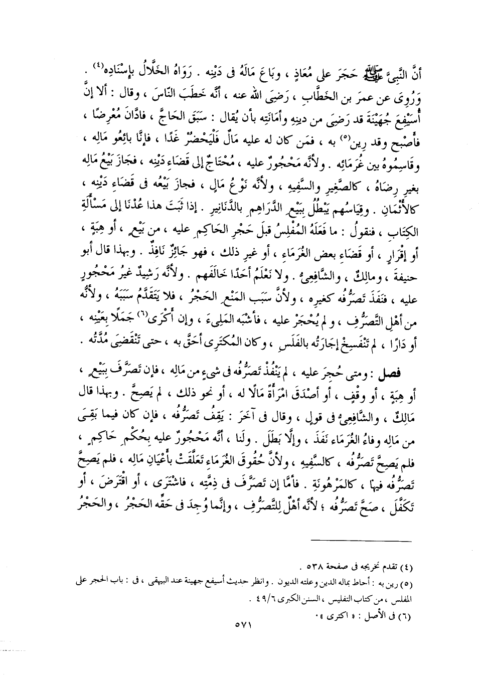 أنَّ النَّبِيَّ -صَلَّى اللهُ عَلَيْهِ وَسَلَّمَ- حَجَرَ على مُعَاذٍ، وبَاعَ مَالَهُ في دَيْنِه. رَوَاهُ الخَلَّالُ بإِسْنَادِه (٤). وَرُوِيَ عن عمرَ بن الخَطَّابِ، رَضِيَ اللَّه عنه، أنَّه خَطَبَ الناسَ، وقال: ألا إنَّ أُسَيْفِعَ جُهَيْنَةَ قد رَضِيَ من دينِهِ وأمَانَتِه بأن يُقال: سَبَقَ الحَاجَّ، فادَّانَ مُعْرِضًا، فأصْبح وقد رِين (٥) به، فمَن كان له عليه مَالٌ فَلْيَحْضُرْ غَدًا، فإنَّا بائِعُو مَالِه، وقَاسِمُوهُ بين غُرَمَائِه. ولأنَّه مَحْجُورٌ عليه، مُحْتَاجٌ إلى قَضَاءِ دَيْنِه، فجَازَ بَيْعُ مَالِه بغيرِ رِضَاهُ، كالصَّغِيرِ والسَّفِيهِ، ولأنَّه نَوْعُ مَالٍ، فجازَ بَيْعُه في قَضَاءِ دَيْنِه، كالأثْمَانِ. وقِيَاسُهم يَبْطُلُ بِبَيْعِ الدَّرَاهِمِ بالدَّنَانِيرِ. إذا ثَبَتَ هذا عُدْنَا إلى مَسْألةِ الكِتَابِ، فنقولُ: ما فَعَلَهُ المُفْلِسُ قبلَ حَجْرِ الحَاكِمِ عليه، من بَيْعٍ، أو هِبَةٍ، أو إقْرَارٍ، أو قَضَاءِ بعض الغُرَمَاءِ، أو غيرِ ذلك، فهو جَائِزٌ نَافِذٌ. وبهذا قال أبو حنيفةَ، ومالِكٌ، والشَّافِعِيُّ. ولا نَعْلَمُ أحَدًا خَالَفَهم. ولأنَّه رَشِيدٌ غيرُ مَحْجُورٍ عليه، فنَفَذَ تَصَرُّفُه كغيرِه، ولأنَّ سَبَب المَنْعِ الحَجْرُ، فلا يَتَقَدَّمُ سَبَبَهُ، ولأنَّه من أهْلِ التَّصَرُّفِ، ولم يُحْجَرْ عليه، فأشْبَه المَلِىءَ، وإن أكْرَى (٦) جَمَلًا بِعَيْنِه، أو دَارًا، لم تَنْفَسِخْ إجَارَتُه بالفَلَسِ، وكان المُكتَرِى أحَقَّ به، حتى تَنْقَضِىَ مُدَّتُه.