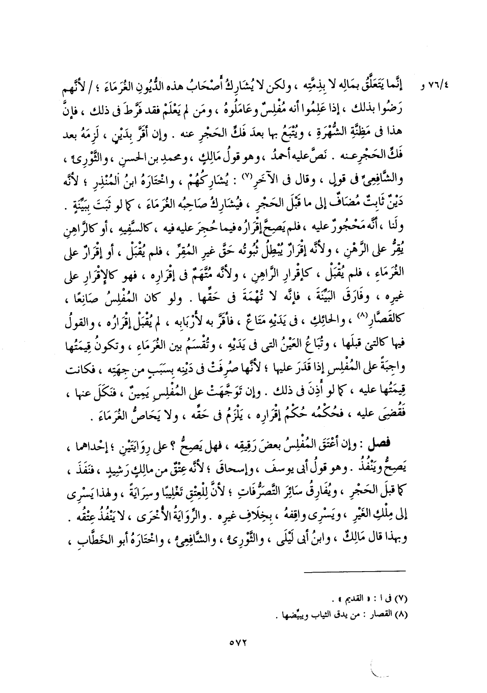 فصل: وإن أعْتَقَ المُفْلِسُ بعضَ رَقِيقِه، فهل يَصِحُّ؟ على رِوَايَتَيْنِ؛ إحْداهما، يَصِحُّ ويَنْفُذُ. وهو قولُ أبي يوسفَ، وإسحاقَ؛ لأنَّه عِتْقٌ من مالِكٍ رَشِيدٍ، فنَفَذَ، كما قبلَ الحَجْرِ، ويُفَارِقُ سَائِرَ التَّصَرُّفَاتِ؛ لأنَّ لِلْعِتْقِ تَغْلِيبًا وسِرَايَةً، ولهذا يَسْرِي إلى مِلْكِ الغَيْرِ، ويَسْرِي واقِفهُ، بِخِلَافِ غيرِه. والرِّوَايَةُ الأُخْرَى، لا يَنْفُذُ عِتْقُه. وبهذا قال مَالِكٌ، وابنُ أبي لَيْلَى، والثَّوْرِيُّ، والشَّافِعِيُّ، واخْتَارَهُ أبو الخَطَّابِ،