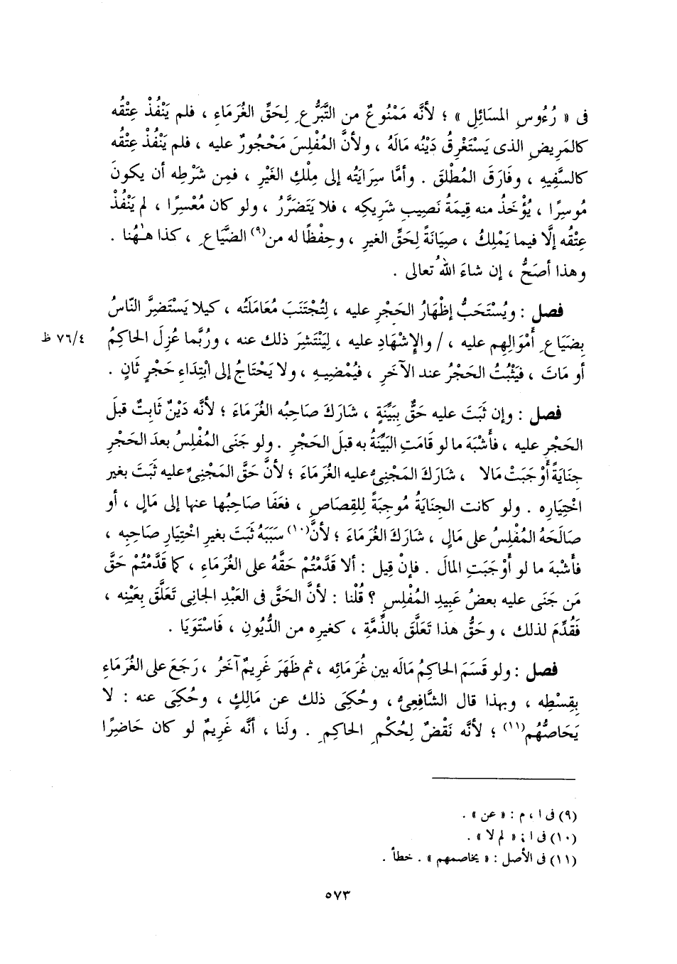 في "رُءُوسِ المسَائِلِ"؛ لأنَّه مَمْنُوعٌ من التَّبَرُّعِ لِحَقِّ الغُرَمَاءِ، فلم يَنْفُذْ عِتْقُه كالمَرِيضِ الذي يَسْتَغْرِقُ دَيْنُه مَالَهُ، ولأنَّ المُفْلِسَ مَحْجُورٌ عليه، فلم يَنْفُذْ عِتْقُه كالسَّفِيهِ، وفَارَقَ المُطْلقَ. وأمَّا سِرَايَتُه إلى مِلْكِ الغَيْرِ، فمِن شَرْطِه أن يكونَ مُوسِرًا، يُؤْخَذُ منه قِيمَةُ نَصِيبِ شَرِيكِه، فلا يَتَضَرَّرُ، ولو كان مُعْسِرًا، لم يَنْفُذْ عِتْقُه إلَّا فيما يَمْلِكُ، صِيَانَةً لِحَقِّ الغيرِ، وحِفْظًا له من (٩) الضَّيَاعِ، كذا هاهُنا. وهذا أصَحُّ، إن شاءَ اللهُ تعالى.