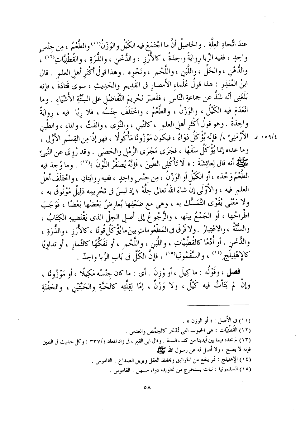 عندَ اتِّحادِ العِلَّةِ. والحاصِلُ أنَّ ما اجْتَمَعَ فيه الكَيْلُ والوَزْنُ (١١) والطَّعْمُ، مِن جِنْسٍ واحِدٍ، ففيه الرِّبا رِوايَةً واحِدَةً، كالأُرْزِ، والدُّخْنِ، والذُّرَةِ، والقُطْنِيَّاتِ (١٢)، والدُّهْنِ، والخَلِّ، واللَّبَنِ، واللَّحْمِ، ونَحْوِه. وهذا قولُ أكْثَرِ أهلِ العلمِ. قال ابنُ المُنْذِرِ: هذا قولُ عُلَماءِ الأمصارِ في القَدِيمِ والحَدِيثِ، سوى قَتادَةَ، فإنه بَلَغَنِي أنه شَذَّ عن جماعةِ النَّاسِ، فقَصَرَ تَحْرِيمَ التَّفَاضُلِ على السِّتَّةِ الأشْيَاءِ. وما انْعَدَمَ فيه الكَيْلُ، والوَزْنُ، والطَّعْمُ، واخْتَلَفَ جِنْسُه، فلا رِبًا فيه، رِوايَةً واحِدَةً. وهو قولُ أكْثَرِ أهلِ العلمِ، كالتِّينِ، والنَّوَى، والقَتِّ، والماءِ، والطِّينِ الأرْمَنِيِّ، فإنّه يُؤْكَلُ دَوَاءً، فيكون مَوْزُونًا مَأكُولًا، فهو إذًا مِن القِسْمِ الأوَّلِ، وما عداه إنما يُؤْكَلُ سَفَهًا، فجَرَى مَجْرَى الرَّمْلِ والحَصَى. وقد رُوِيَ عن النَّبيِّ -صَلَّى اللهُ عَلَيْهِ وَسَلَّمَ- أنه قال لِعائِشَةَ: "لَا تَأْكُلِي الطِّينَ، فَإنَّهُ يُصَفِّرُ اللَّوْنَ" (١٣). وما وُجِدَ فيه الطَّعْمُ وَحْدَه، أو الكَيْلُ أو الوَزْنُ، مِن جِنْسٍ واحِدٍ، ففيه رِوايَتانِ، واخْتَلَفَ أهلُ العلمِ فيه، والأوْلَى إنْ شاءَ اللهُ تعالى حِلُّهُ؛ إذ ليسَ في تَحْرِيمِه دَلِيلٌ مُوْثُوقٌ به، ولا مَعْنًى يُقَوِّى التَّمَسُّكَ به، وهي مع ضَعْفِها يُعارِضُ بَعْضُها بَعْضًا، فوَجَبَ اطِّراحُها، أو الجَمْعُ بينَها، والرُّجُوعُ إلى أصلِ الحِلِّ الذي يَقْتَضِيهِ الكِتَابُ، والسُّنَّةُ، والاعْتِبارُ. ولا فَرْقَ في المَطْعُوماتِ بينَ ما يُؤْكَلُ قُوتًا، كالأُرْزِ، والذُّرَةِ، والدُّخْنِ، أو أُدْمًا كالقُطْنِيَّاتِ، واللَّبَنِ، واللَّحْمِ، أو تَفَكُّهًا كالثِّمارِ، أو تداوِيًا كالإهْلِيلَجِ (١٤)، والسَّقَمُونْيا (١٥)، فإنَّ الكُلَّ في بَابِ الرِّبا واحِدٌ.