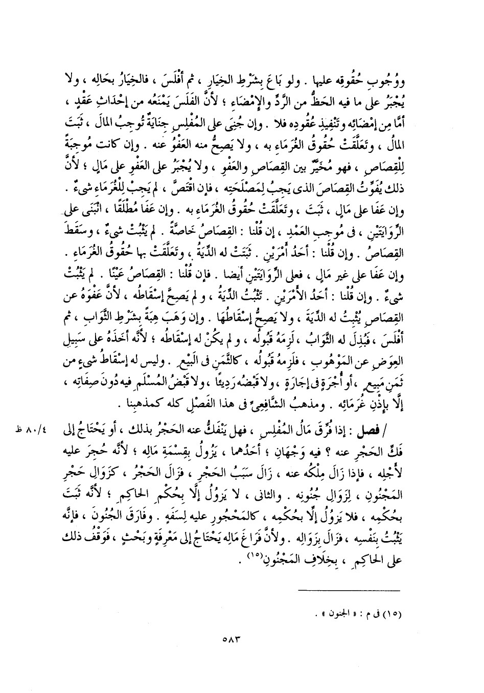 فصل: إذا فُرِّقَ مَالُ المُفْلِسِ، فهل يَنْفَكُّ عنه الحَجْرُ بذلك، أو يَحْتَاجُ إلى فَكِّ الحَجْرِ عنه؟ فيه وَجْهَانِ؛ أحَدُهما، يَزُولُ بِقِسْمَةِ مَالِه؛ لأنَّه حُجِرَ عليه لأجْلِه، فإذا زَالَ مِلْكُه عنه، زَالَ سَبَبُ الحَجْرِ، فزَالَ الحَجْرُ، كزَوَالِ حَجْرِ المَجْنُونِ، لِزَوَالِ جُنُونِه. والثاني، لا يَزُولُ إلَّا بِحُكْمِ الحاكِمِ؛ لأنَّه ثَبَتَ بحُكْمِه، فلا يَزُولُ إلَّا بحُكْمِه، كالمَحْجُورِ عليه لِسَفَهٍ. وفَارَقَ الجُنُونَ، فإنَّه يَثْبُتُ بِنَفْسِه، فزَالَ بِزَوَالِه. ولأنَّ فَرَاغَ مَالِه يَحْتَاجُ إلى مَعْرِفَةٍ وبَحْثٍ، فَوَقْفُ ذلك على الحاكِمِ، بِخِلَافِ المَجْنُونِ (١٥).