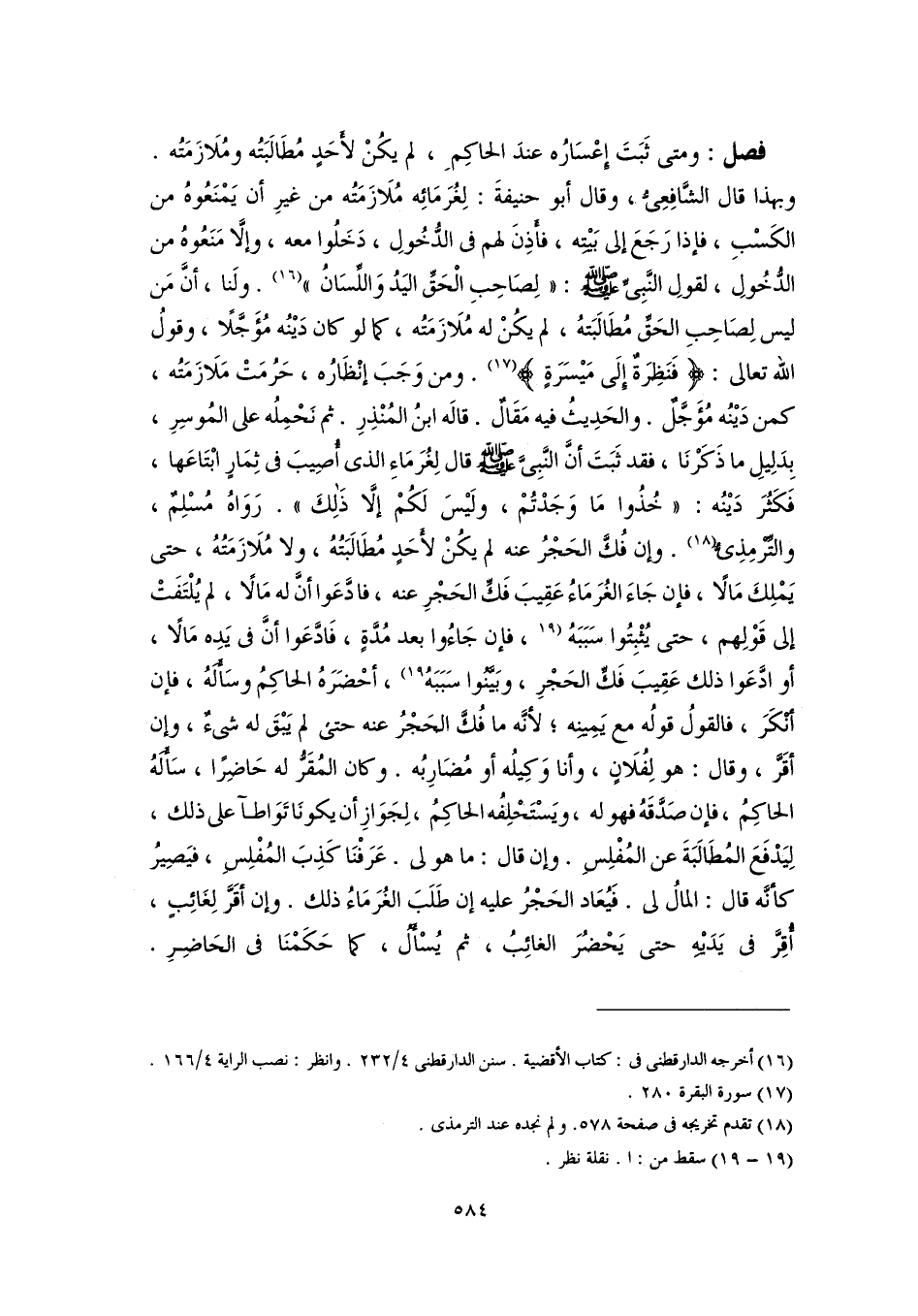 فصل: ومتى ثَبَتَ إعْسَارُهُ عندَ الحاكِمِ، لم يكُنْ لأحَدٍ مُطَالَبَتُه ومُلَازَمَتُه. وبهذا قال الشَّافِعِيُّ، وقال أبو حنيفةَ: لِغُرَمَائِه مُلَازَمَتُه من غيرِ أن يَمْنَعُوهُ من الكَسْبِ، فإذا رَجَعَ إلى بَيْتِه، فأذِنَ لهم في الدُّخُولِ، دَخَلُوا معه، وإلَّا مَنَعُوهُ من الدُّخُولِ، لقولِ النَّبِيِّ -صَلَّى اللهُ عَلَيْهِ وَسَلَّمَ-: "لِصَاحِبِ الْحَقِّ اليَدُ وَاللِّسَانُ" (١٦). ولَنا، أنَّ مَن ليس لِصَاحِبِ الحَقِّ مُطَالَبَتهُ، لم يكُنْ له مُلَازَمَتُه، كما لو كان دَيْنُه مُؤَجَّلًا، وقولُ اللَّه تعالى: {فَنَظِرَةٌ إلَى مَيْسَرَةٍ} (١٧). ومن وَجَبَ إنْظَارُه، حَرُمَتْ مَلَازَمَتُه، كمن دَيْنُه مُؤَجَّلٌ. والحَدِيثُ فيه مَقَالٌ. قالَه ابنُ المُنْذِرِ. ثم نَحْمِلُه على المُوسِرِ، بِدَلِيلِ ما ذَكَرْنَا، فقد ثَبَتَ أنَّ النَّبِيَّ -صَلَّى اللهُ عَلَيْهِ وَسَلَّمَ- قال لِغُرَمَاءِ الذي أُصِيبَ في ثِمَارٍ ابْتَاعَها، فَكَثُرَ دَيْنُه: "خُذُوا مَا وَجَدْتُمْ، ولَيْسَ لَكُمْ إلَّا ذَلِكَ". رَوَاهُ مُسْلِمٌ، والتِّرْمِذِيُّ (١٨). وإن فُكَّ الحَجْرُ عنه لم يكُنْ لأحَدٍ مُطَالَبَتُهُ، ولا مُلَازَمَتُهُ، حتى يَمْلِكَ مَالًا، فإن جَاءَ الغُرَمَاءُ عَقِيبَ فَكِّ الحَجْرِ عنه، فادَّعَوا أنَّ له مَالًا، لم يُلْتَفَتْ إلى قَوْلِهم، حتى يُثْبِتُوا سَبَبَهُ [فإن جَاءُوا بعد مُدَّةٍ، فَادَّعَوا أنَّ في يَدِه مَالًا، أو ادَّعَوا ذلك عَقِيبَ فَكِّ الحَجْرِ، وبَيَّنُوا سَبَبَهُ] (١٩)، أحْضَرَهُ الحاكِمُ وسَأَلَهُ، فإن أنْكَرَ، فالقولُ قولُه مع يَمِينِه؛ لأنَّه ما فُكَّ الحَجْرُ عنه حتَّى لم يَبْقَ له شيءٌ، وإن أقَرَّ، وقال: هو لِفُلَانٍ، وأنا وَكِيلُه أو مُضَارِبُه. وكان المُقَرُّ له حَاضِرًا، سَأَلَهُ الحاكِمُ، فإن صَدَّقَهُ فهو له، ويَسْتَحْلِفُه الحاكِمُ، لِجَوَازِ أن يكونَا تَوَاطآ على ذلك، لِيَدْفَعَ المُطَالَبَةَ عن المُفْلِسِ. وإن قال: ما هو لي. عَرَفْنَا كَذِبَ المُفْلِسِ، فيَصِيرُ كأنَّه قال: المالُ لي. فَيُعَاد الحَجْرُ عليه إن طَلَبَ الغُرَمَاءُ ذلك. وإن أقَرَّ لِغَائِبٍ، أُقِرَّ في يَدَيْهِ حتى يَحْضُرَ الغائِبُ، ثم يُسْأَلُ، كما حَكَمْنَا في الحَاضِرِ.